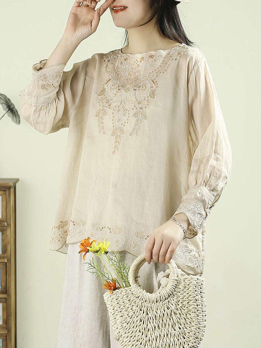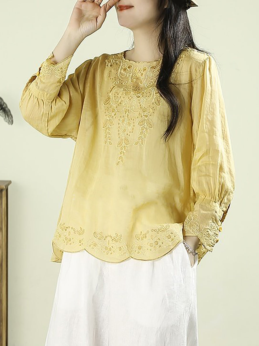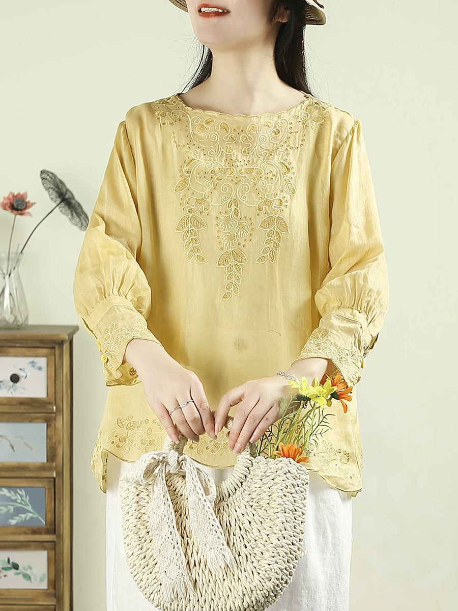 Blusa de mujer con cuello redondo, 100 % ramio y bordado artístico de primavera