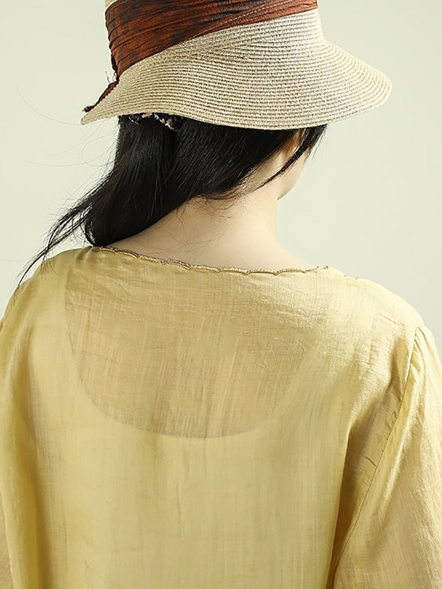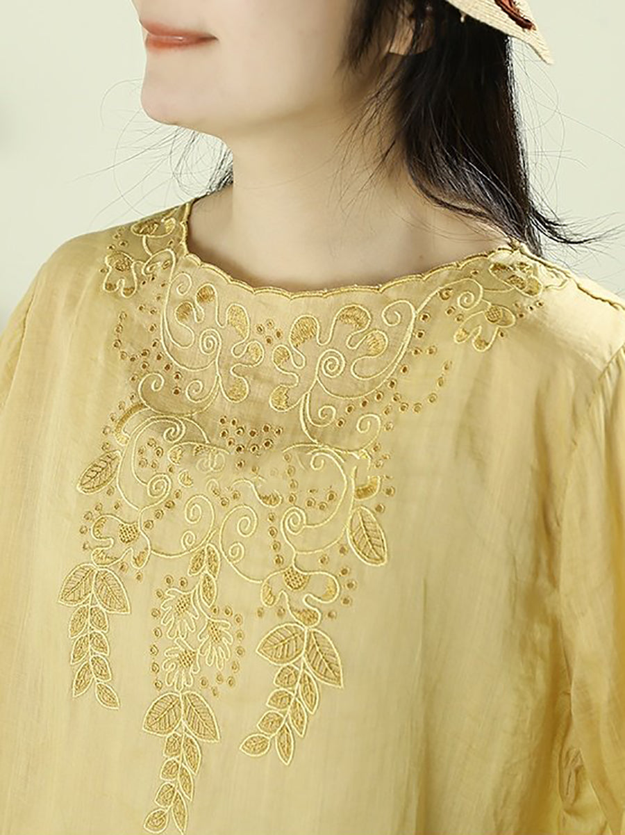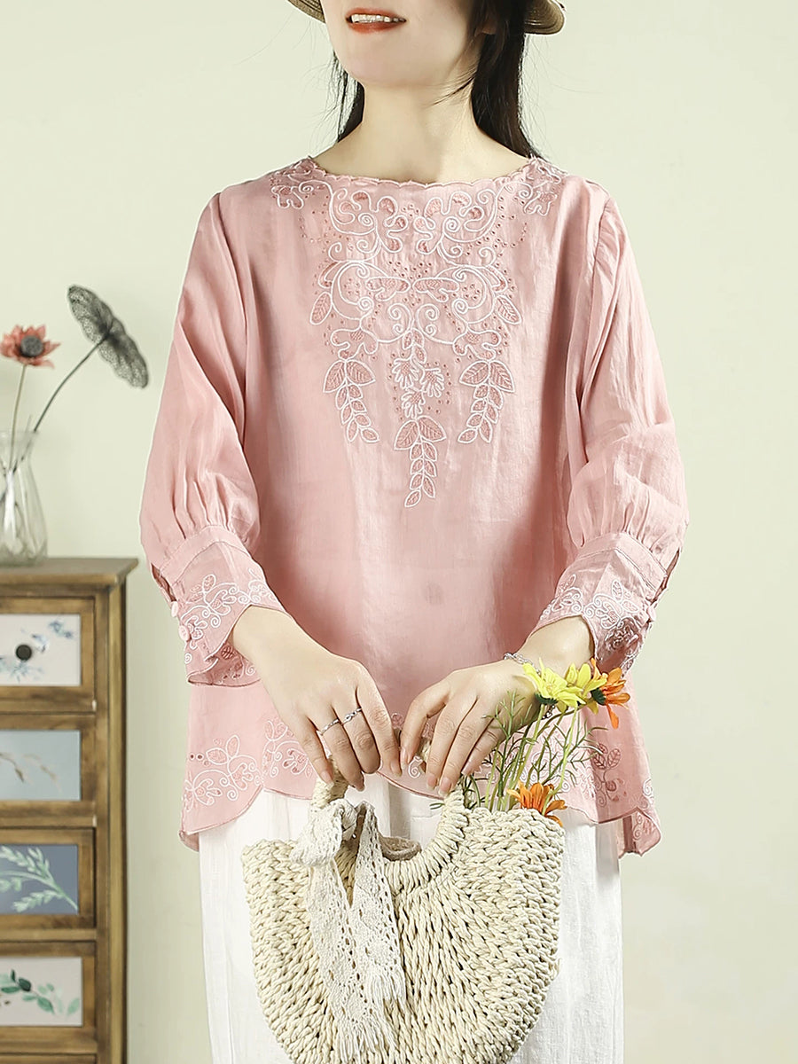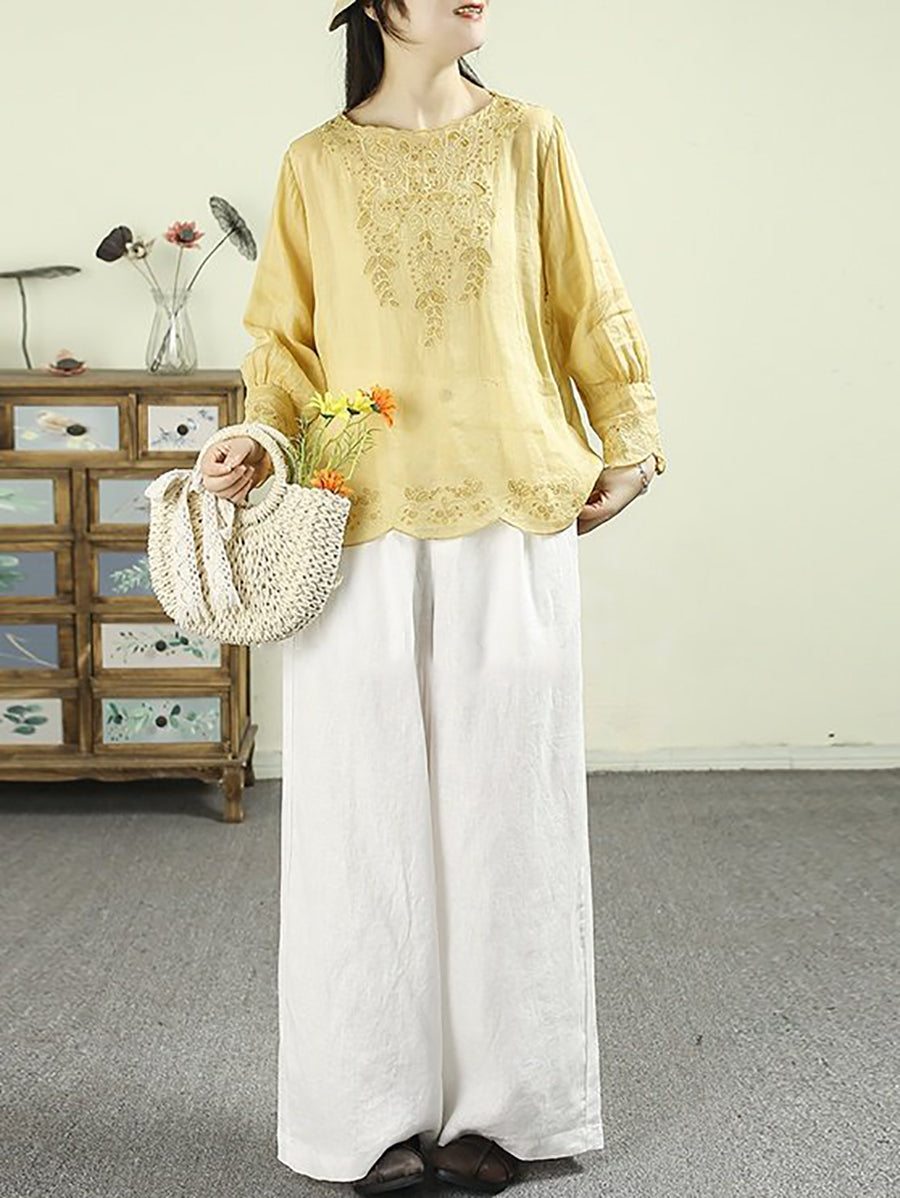 Blusa de mujer con cuello redondo, 100 % ramio y bordado artístico de primavera
