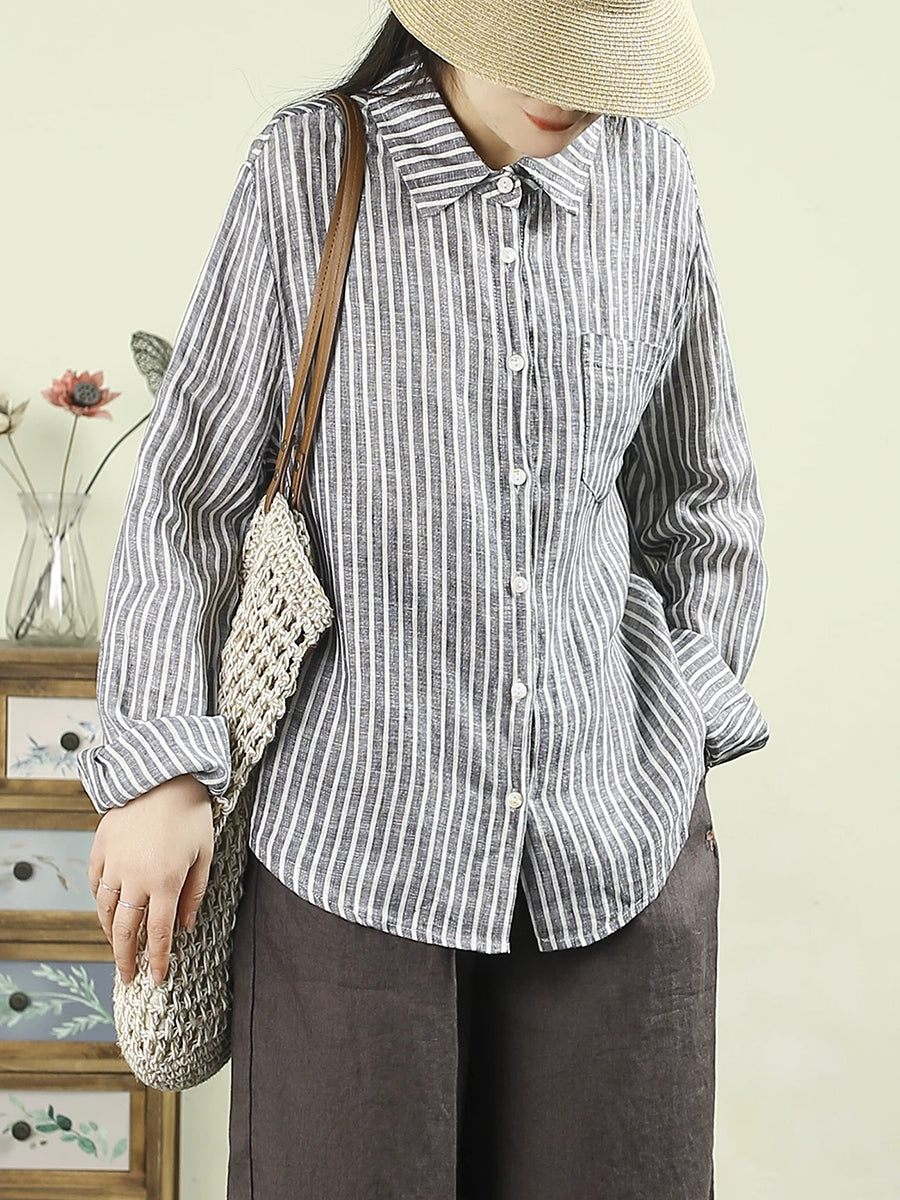 Camisa de mujer con cuello vuelto, 100 % lino y rayas Artsy Spring