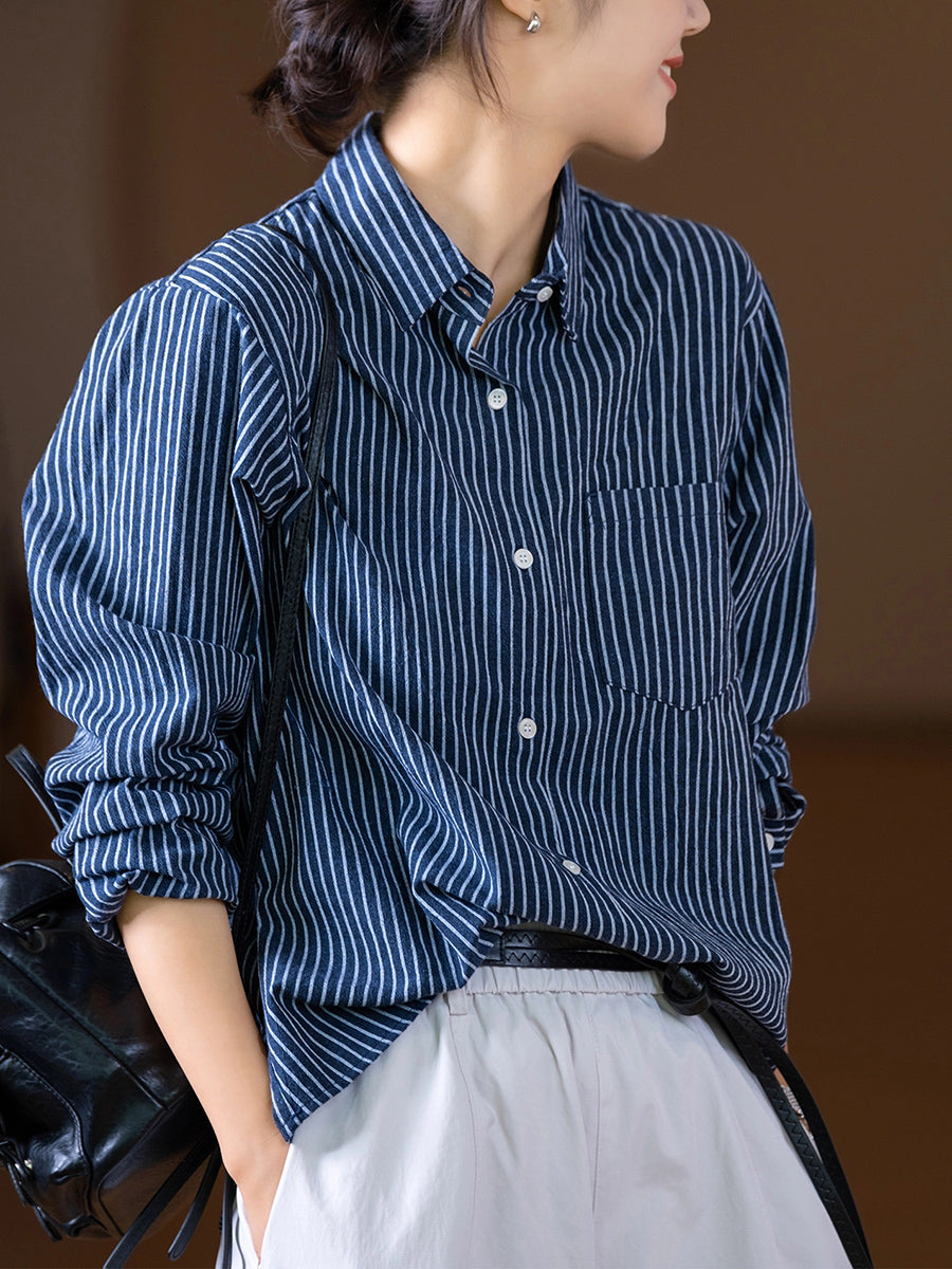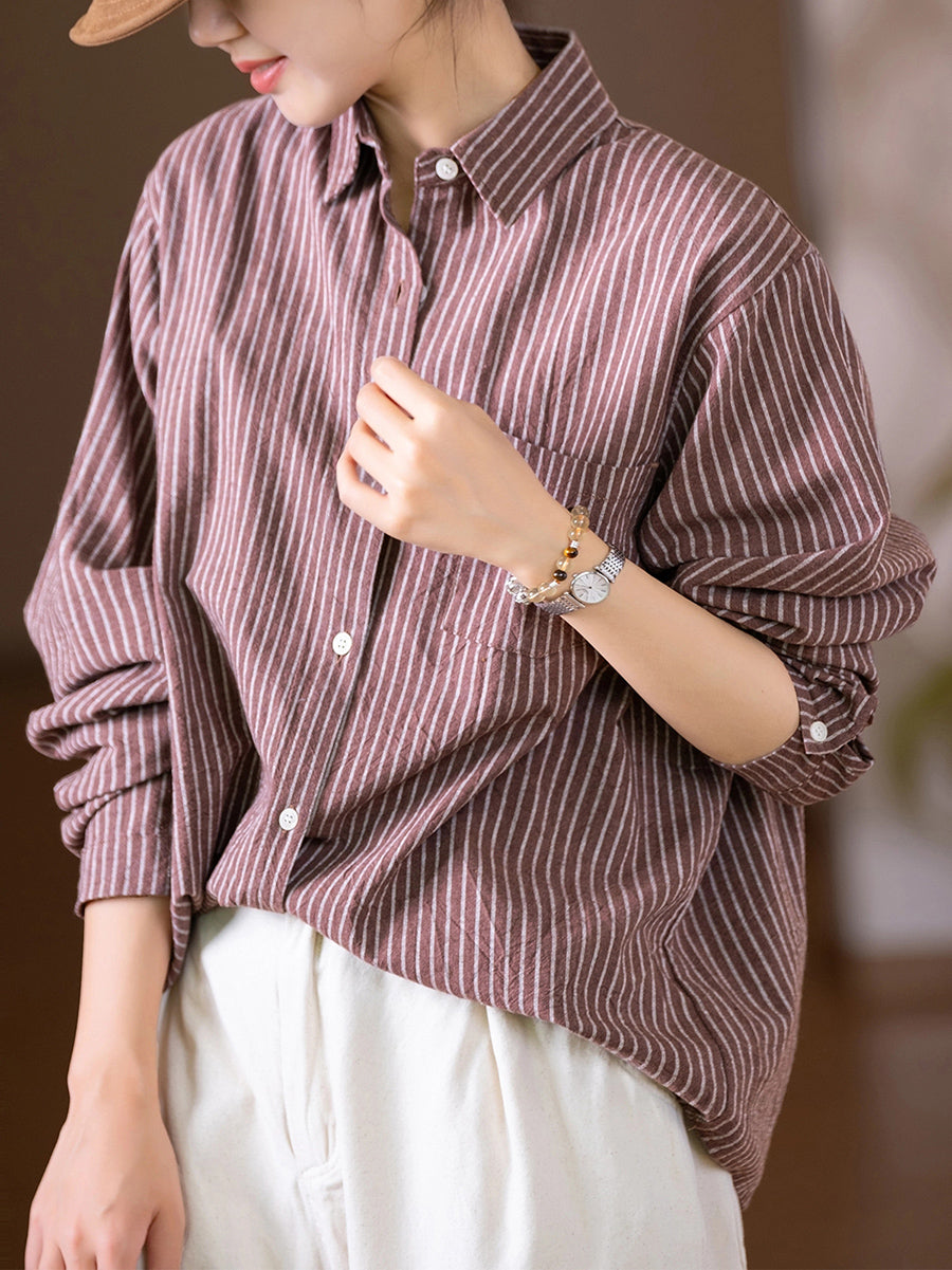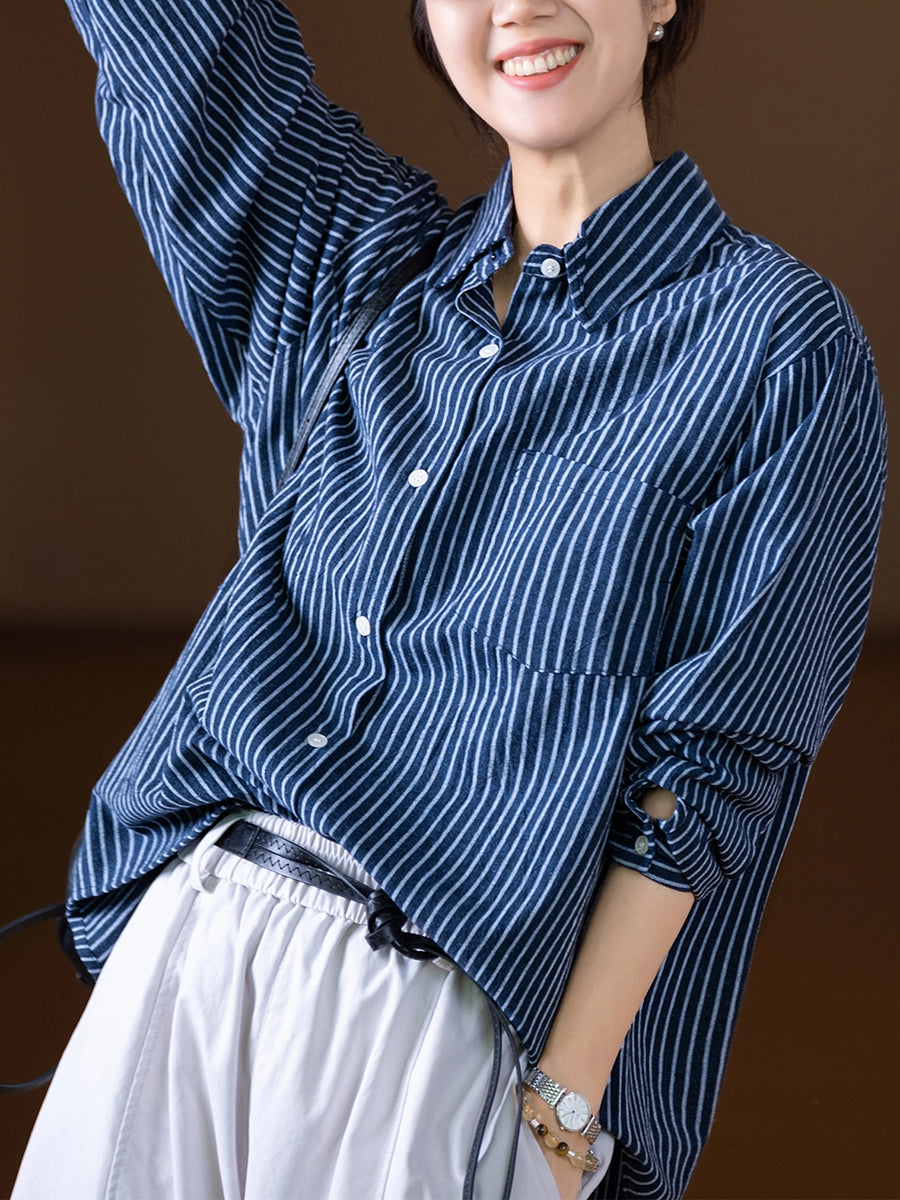 Camisa de mujer 100 % algodón con cuello vuelto y rayas de otoño
