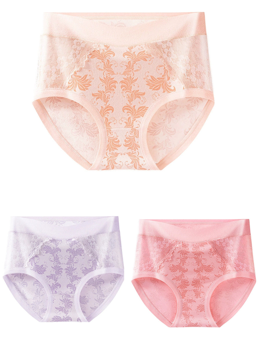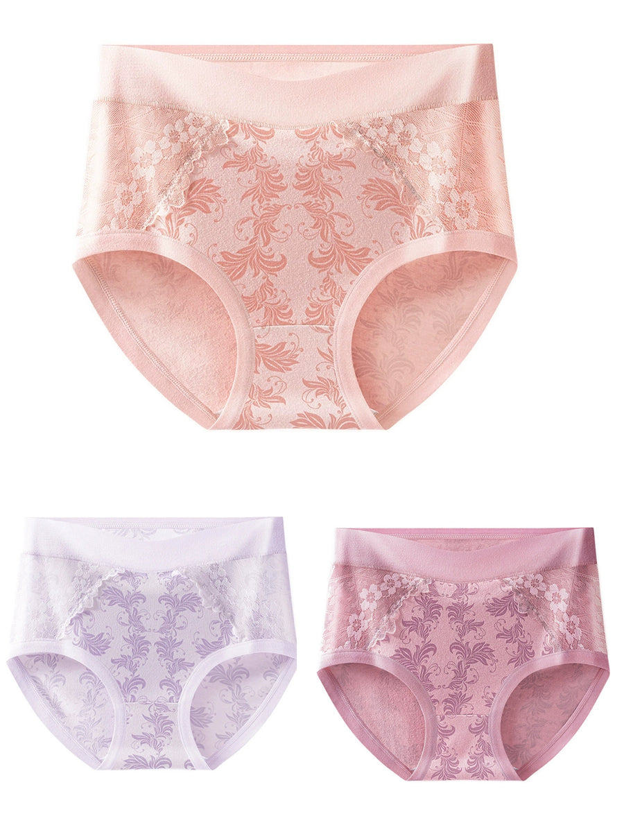 3 piezas de ropa interior de cintura alta con encaje floral artístico para mujer