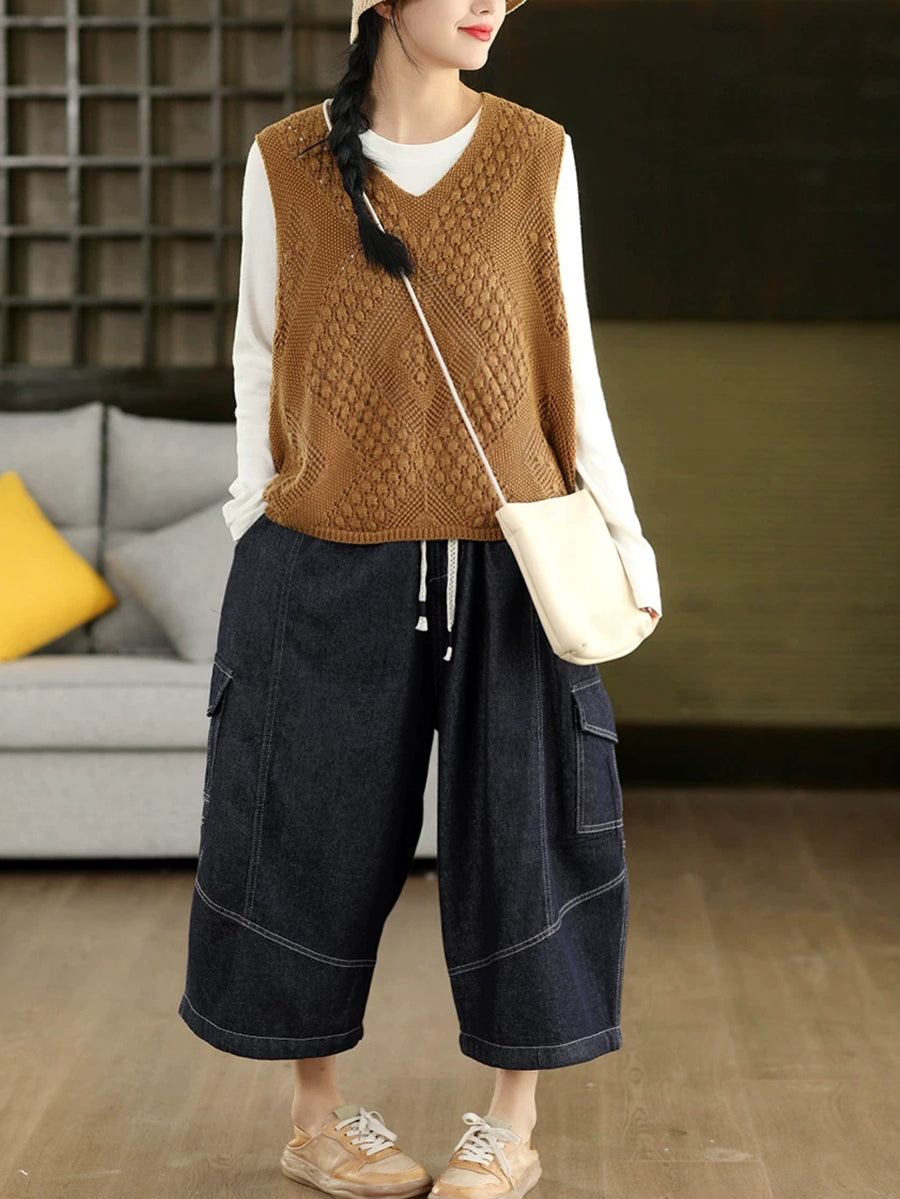 Confeccionado con una mezcla cuidadosamente equilibrada de 45 % algodón y 55 % acrílico, este chaleco de punto ofrece comodidad y durabilidad. Su distintiva silueta de cuello en V se combina con una estética artística, lo que lo convierte en una prenda ideal para combinar con otras prendas en temporadas de transición. Perfecta para primavera y otoño, esta versátil prenda combina un estilo informal y refinado con una sofisticación discreta.