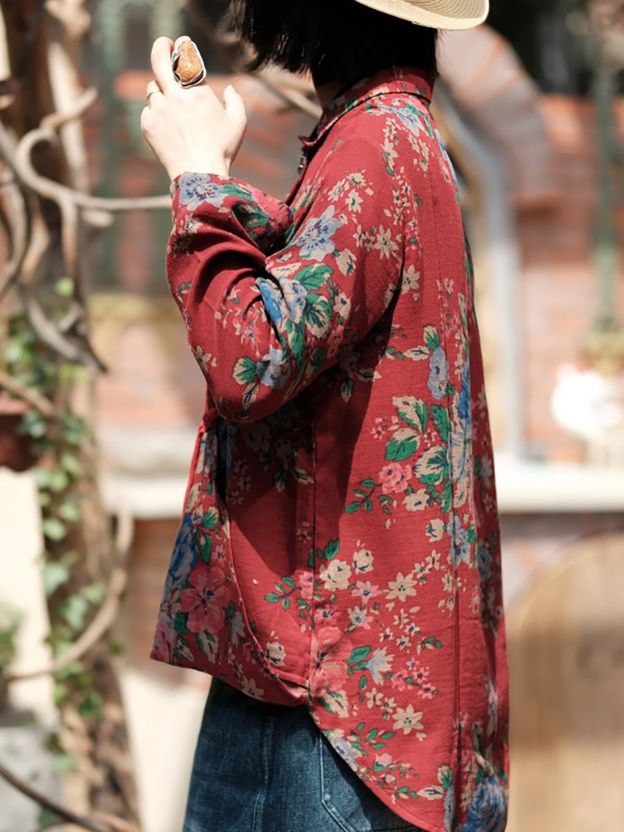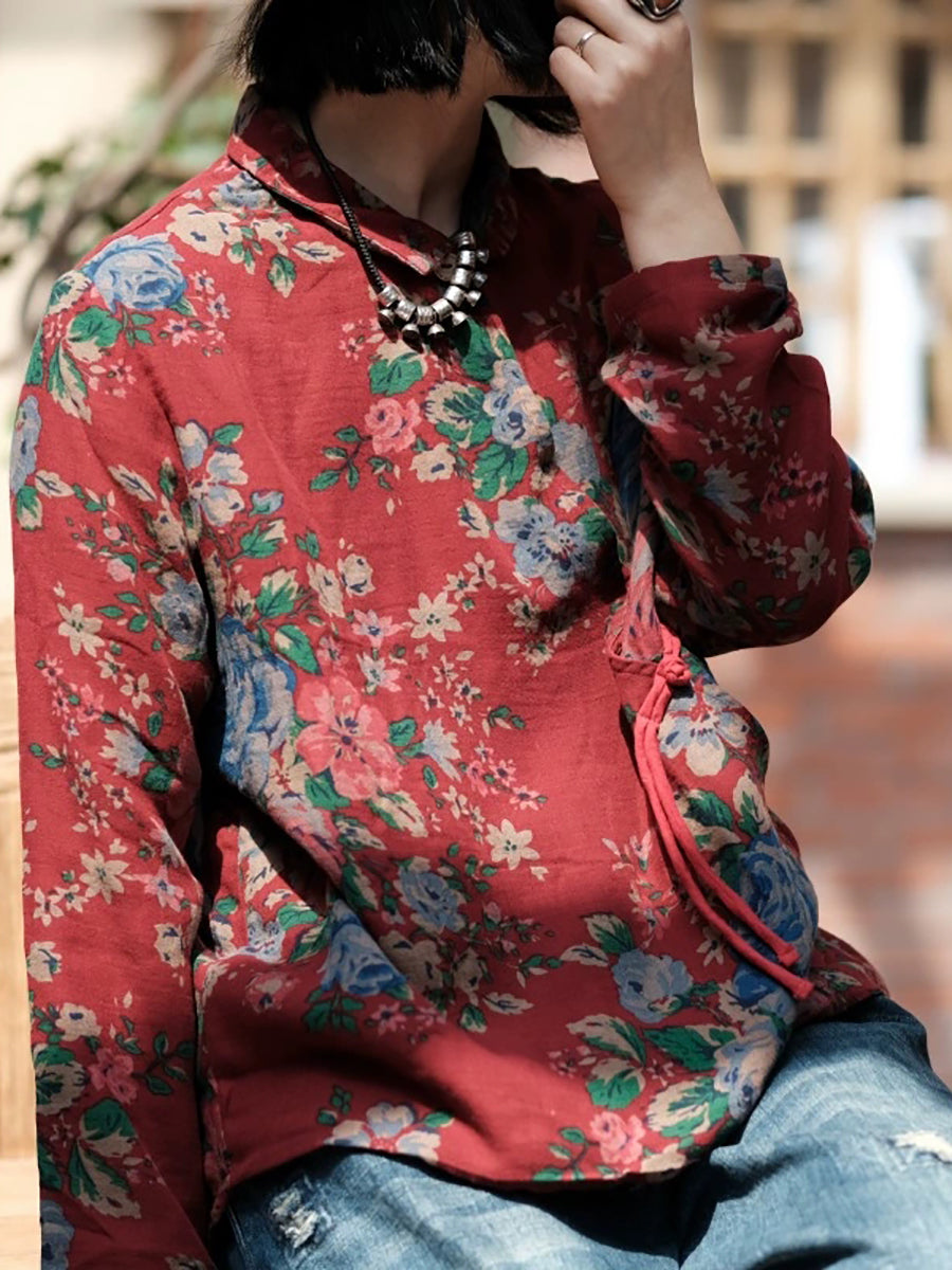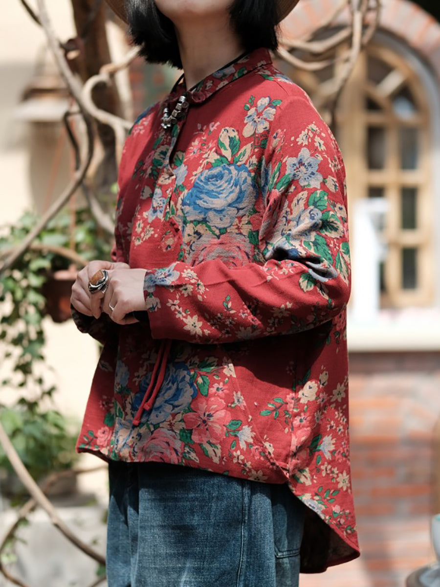 Camisa de mujer 100 % algodón con cuello vuelto y estampado floral vintage de primavera