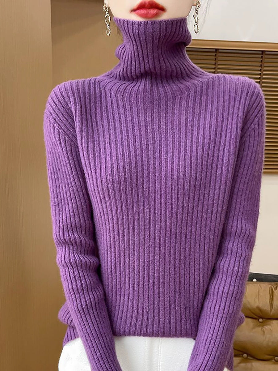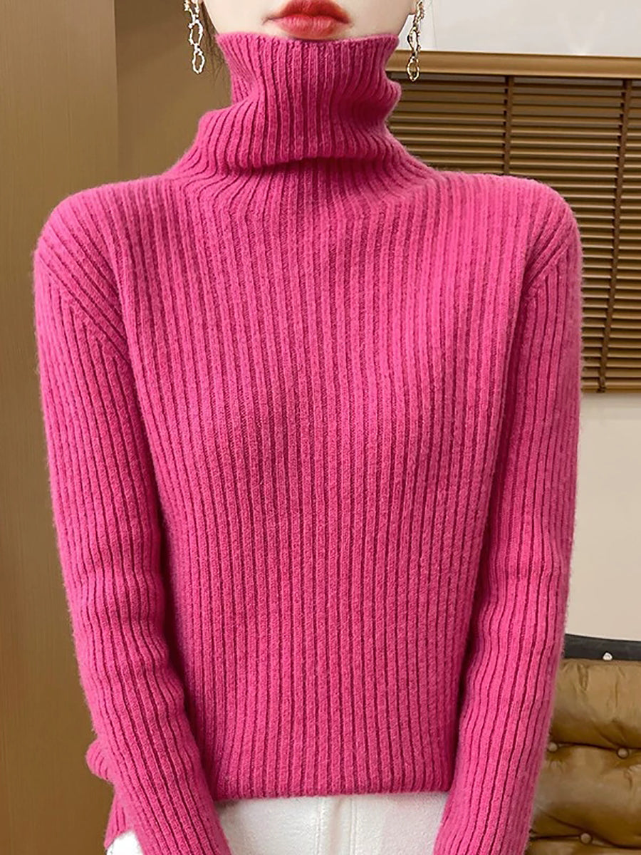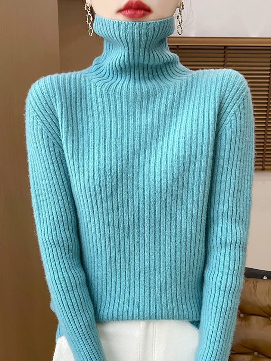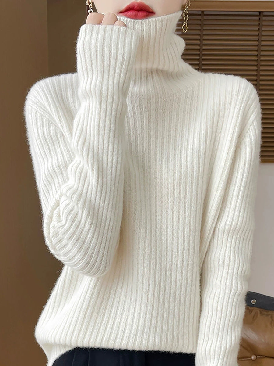 Suéter de lana de cuello alto de color puro informal de primavera para mujer