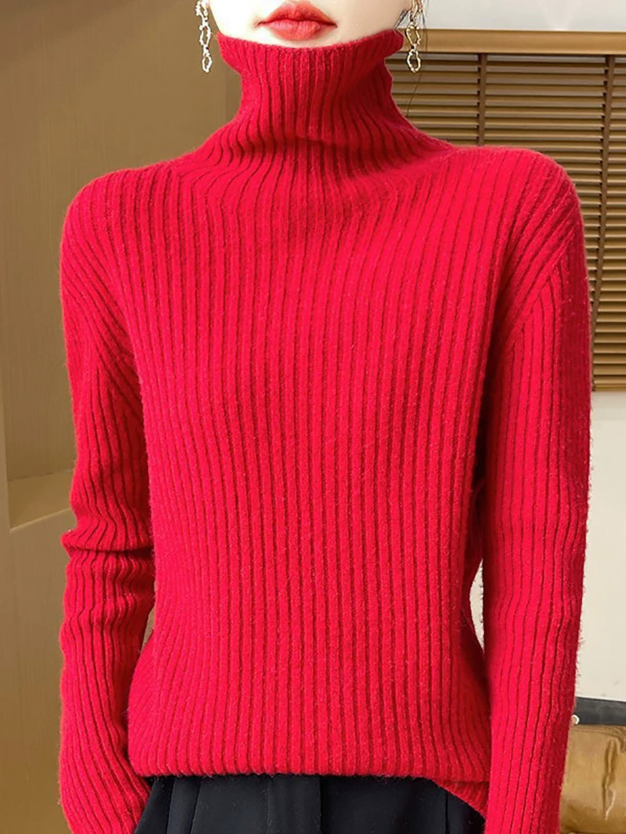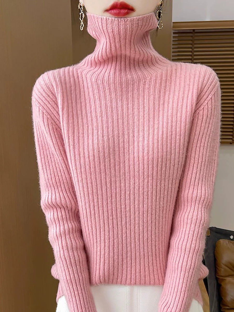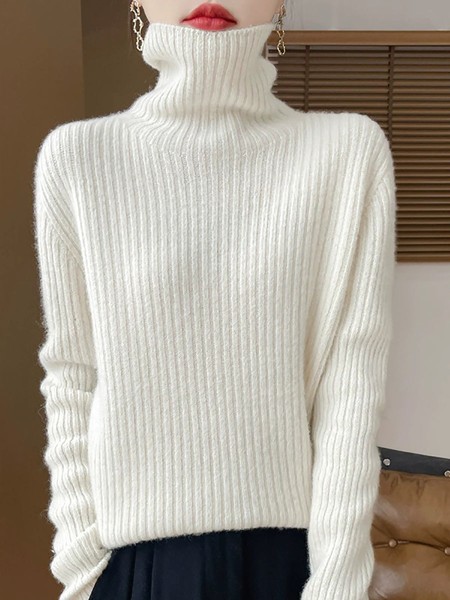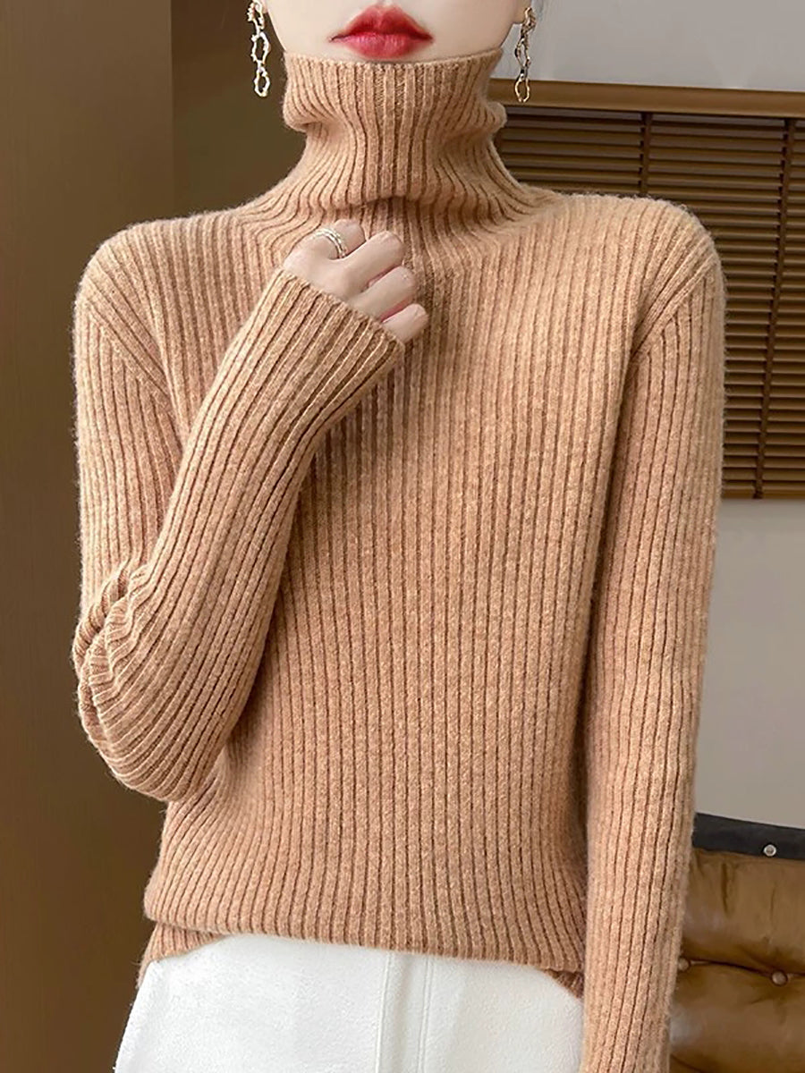 Suéter de lana de cuello alto de color puro informal de primavera para mujer