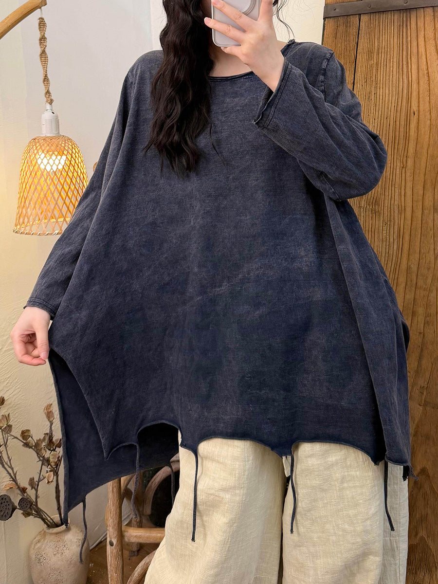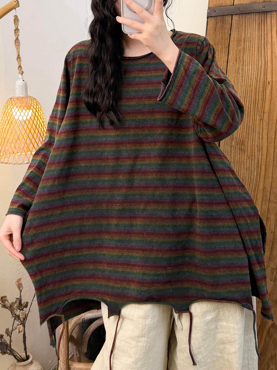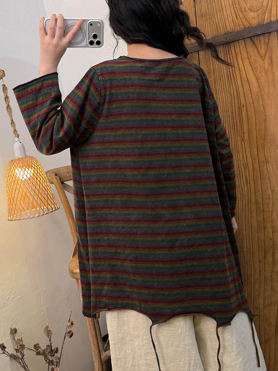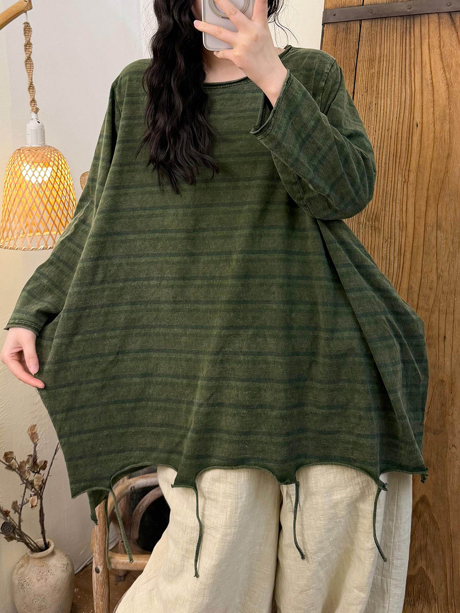 Blusa de algodón con cuello redondo y borlas en el dobladillo con rayas retro de primavera para mujer
