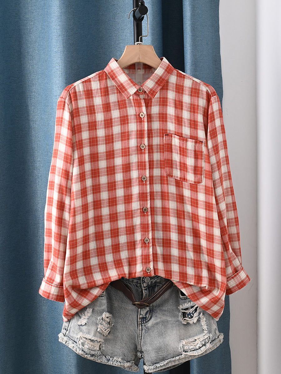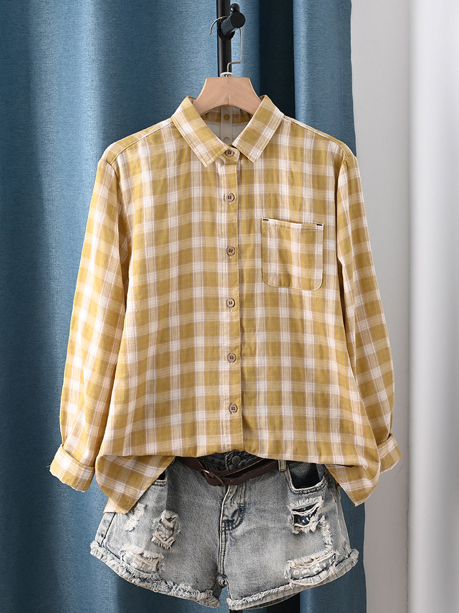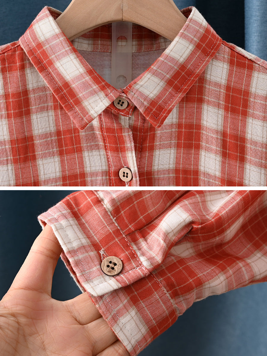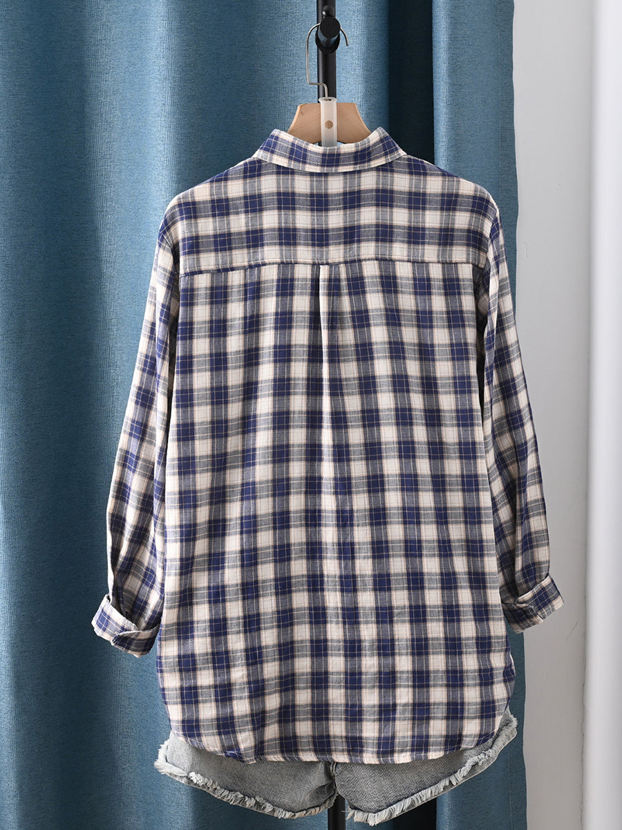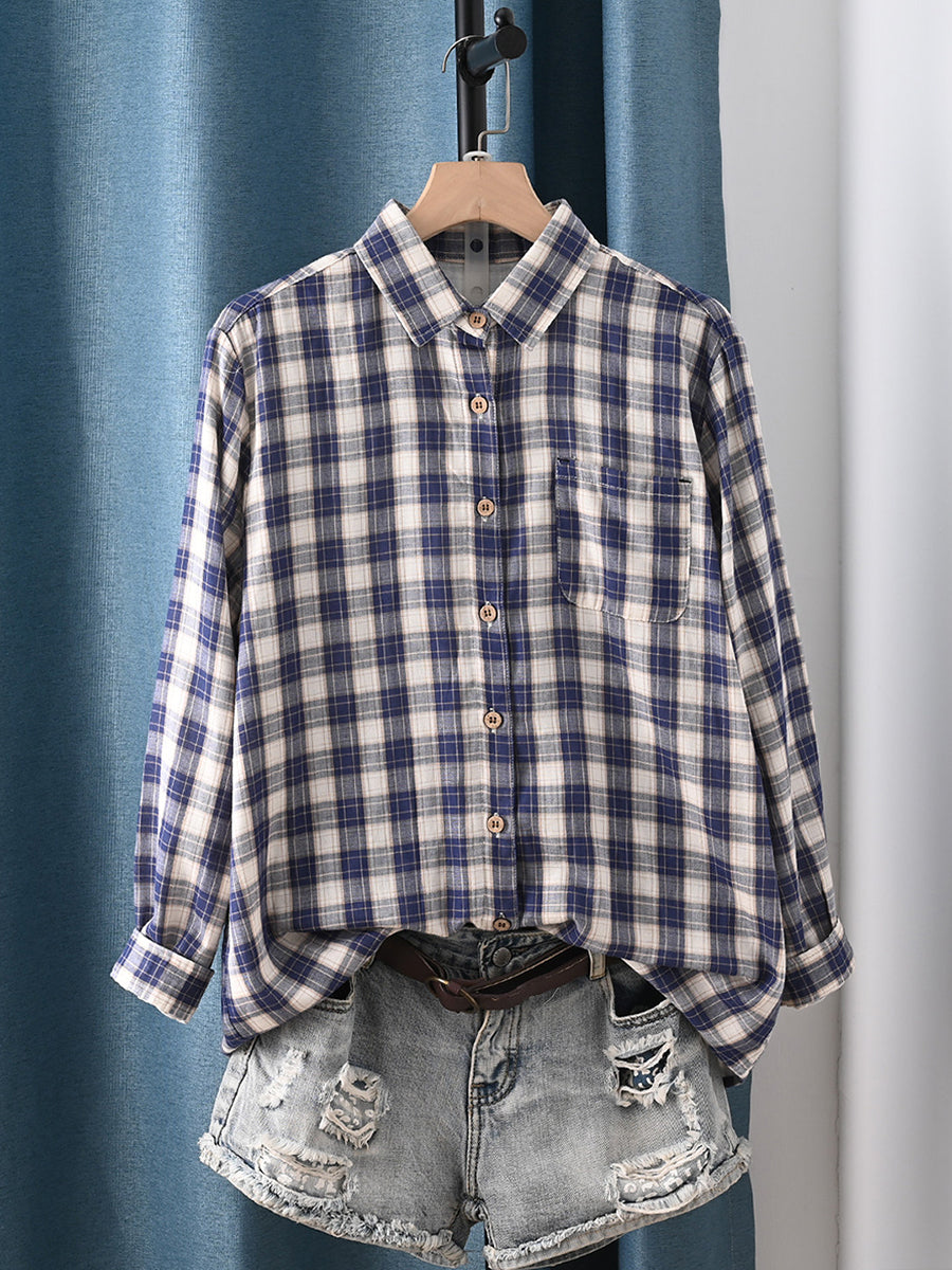 Camisa de algodón 100 % con cuello vuelto y estampado artístico de cuadros para mujer, primavera