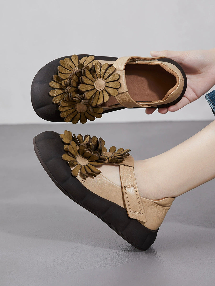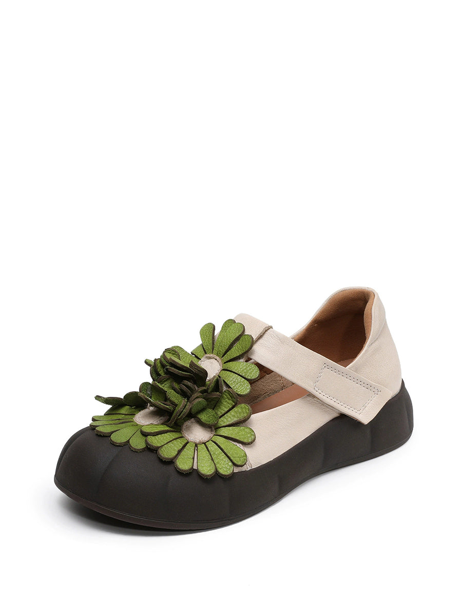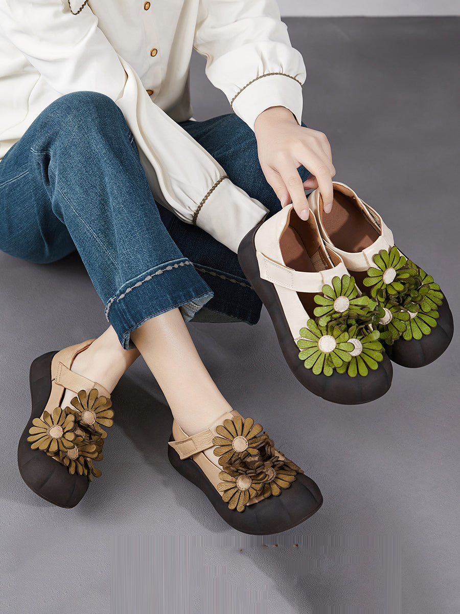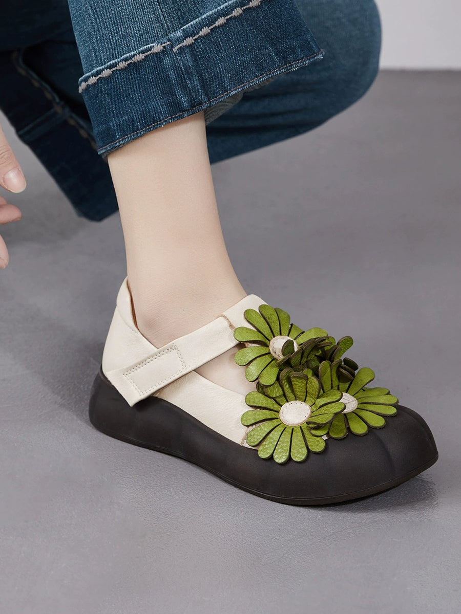 Zapatos retro de verano con flores de piel auténtica para mujer