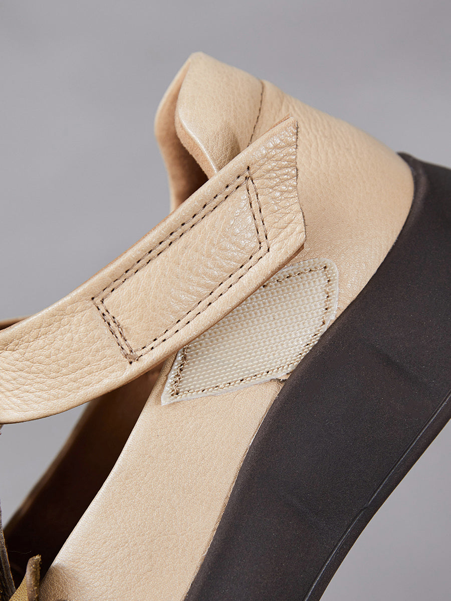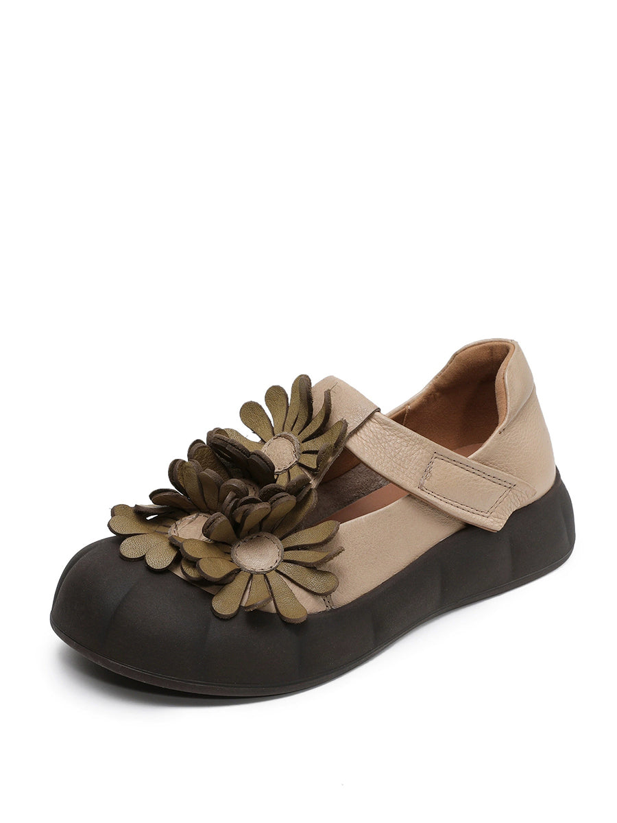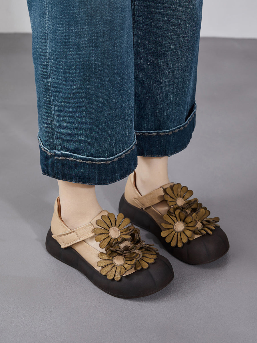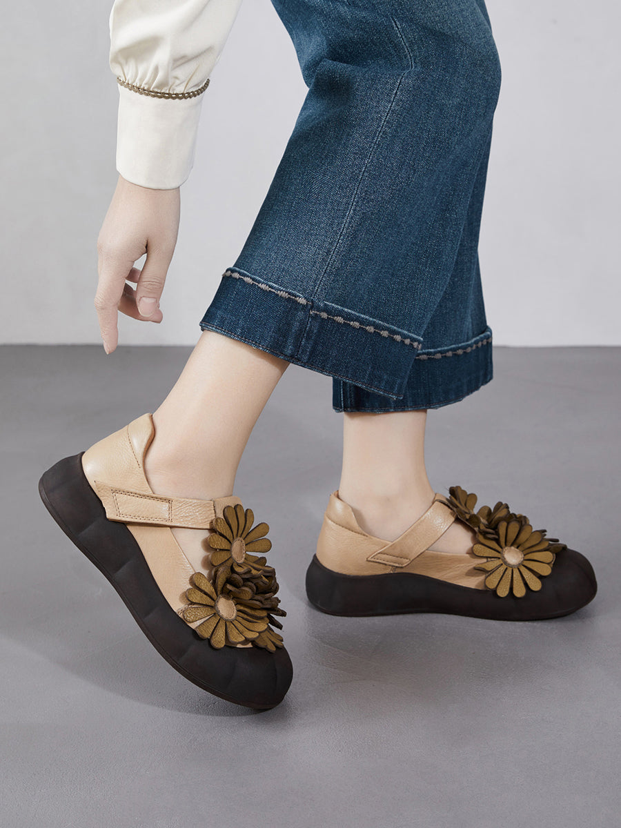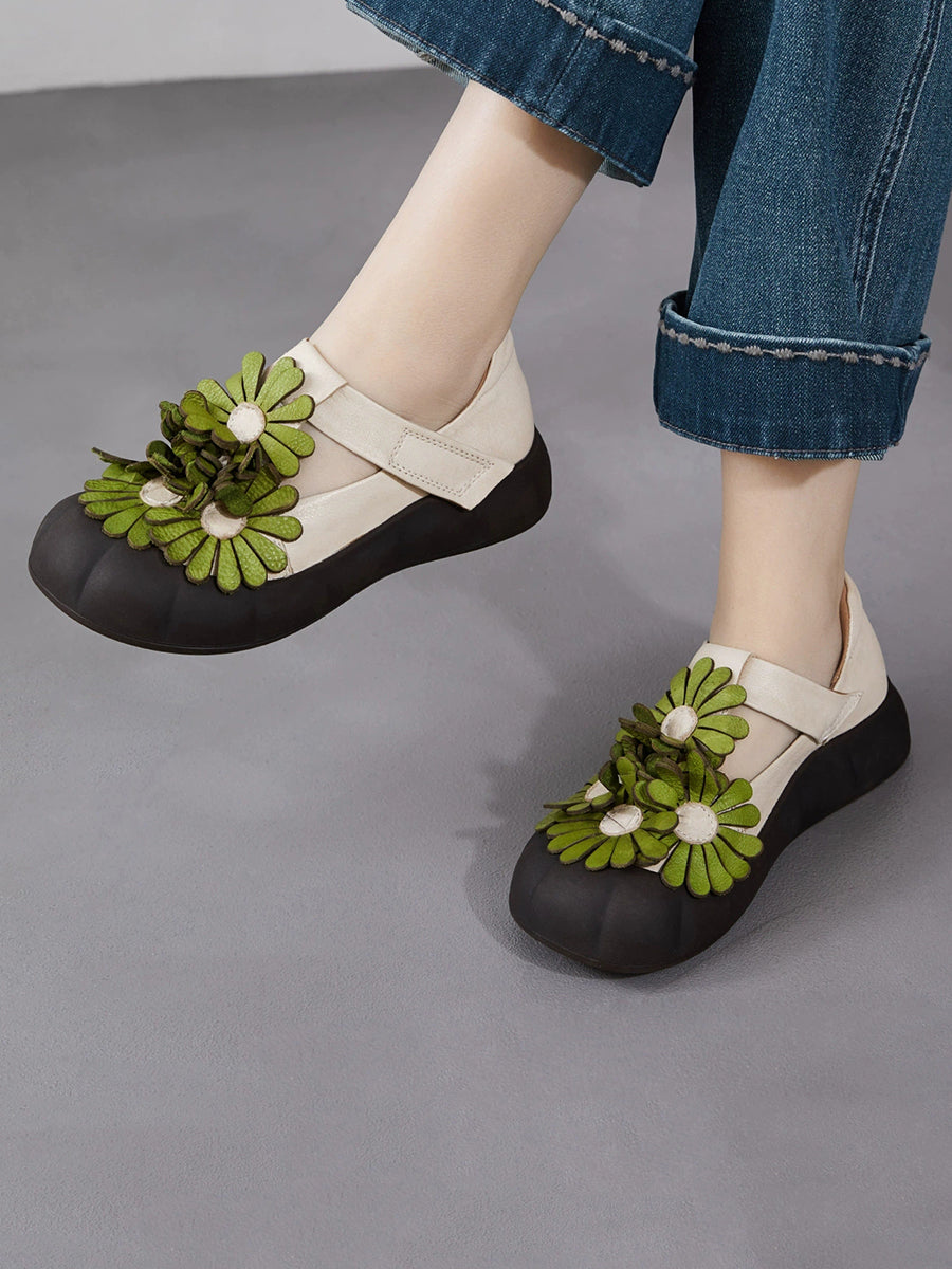 Zapatos retro de verano con flores de piel auténtica para mujer