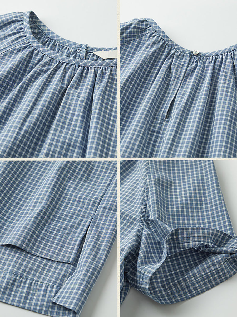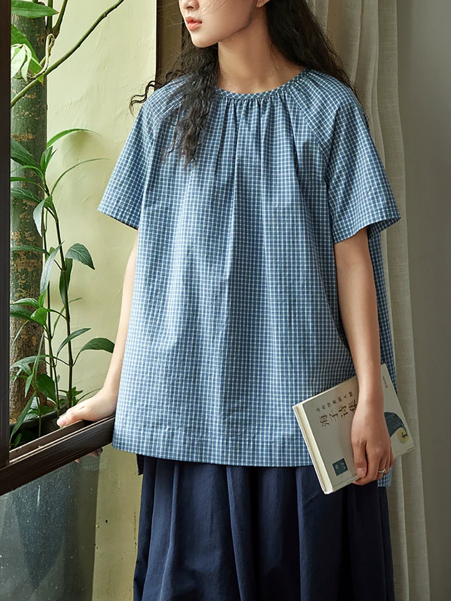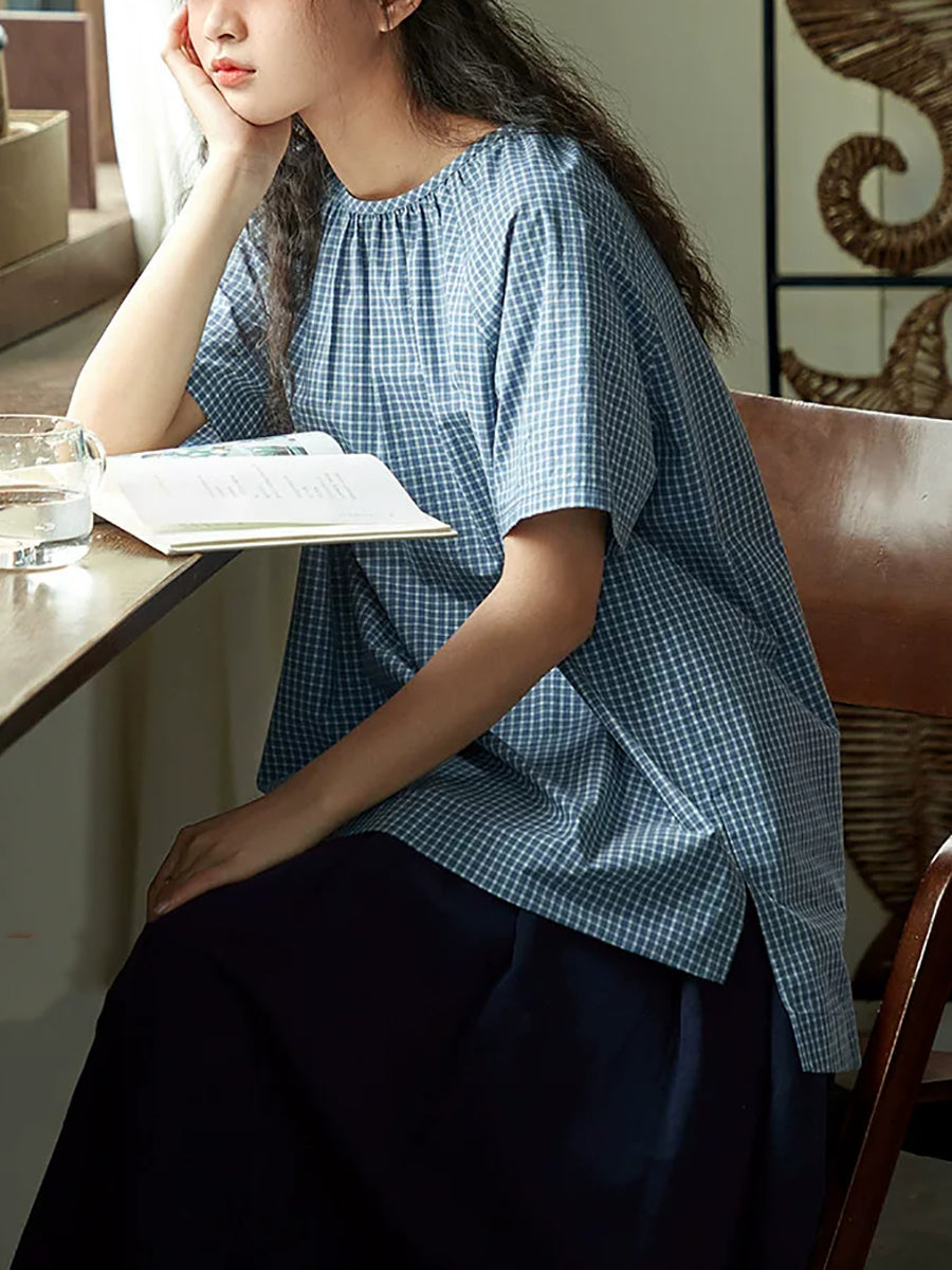 Blusa de algodón con cuello redondo y cuadros artísticos de primavera para mujer