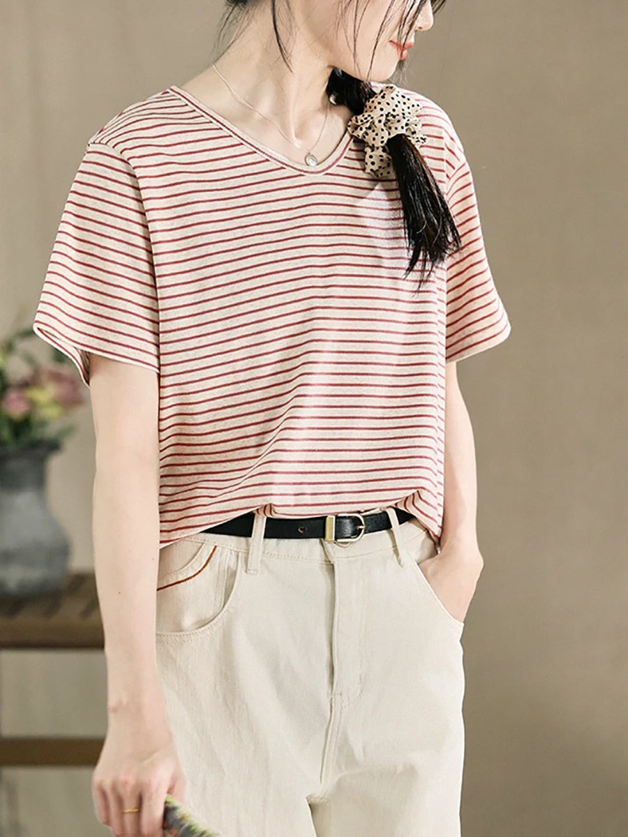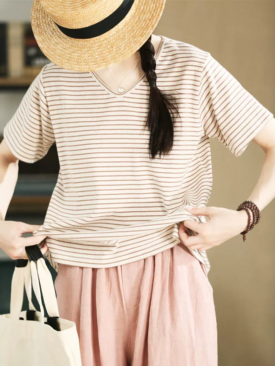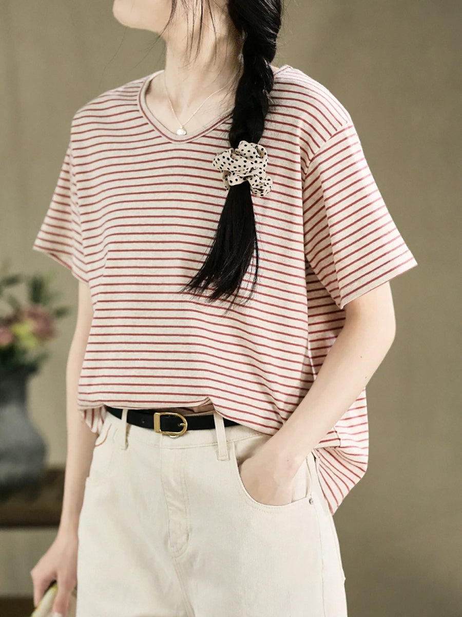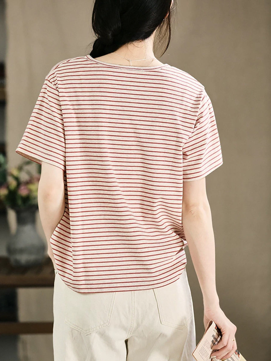 Camisa de verano para mujer, 100 % algodón, con cuello redondo y rayas