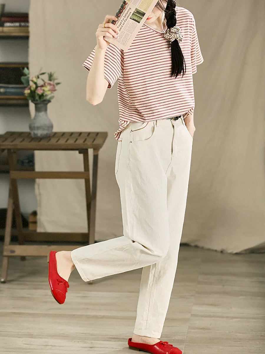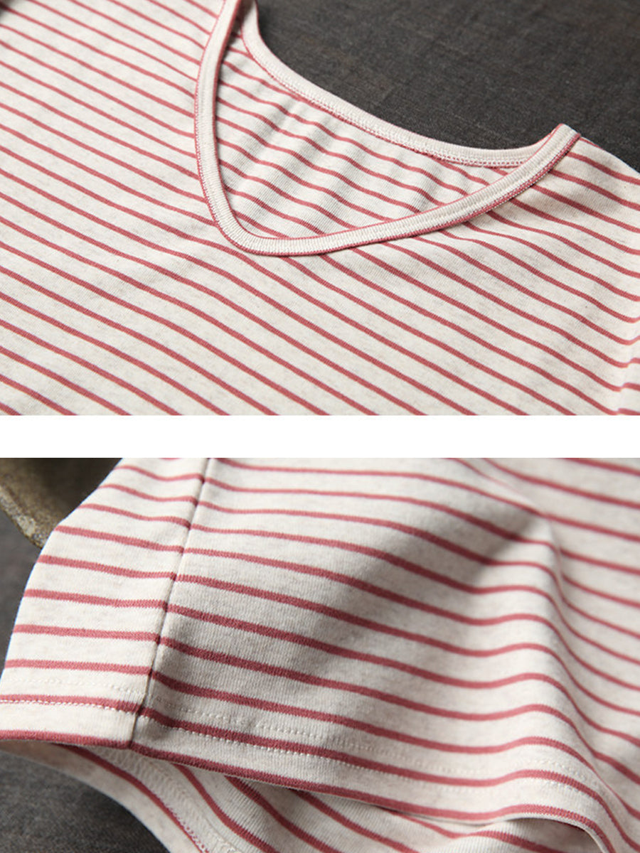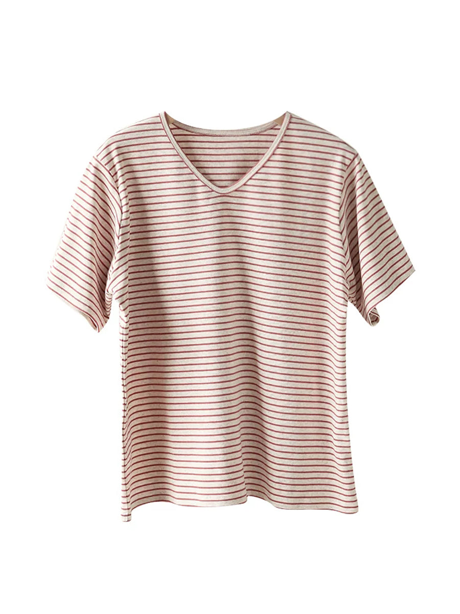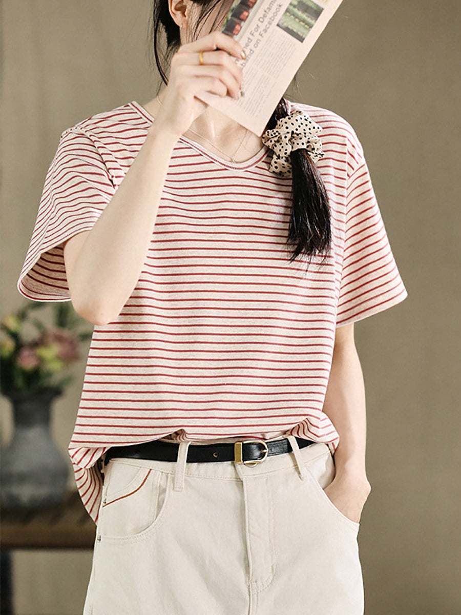 Camisa de verano para mujer, 100 % algodón, con cuello redondo y rayas