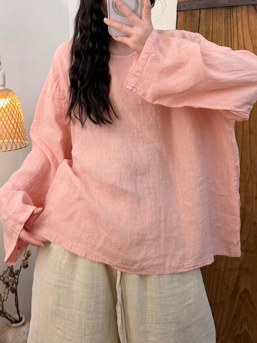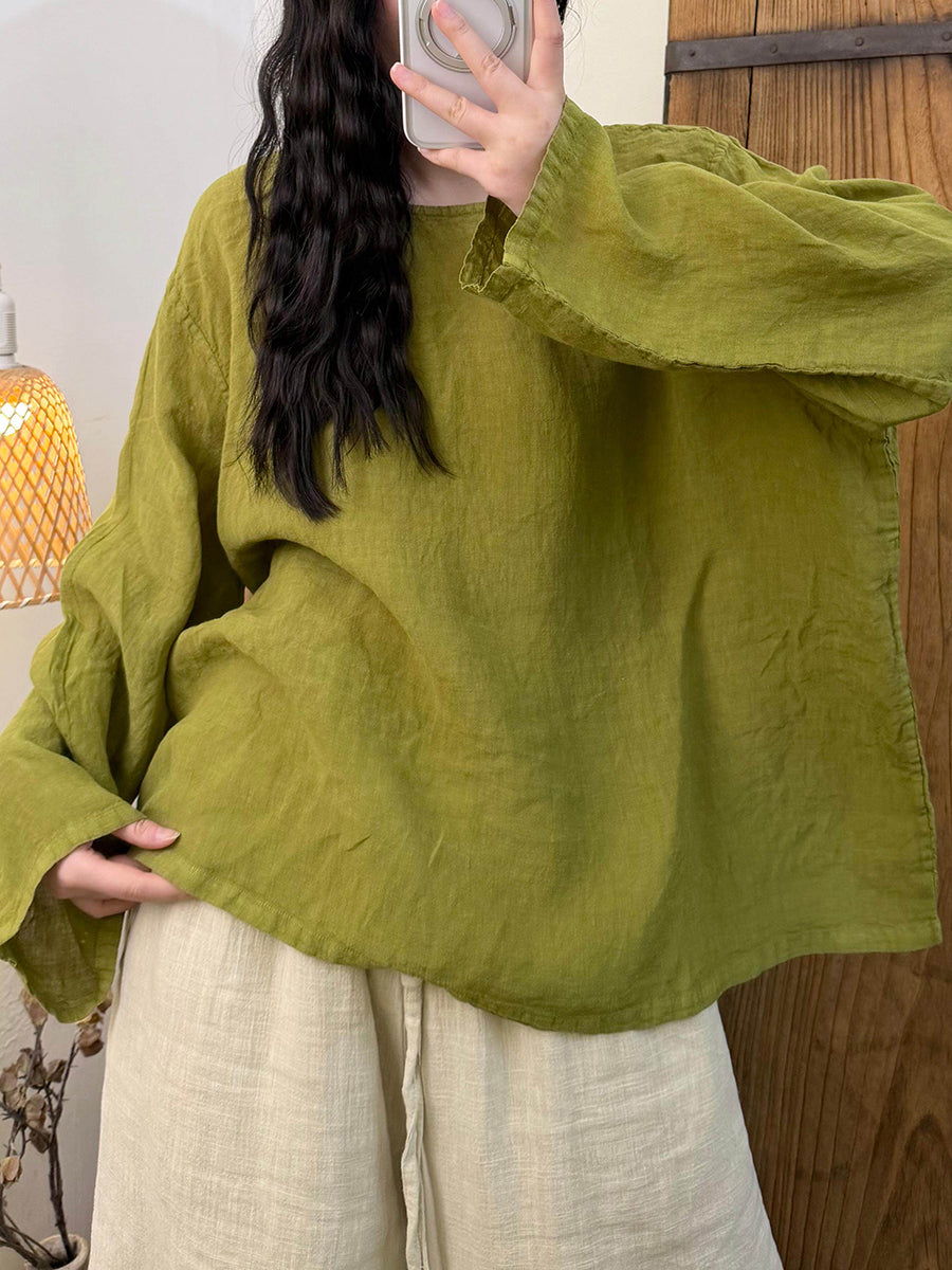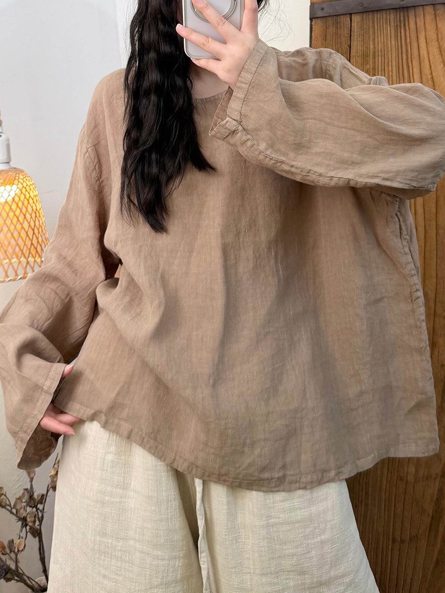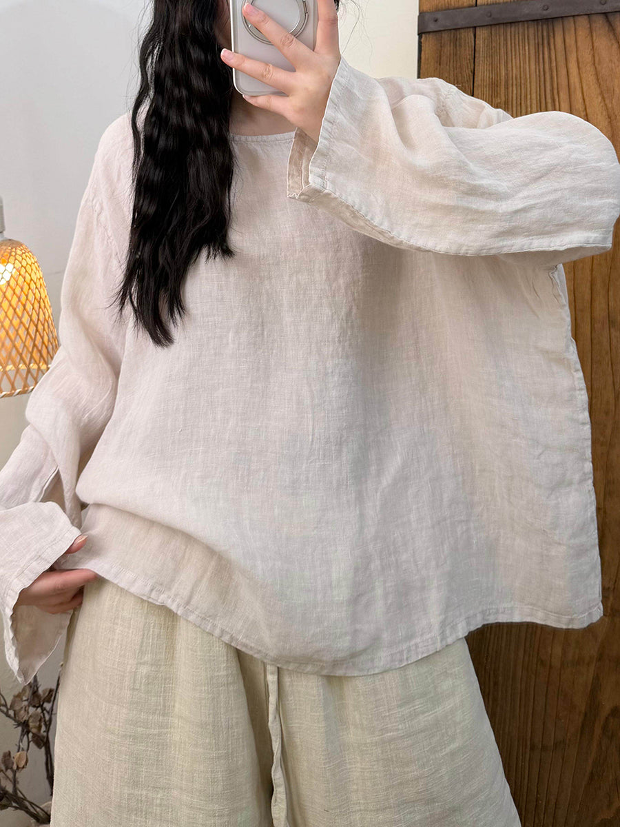 Camisa informal de lino con cuello redondo y color puro de verano para mujer