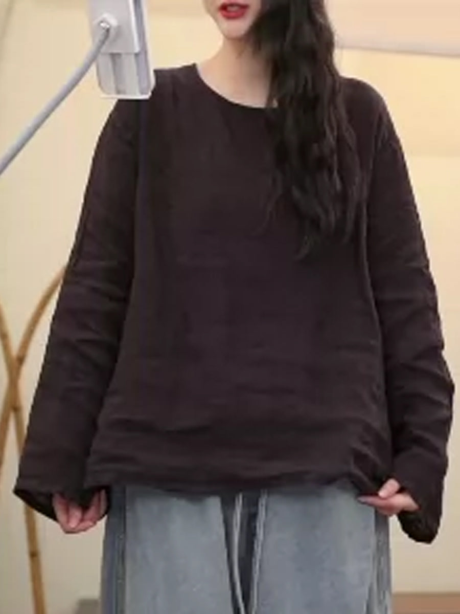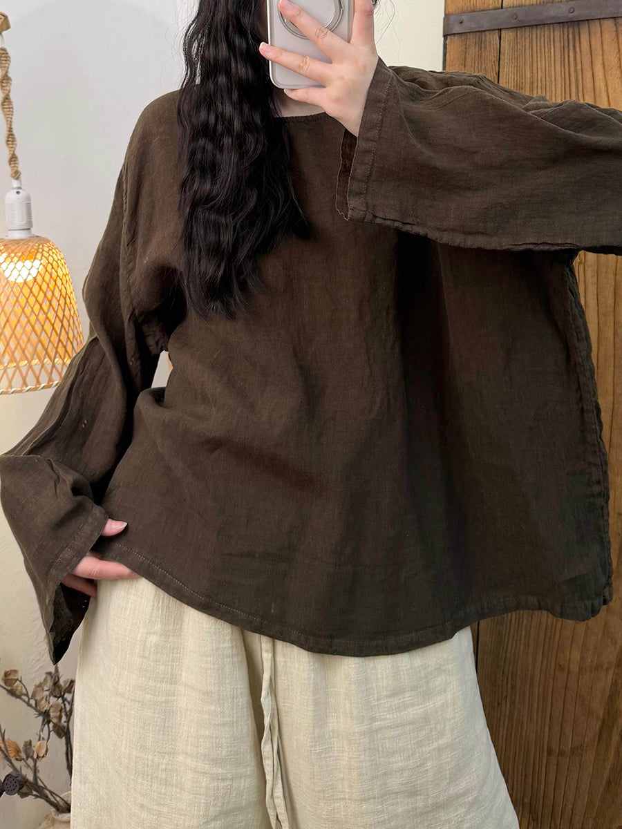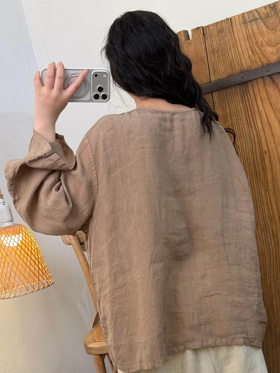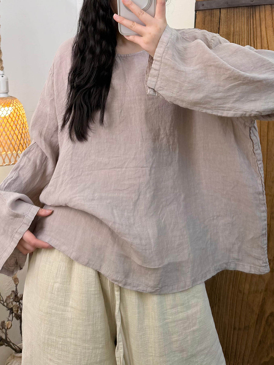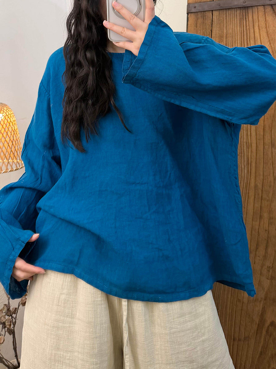Camisa informal de lino con cuello redondo y color puro de verano para mujer