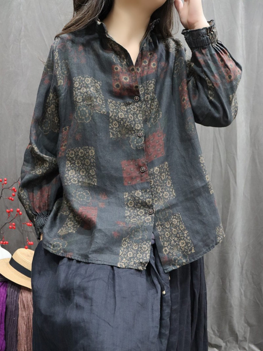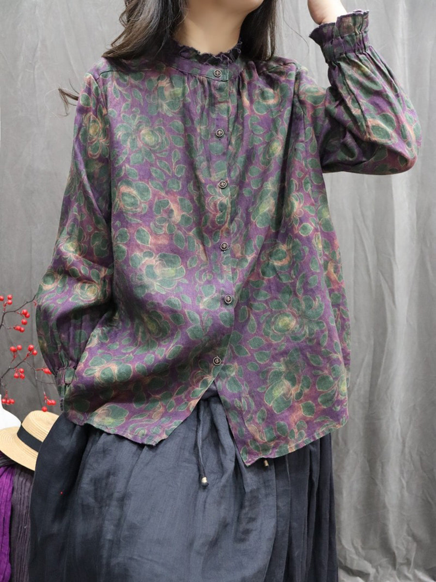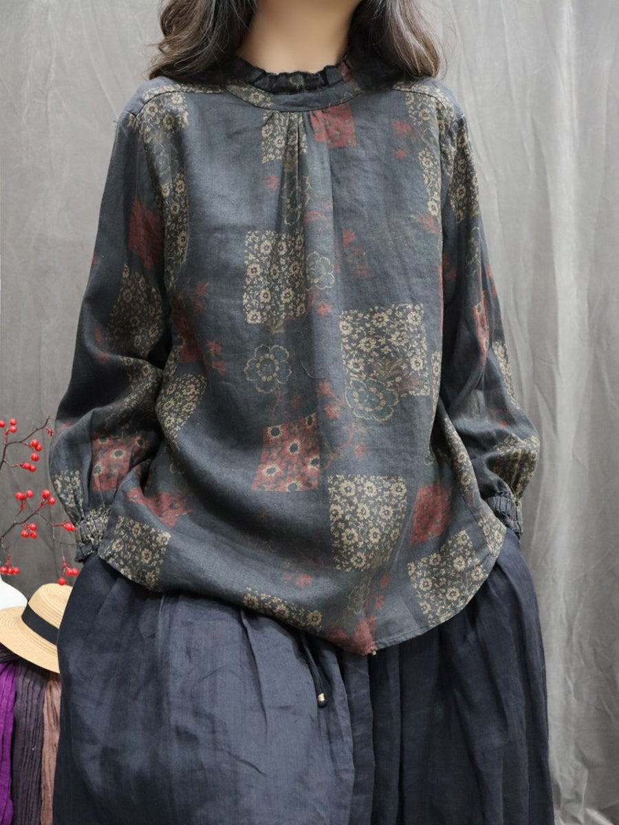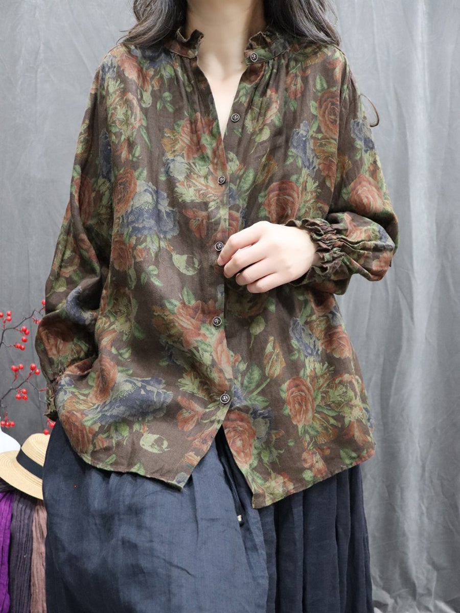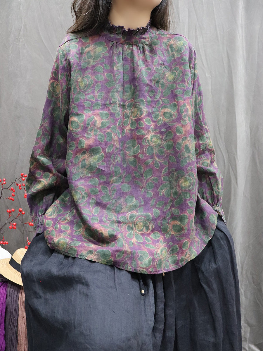 Camisa de lino 100 % con cuello alto y estampado floral artístico para mujer, primavera