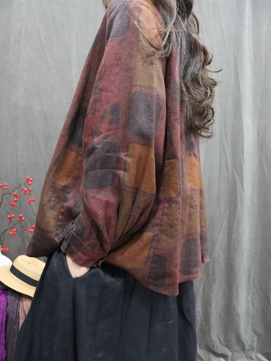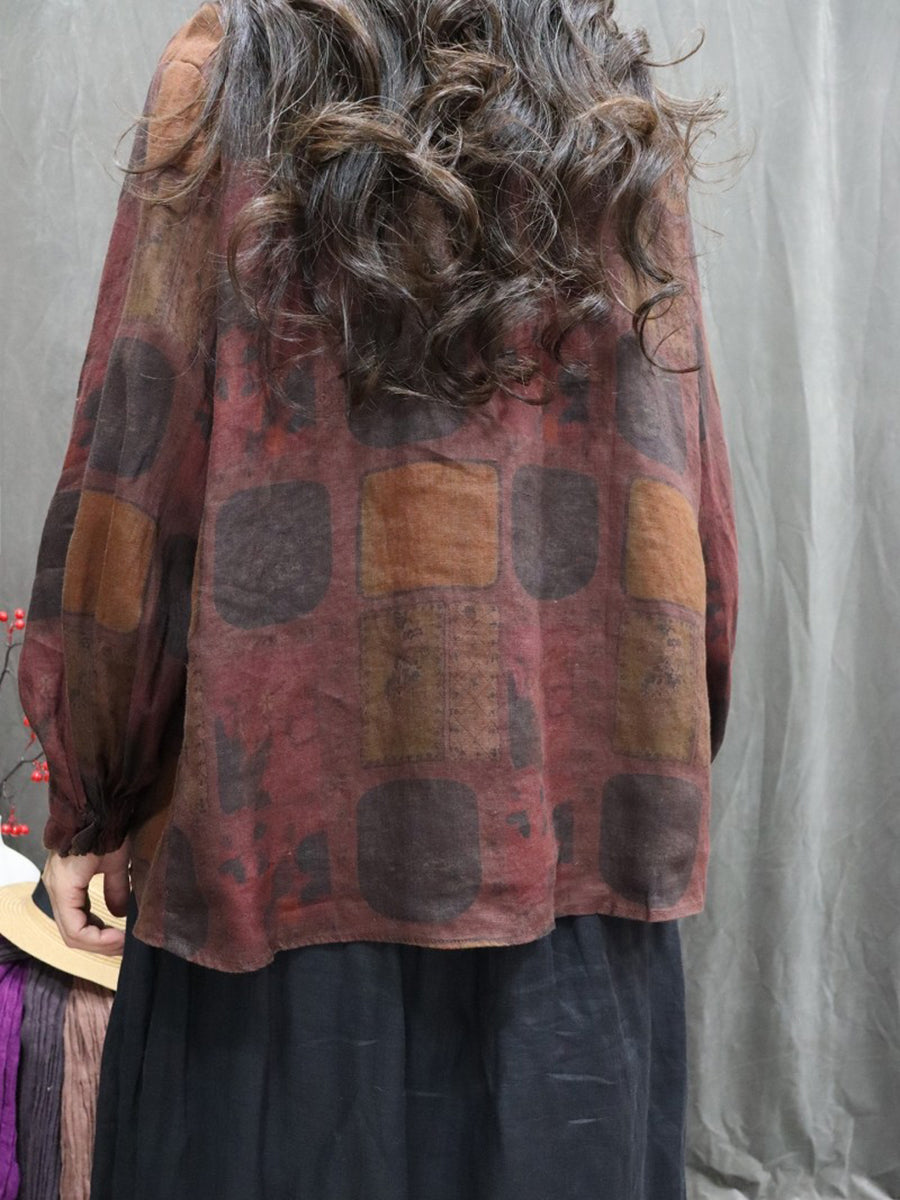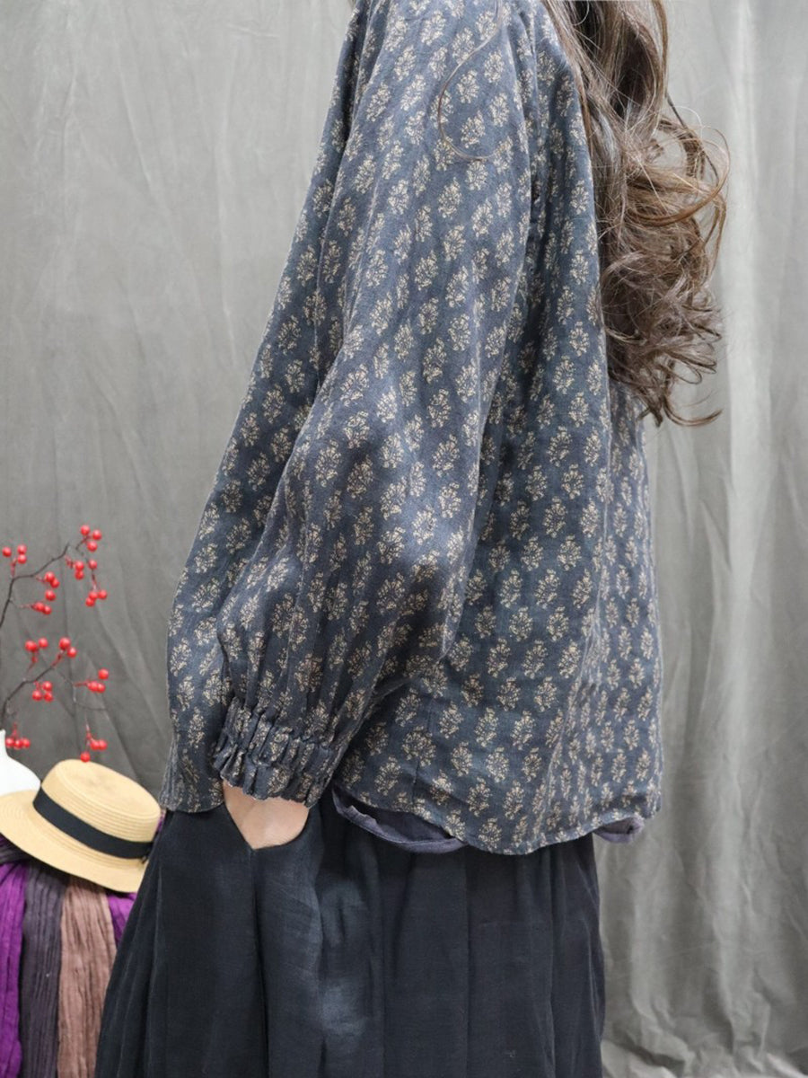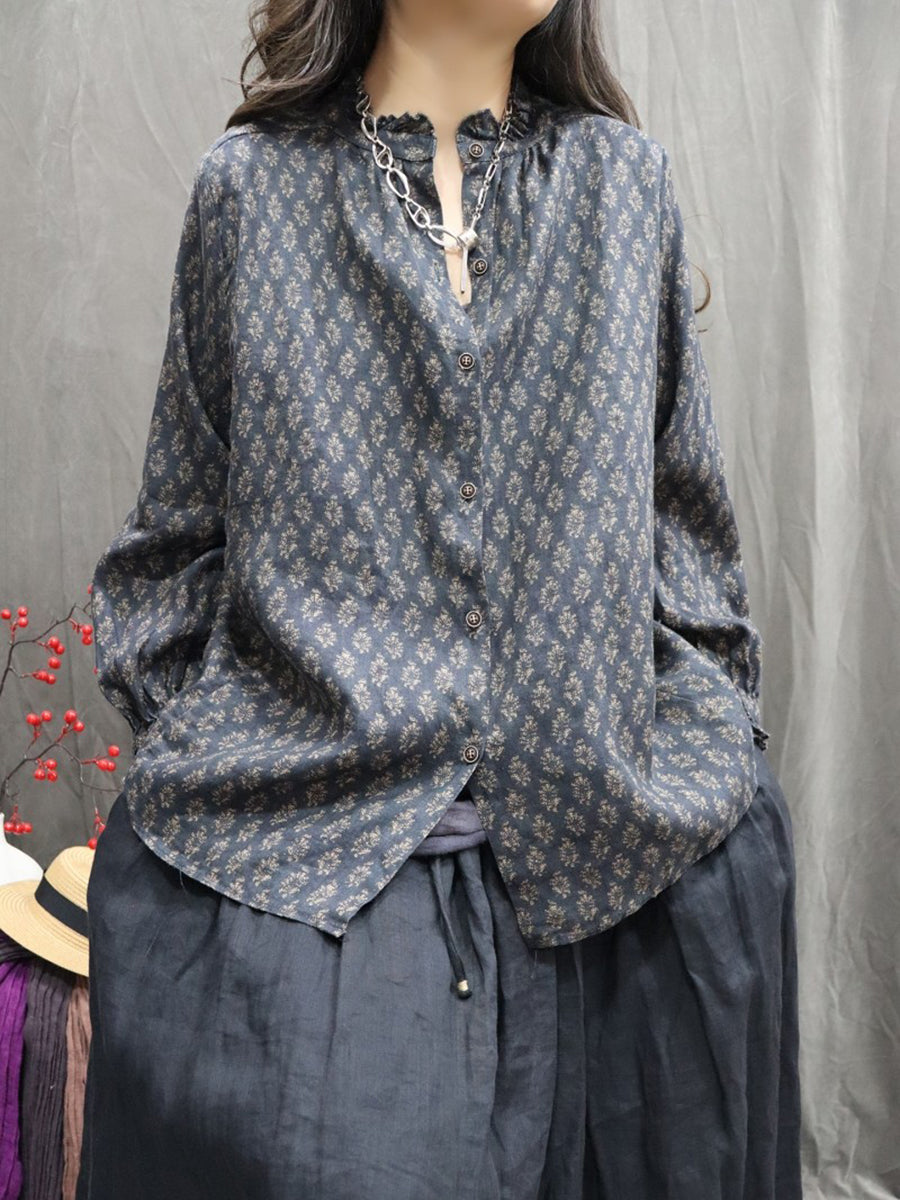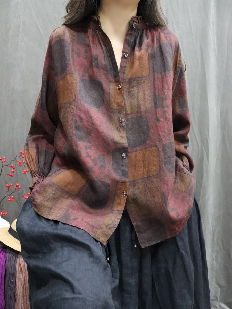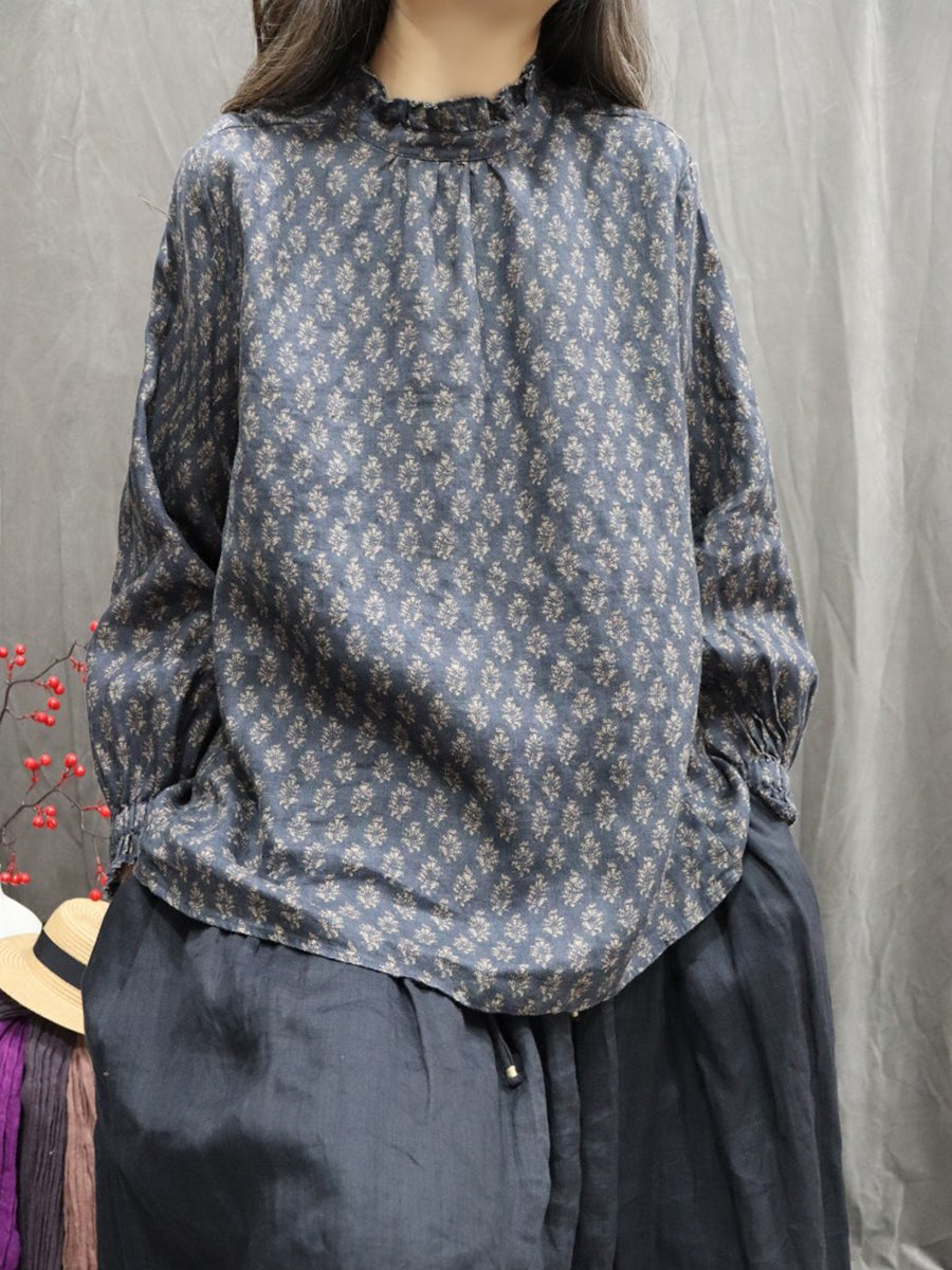 Camisa de lino 100 % con cuello alto y estampado floral artístico para mujer, primavera