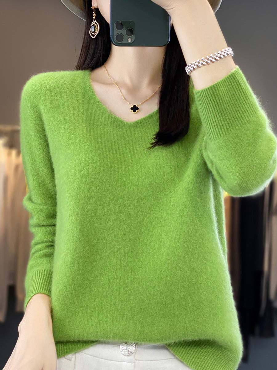 Suéter de punto con cuello en V y color puro para mujer de otoño