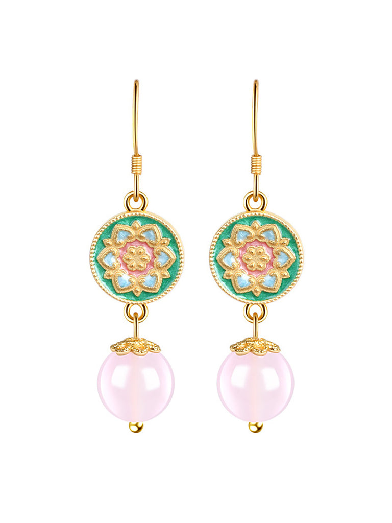 Pendientes étnicos de jade con flor cloisonné para mujer