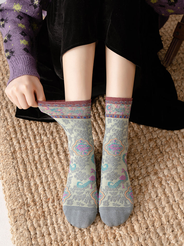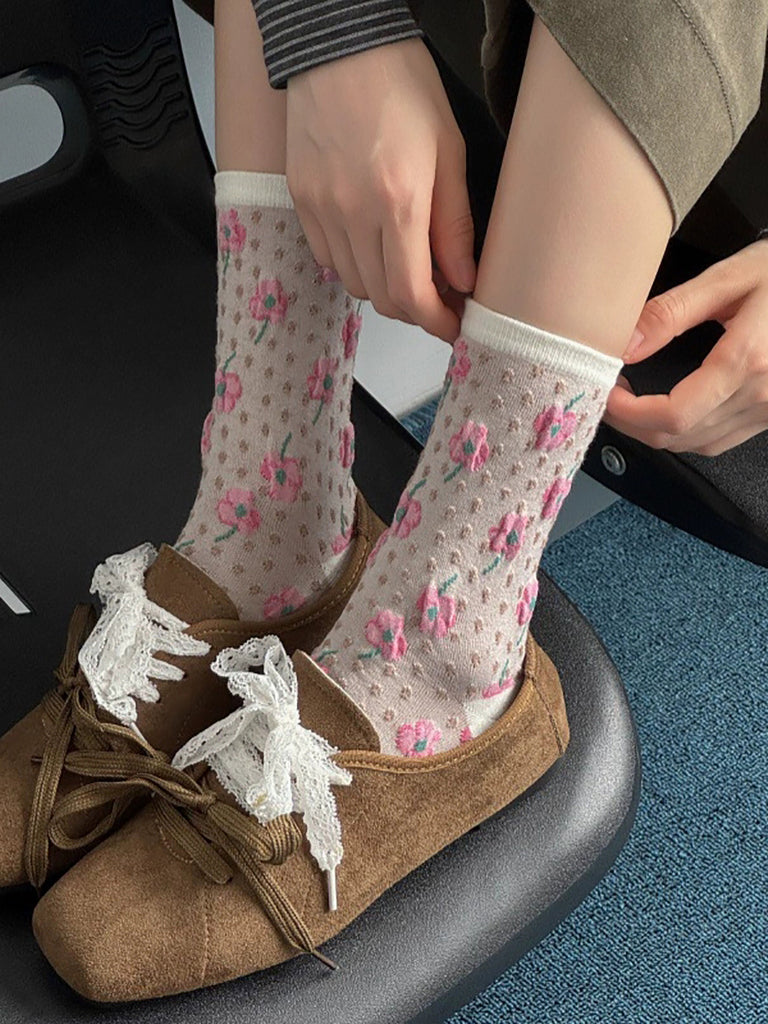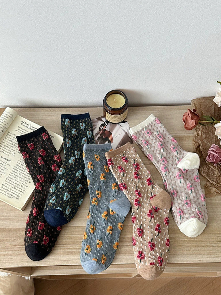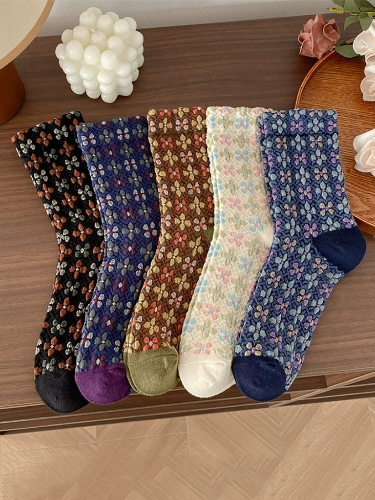 5 pares de calcetines de algodón jacquard con estampado floral para mujer, ideales para el invierno.