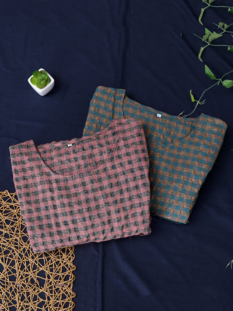 Vestido midi de lino y algodón con cuello redondo y cuadros escoceses de talla grande para verano