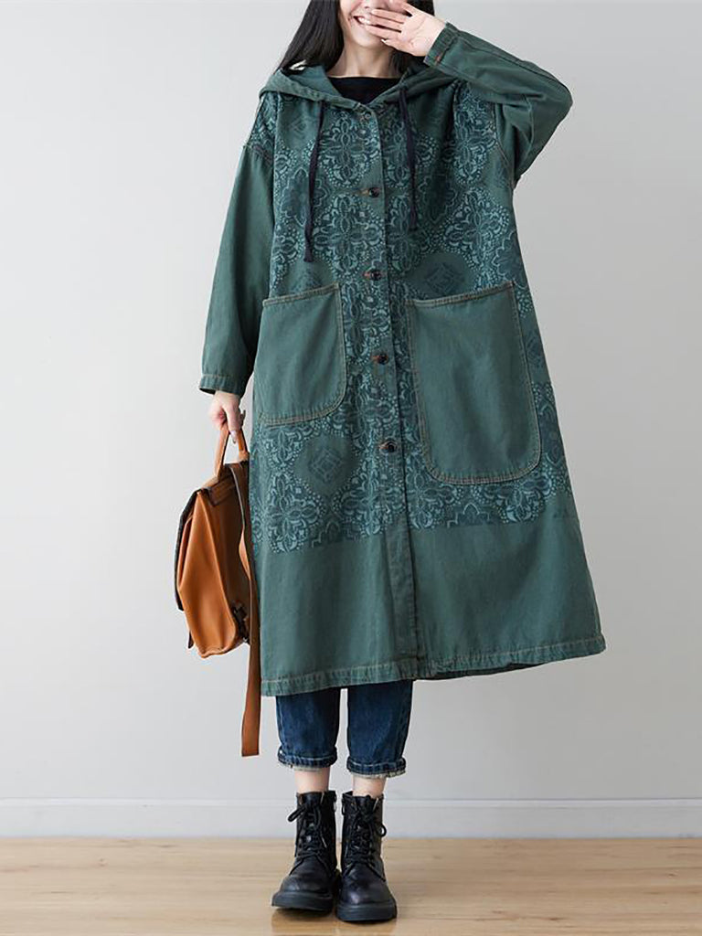 Este abrigo largo de mezclilla con capucha para mujer presenta un diseño de flores unidas con un material de algodón y un estilo de manga raglán. La longitud de manga larga y el estilo vintage lo hacen perfecto para las temporadas de otoño e invierno.