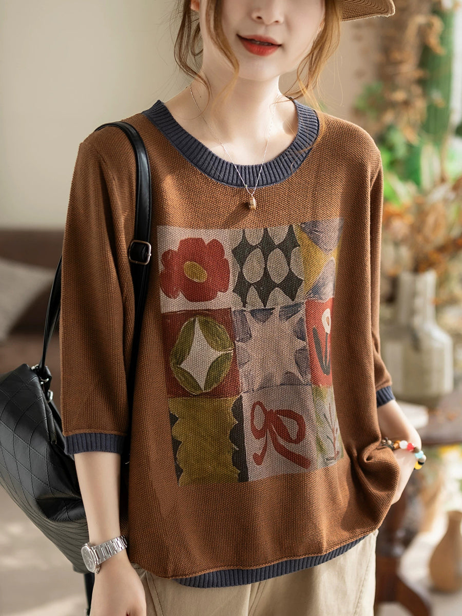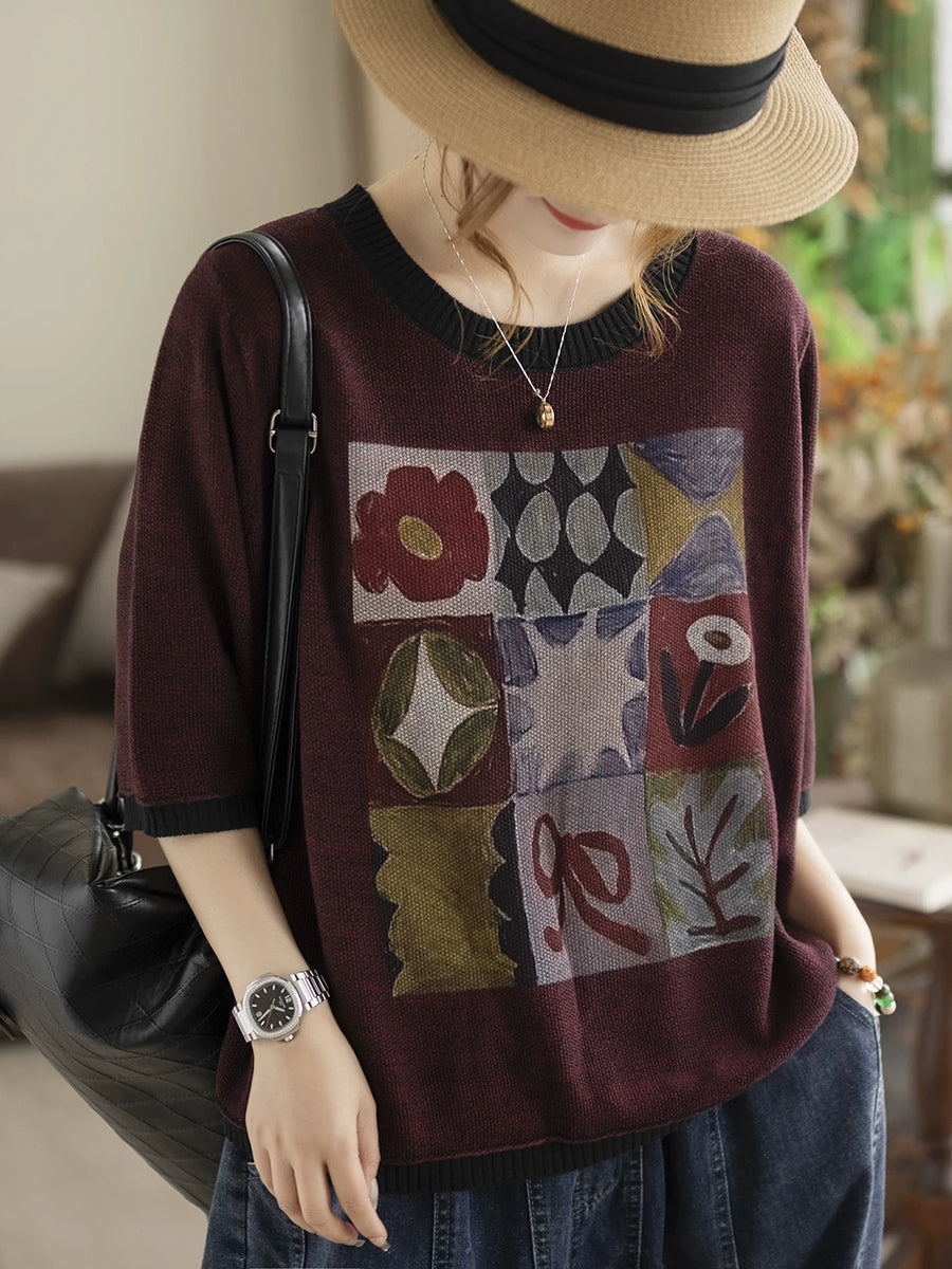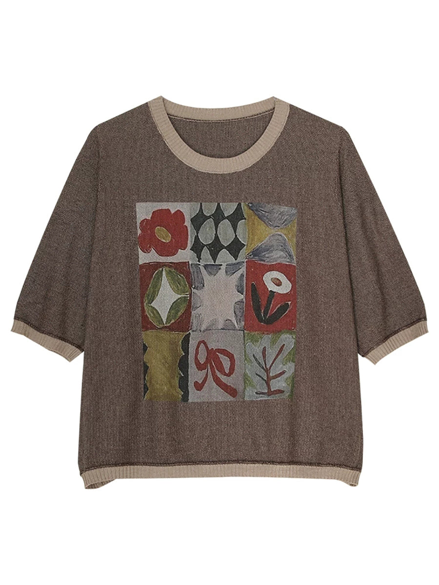 Blusa de punto de algodón con cuello redondo y diseño artístico de verano para mujer