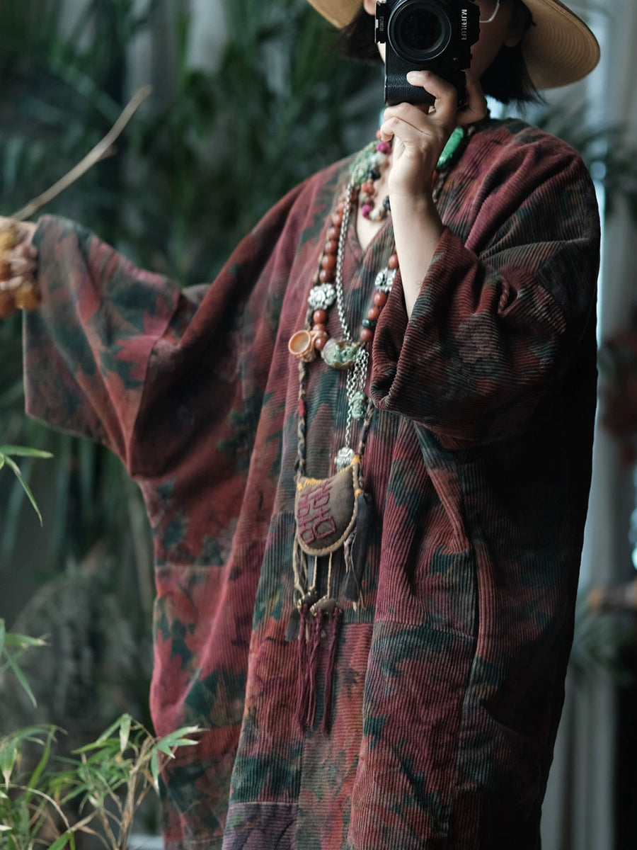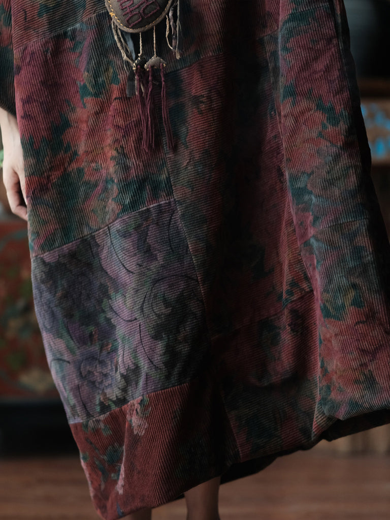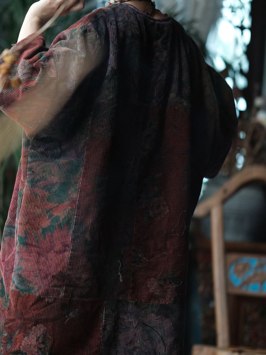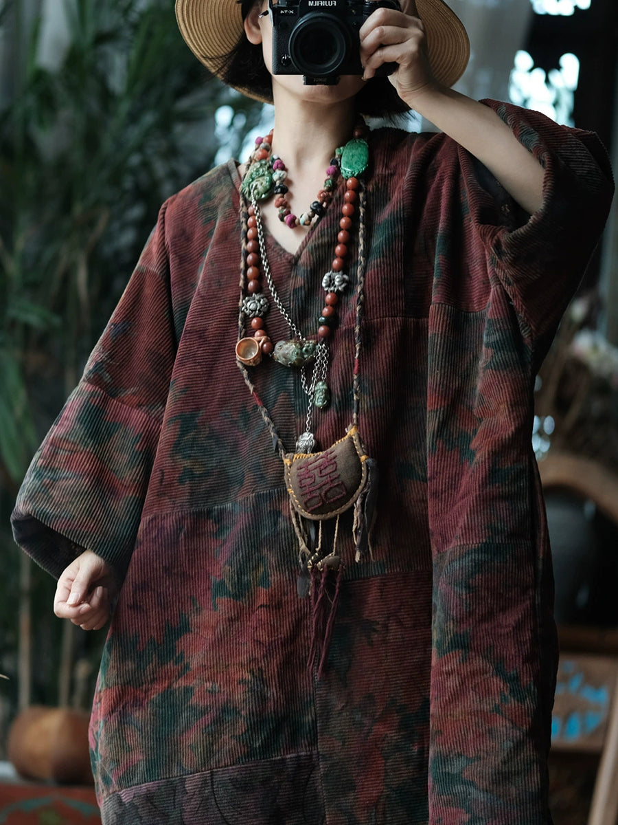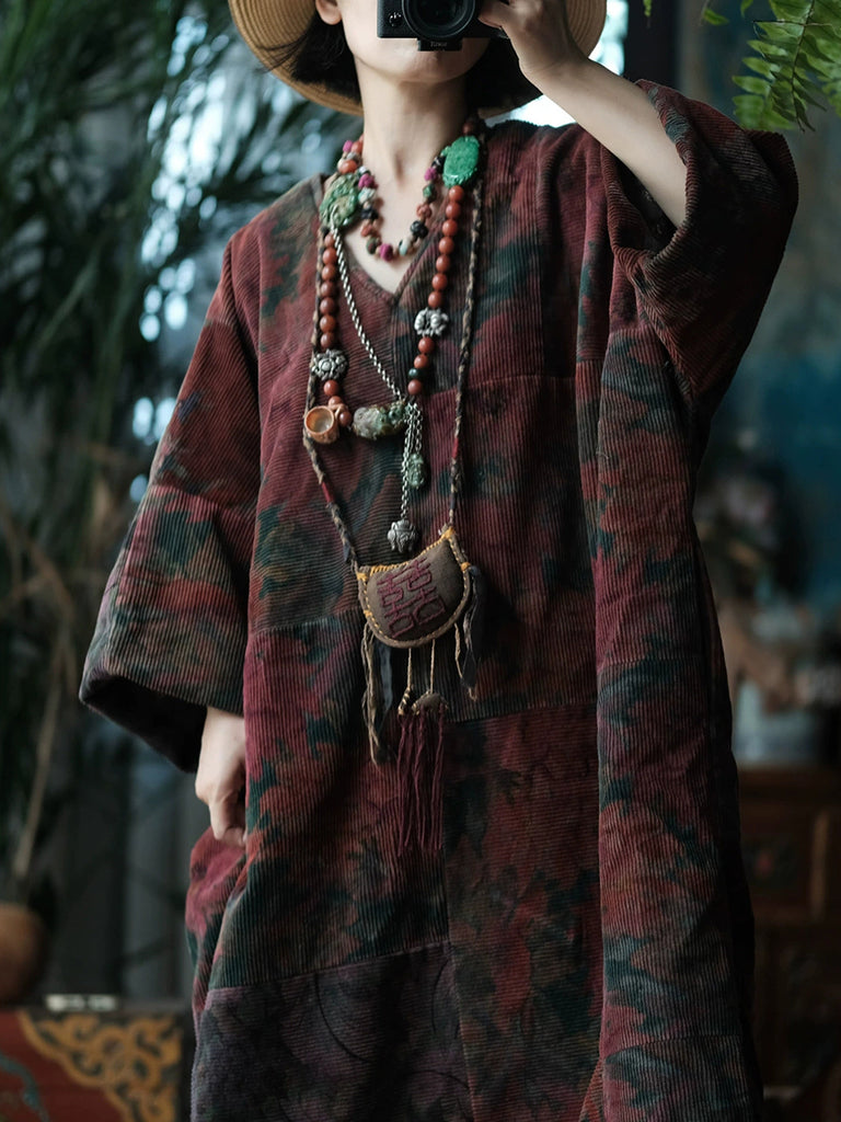 Bata de algodón con cuello en V y flores de invierno vintage para mujer