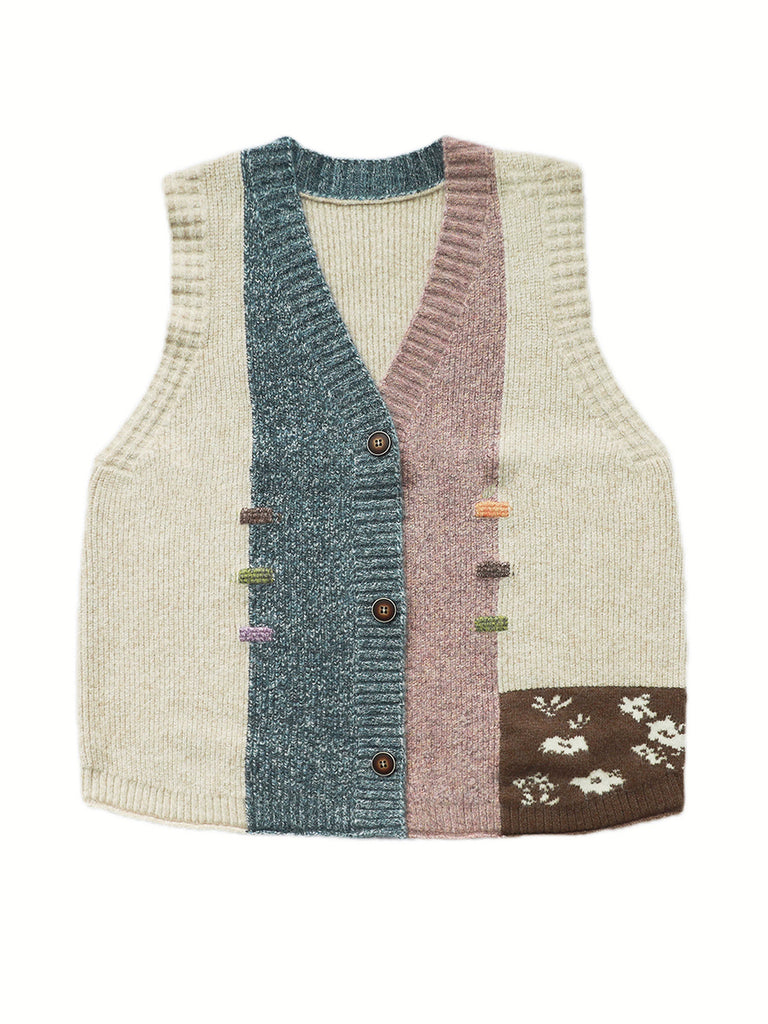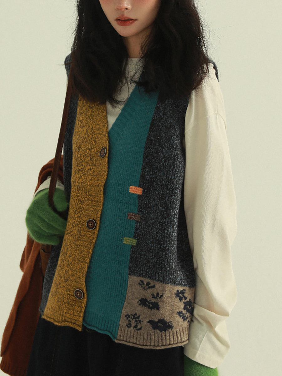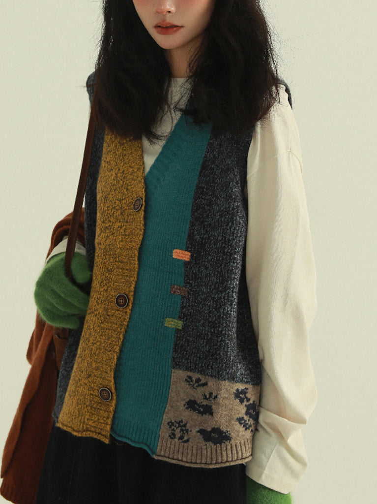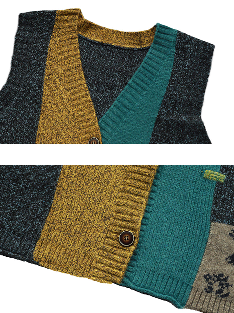 Chaleco de punto con cuello en V y patchwork artístico para mujer, ideal para otoño.