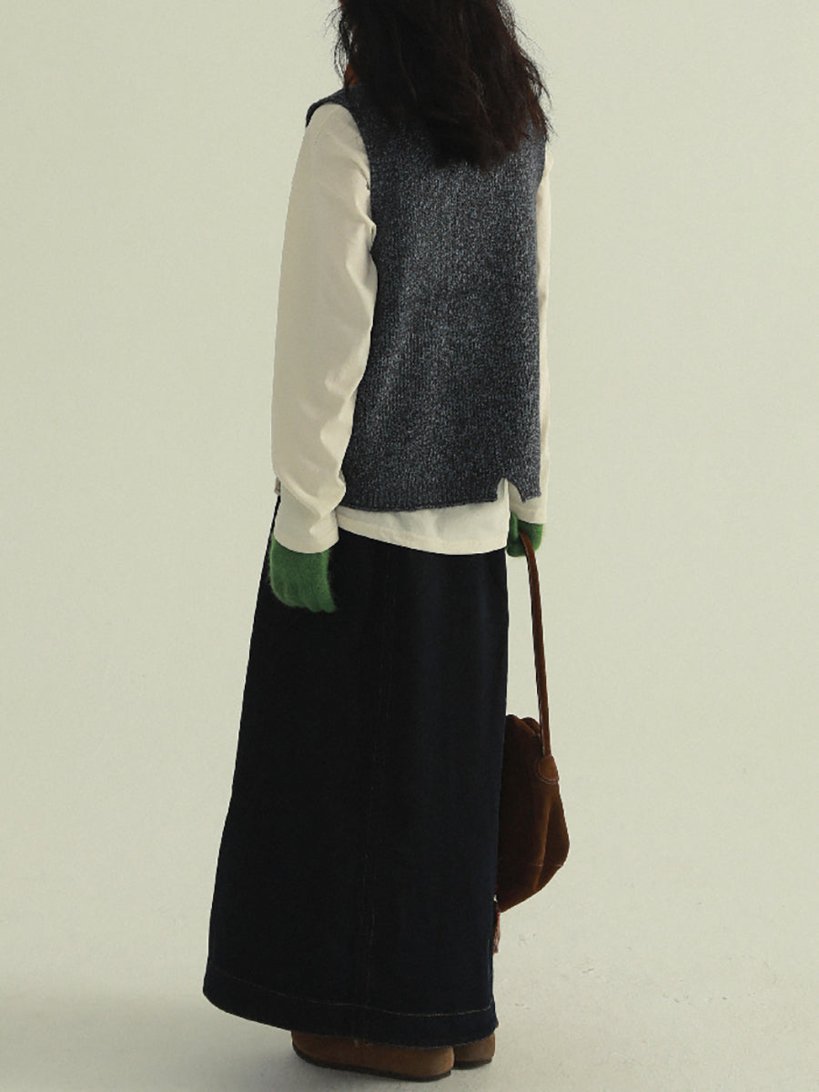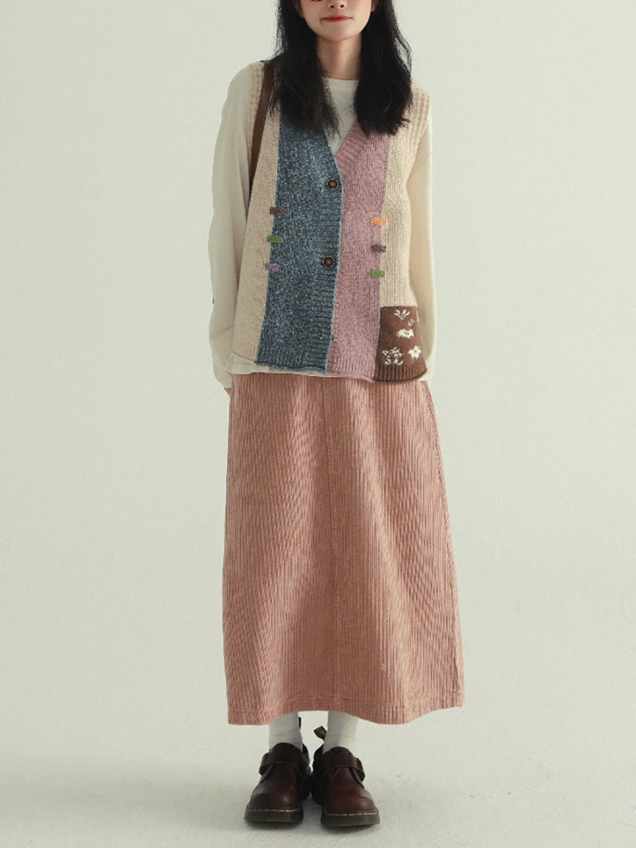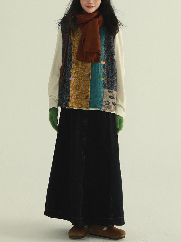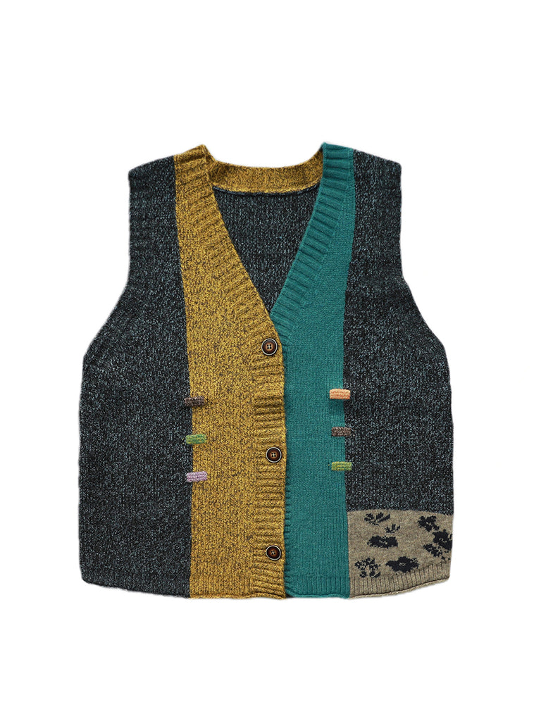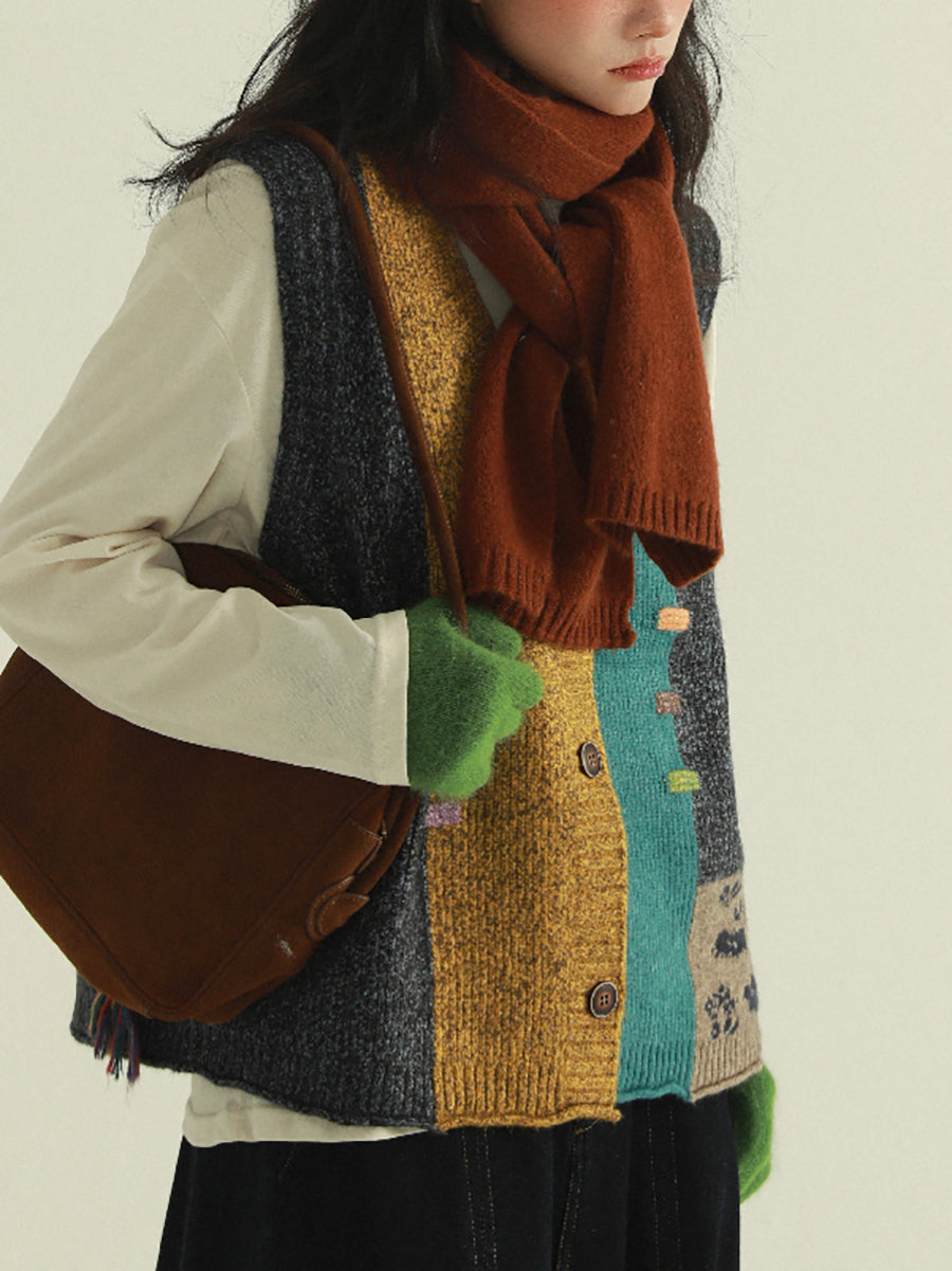 Chaleco de punto con cuello en V y patchwork artístico para mujer, ideal para otoño.
