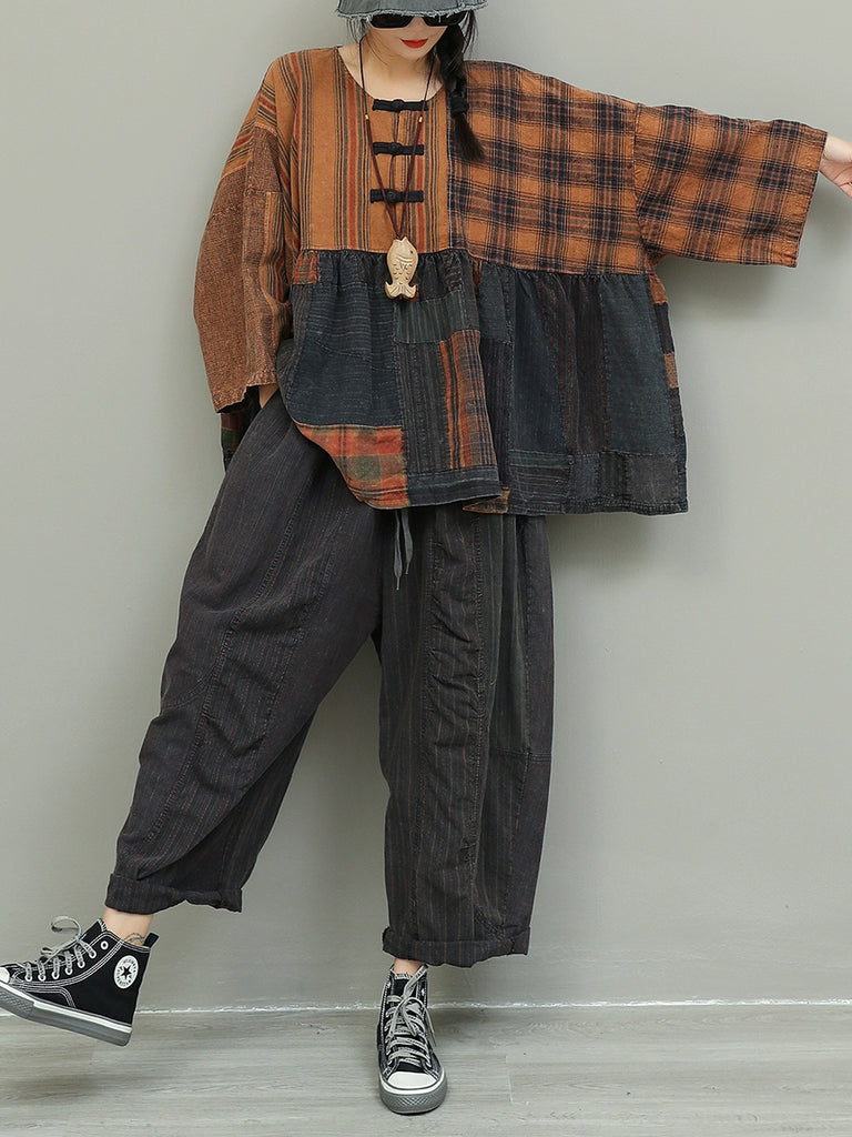 Trajes holgados de algodón con cuello redondo y retazos retro de otoño para mujer