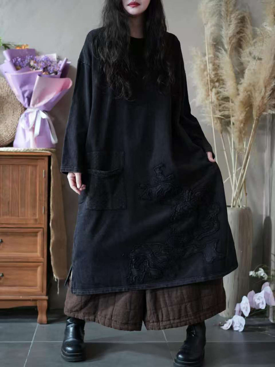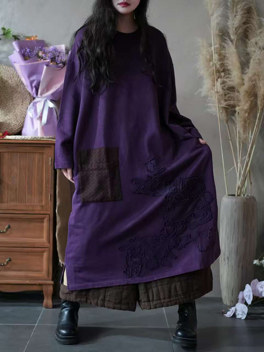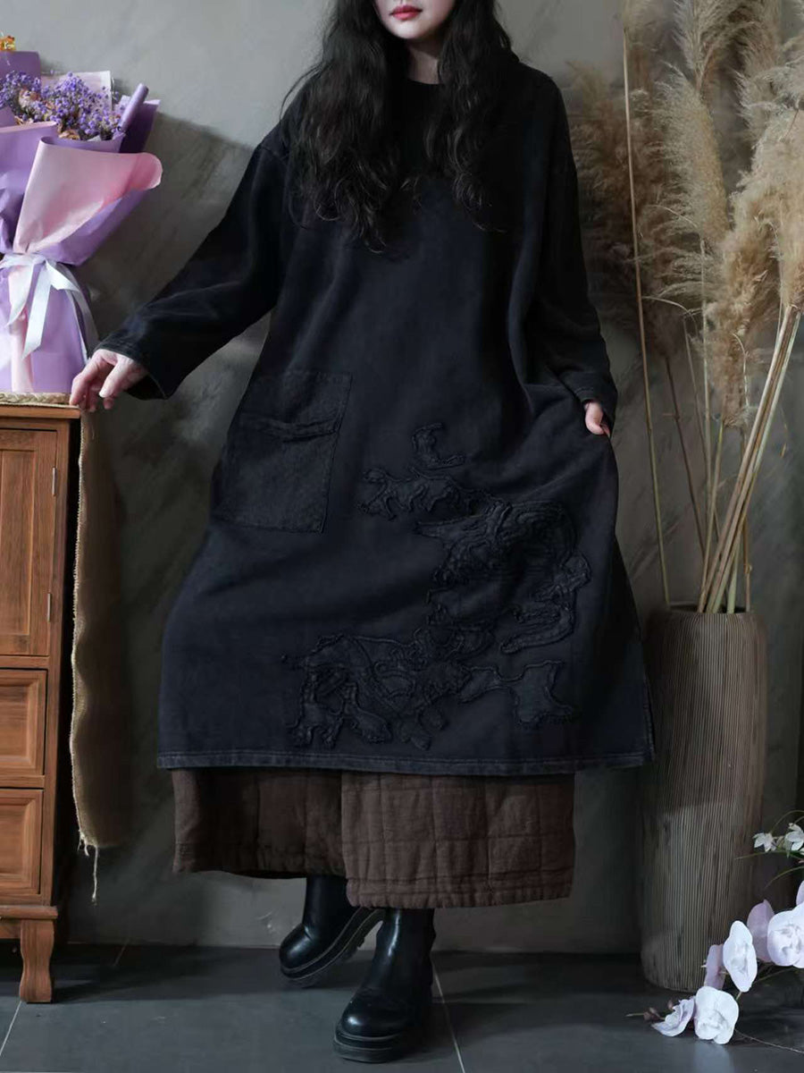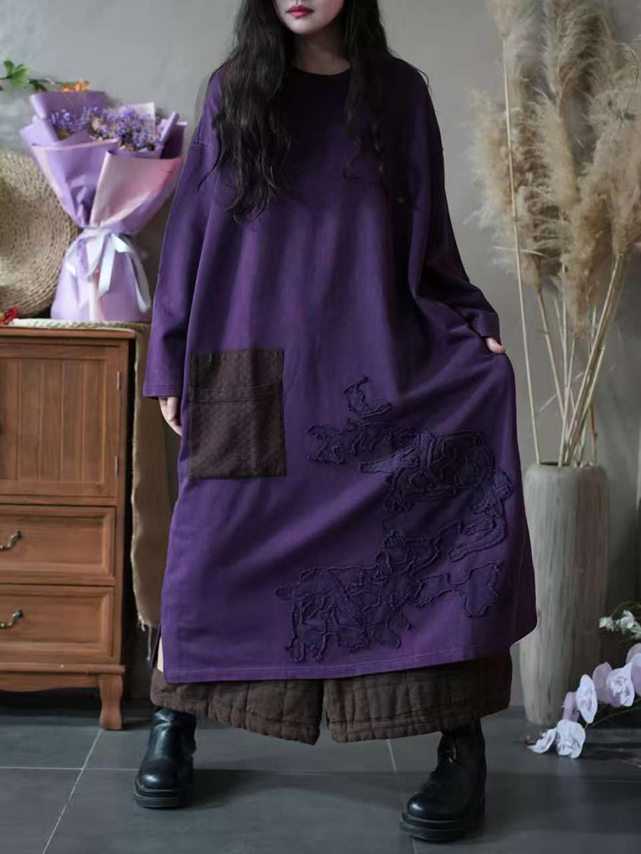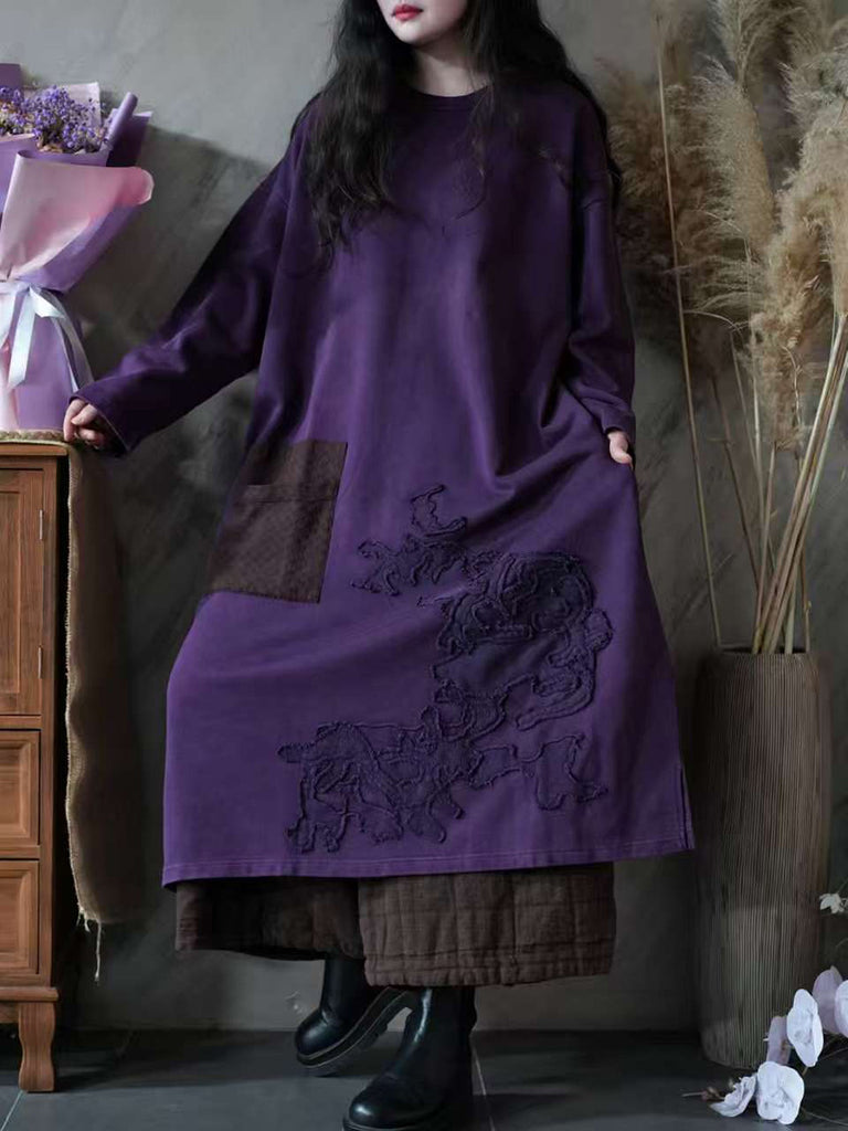Vestido de mujer estilo vintage de otoño con cuello redondo y detalles de parches
