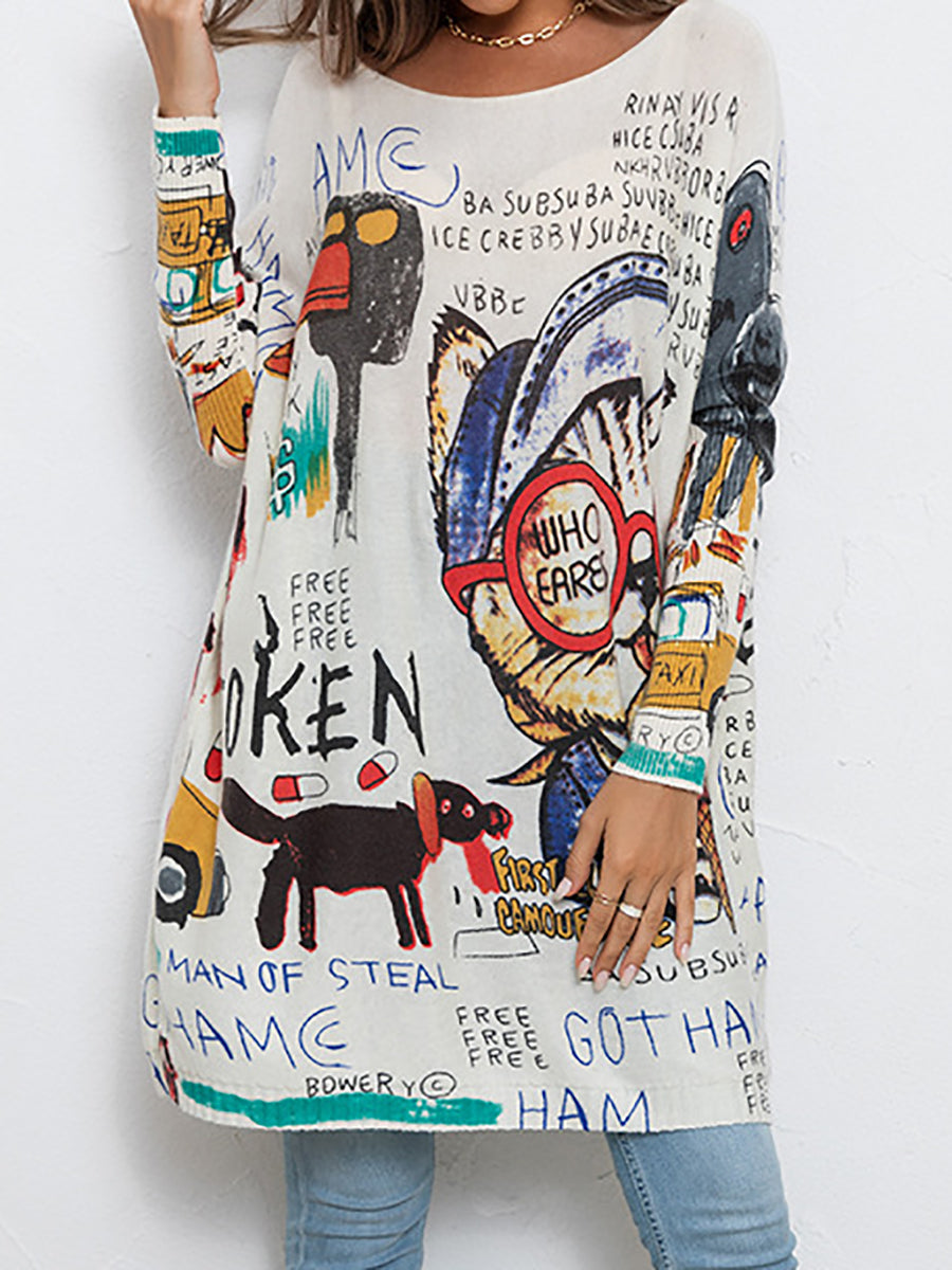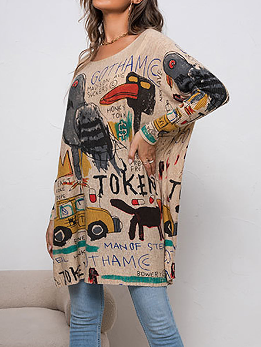 Camisa de punto informal con estampado de pájaros y dibujos animados para mujer