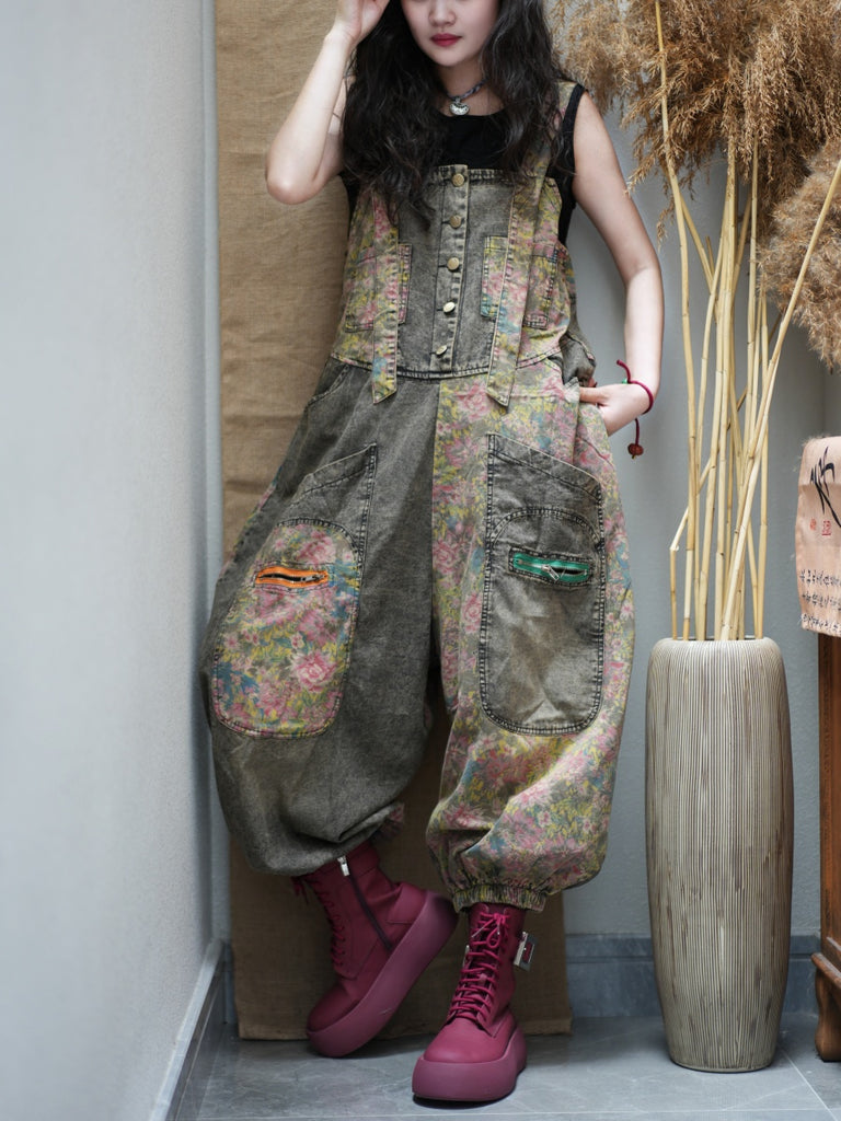 Mono vaquero con parches florales retro de verano para mujer