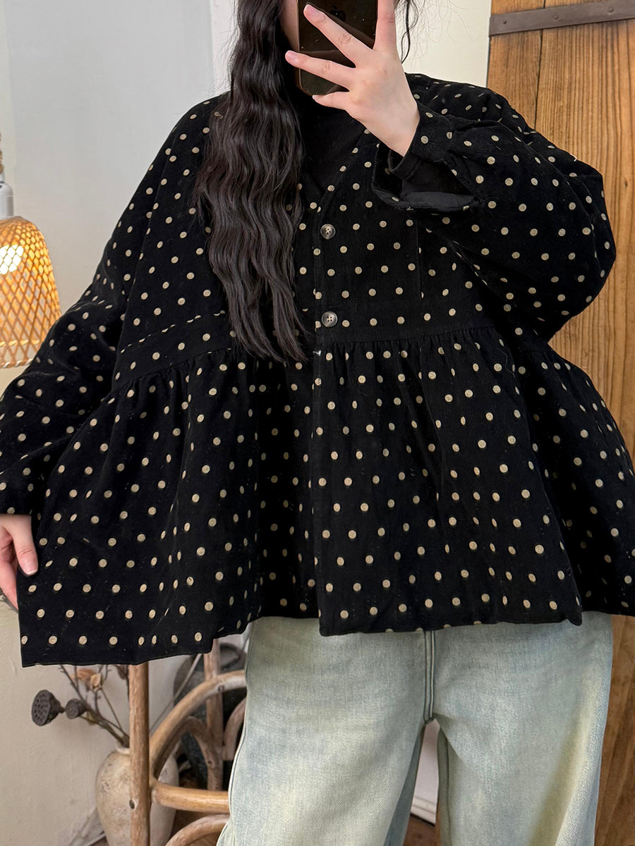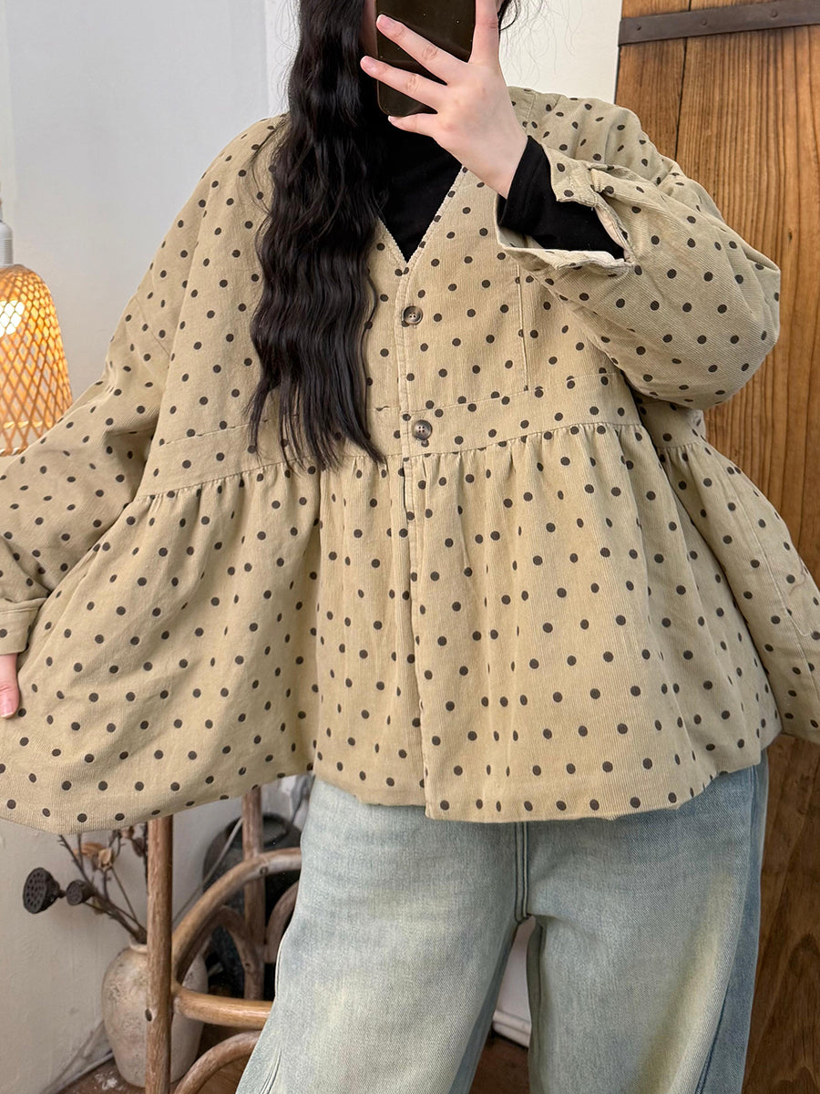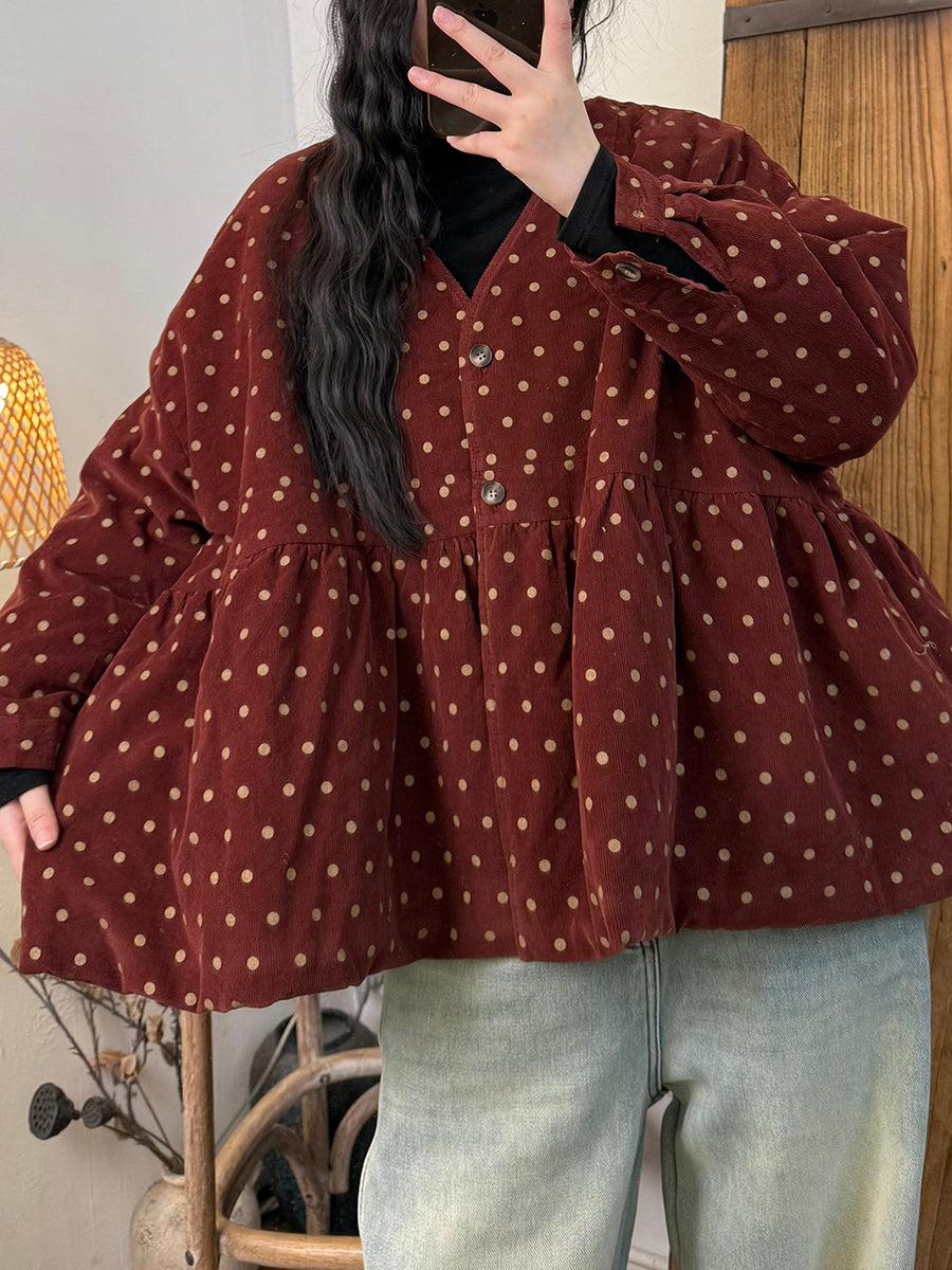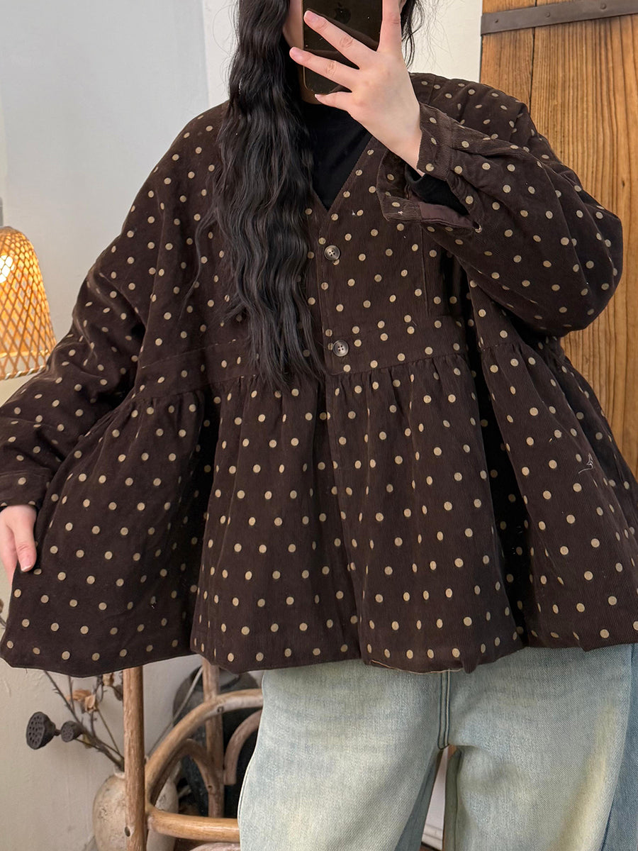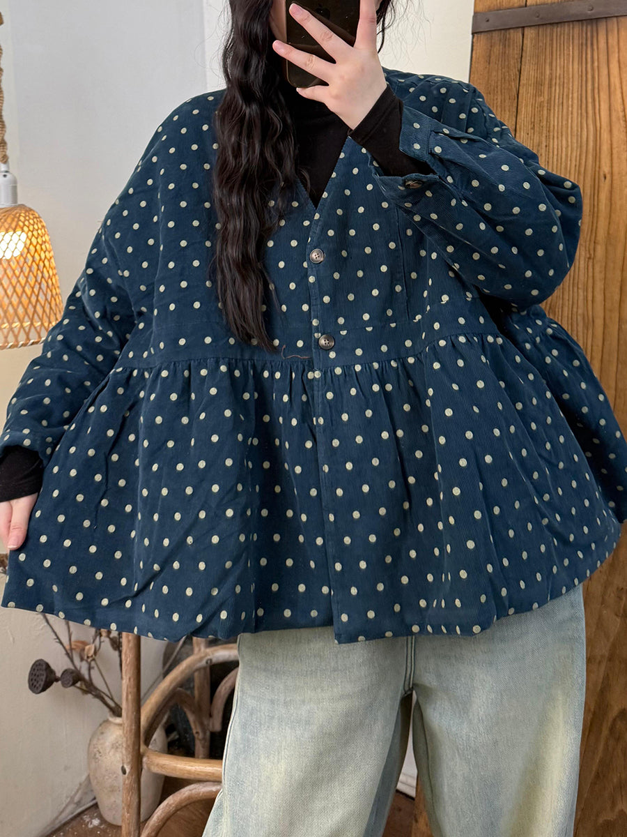 Abrigo acolchado de algodón con cuello en V y estampado de lunares, estilo vintage otoñal para mujer.