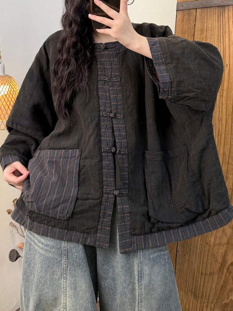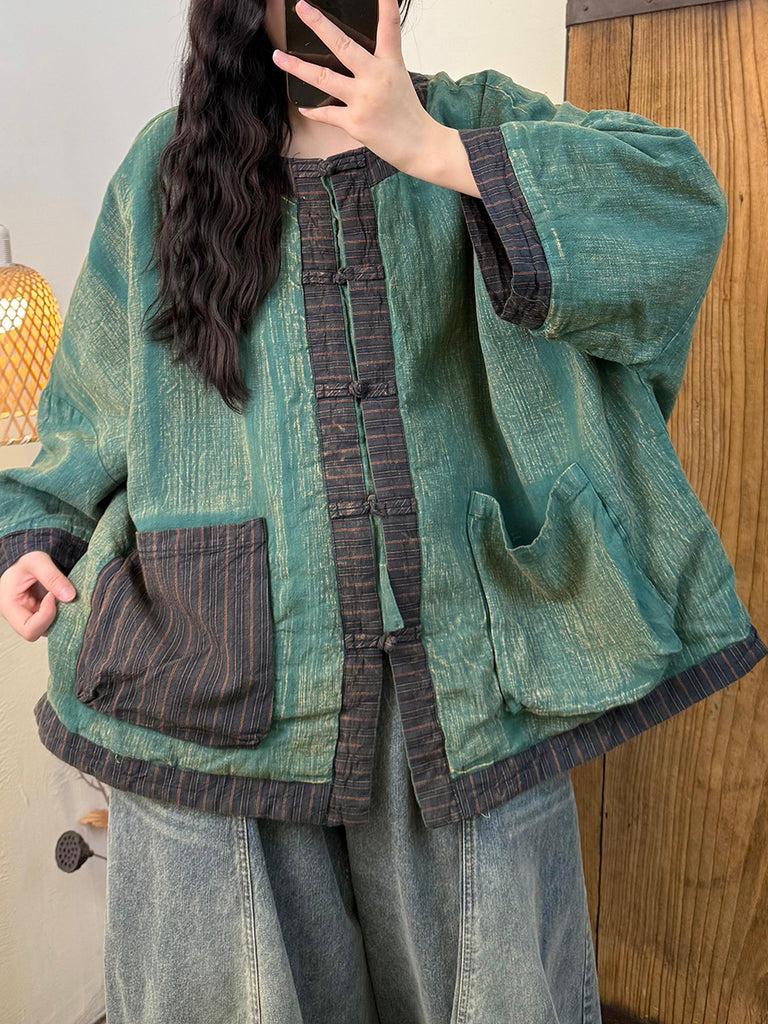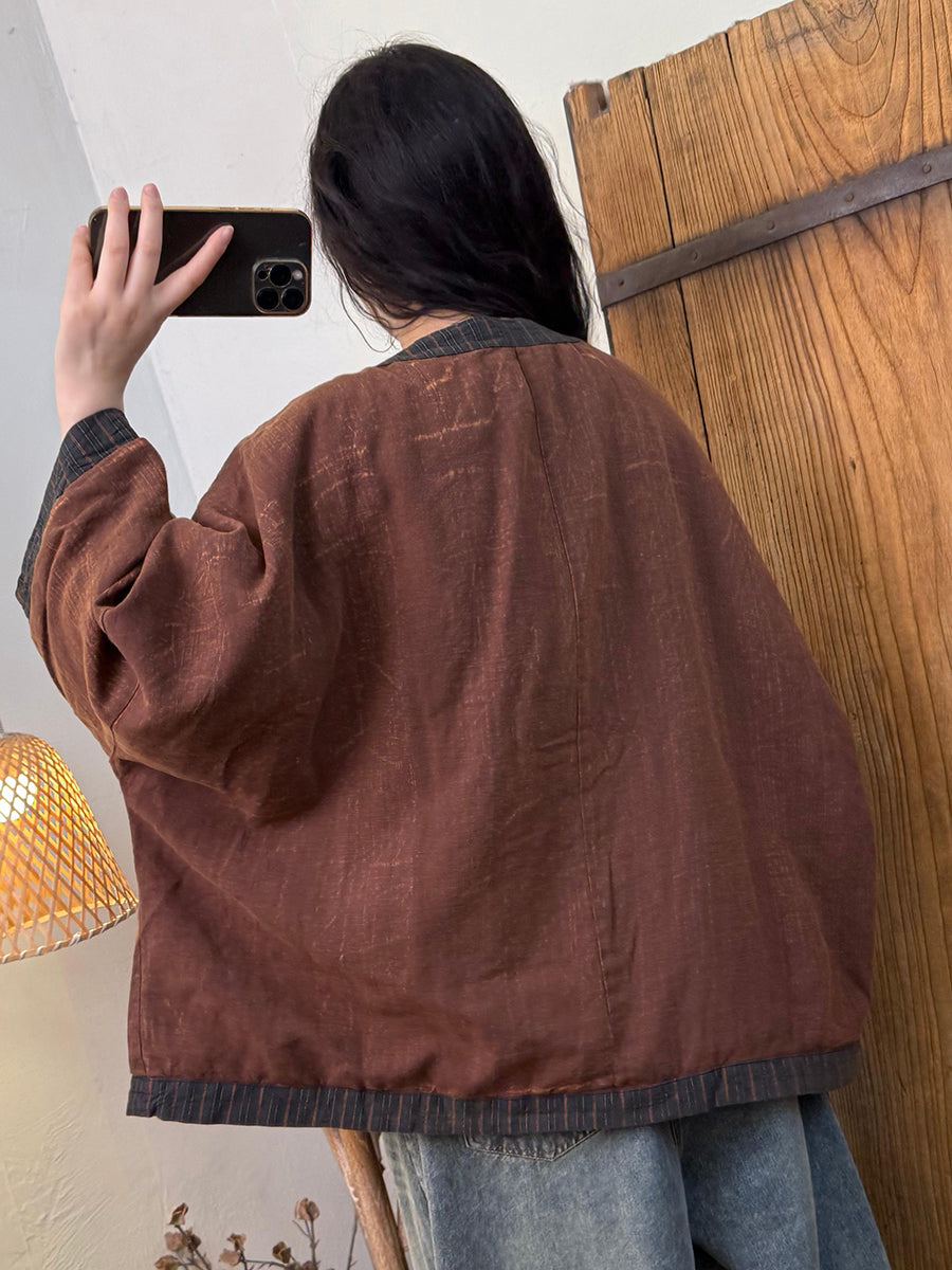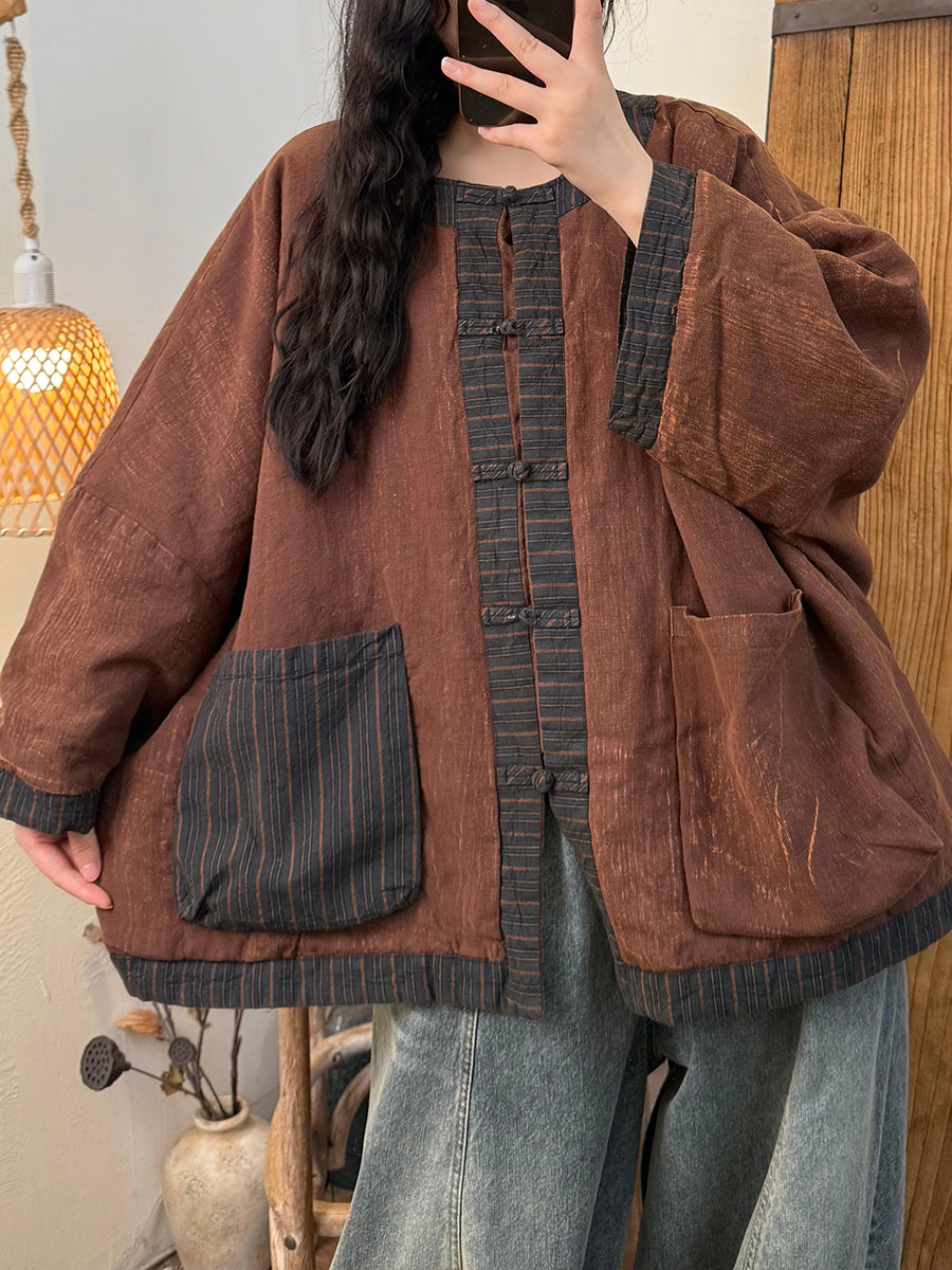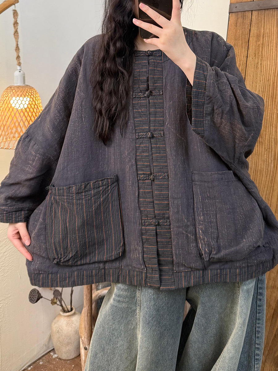 Abrigo acolchado vintage de invierno para mujer, con cuello redondo y rayas.
