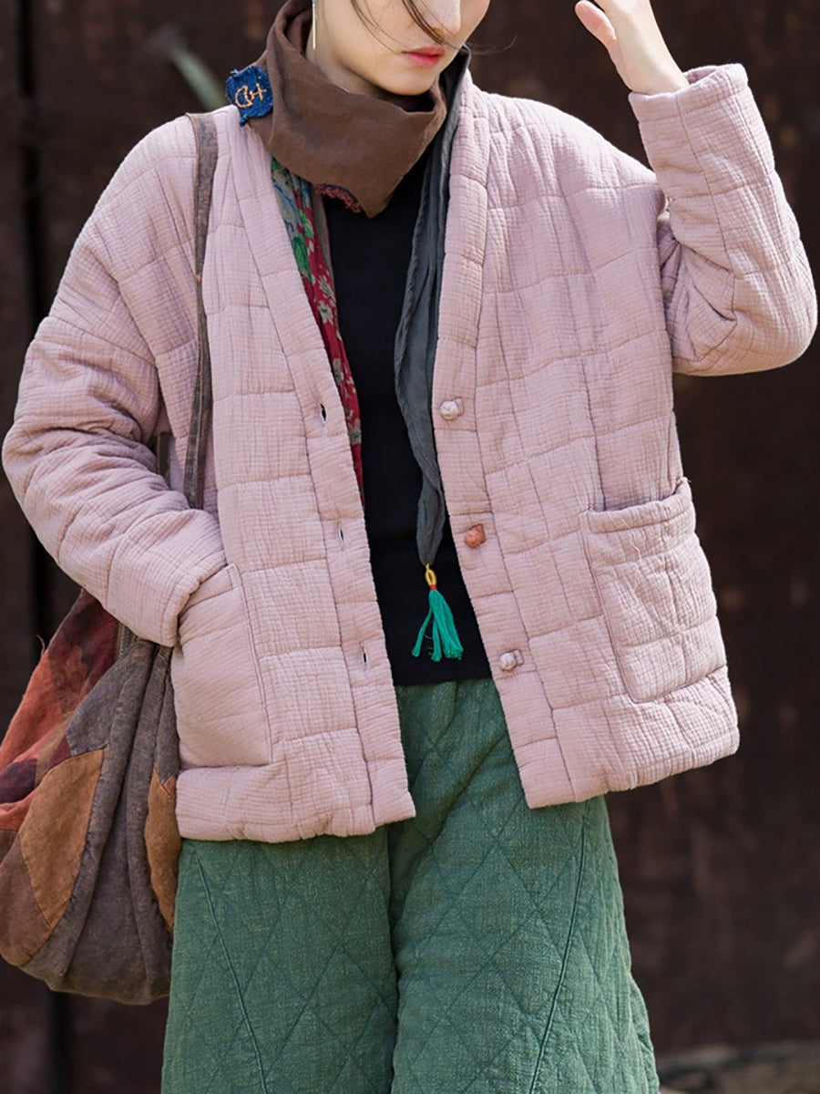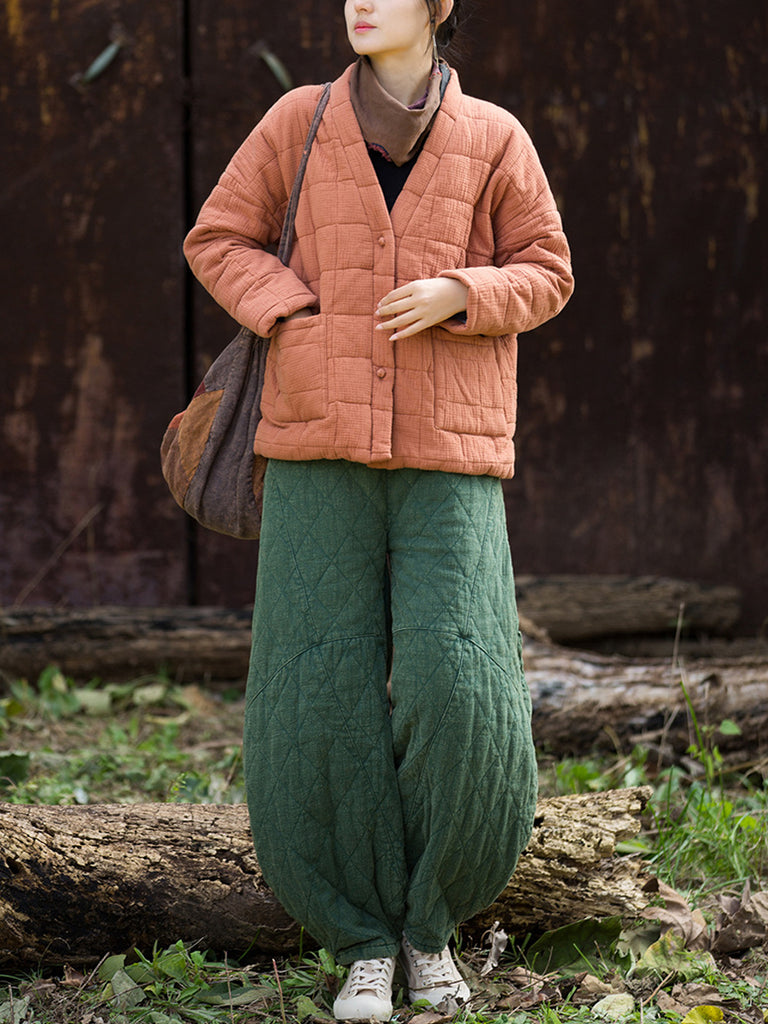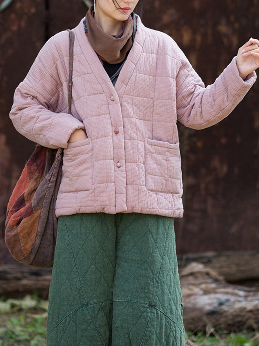 Abrigo de invierno para mujer, estilo retro, de algodón, color liso, acolchado, con cuello en V.