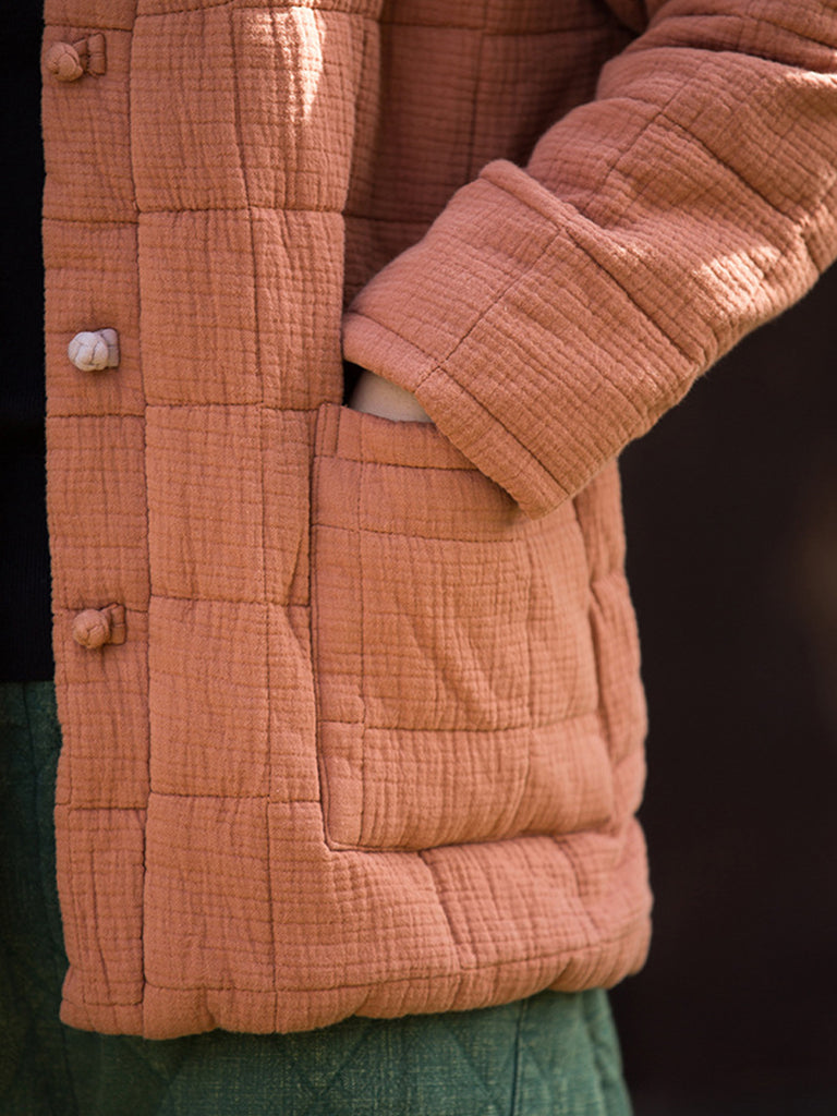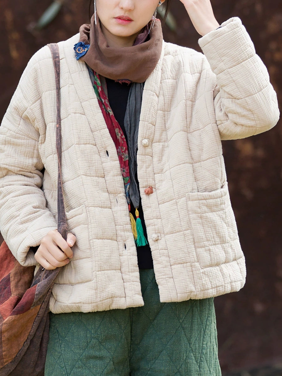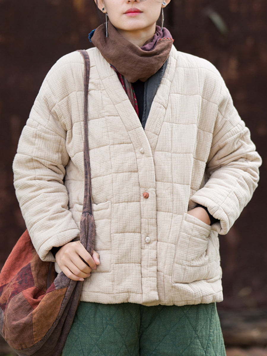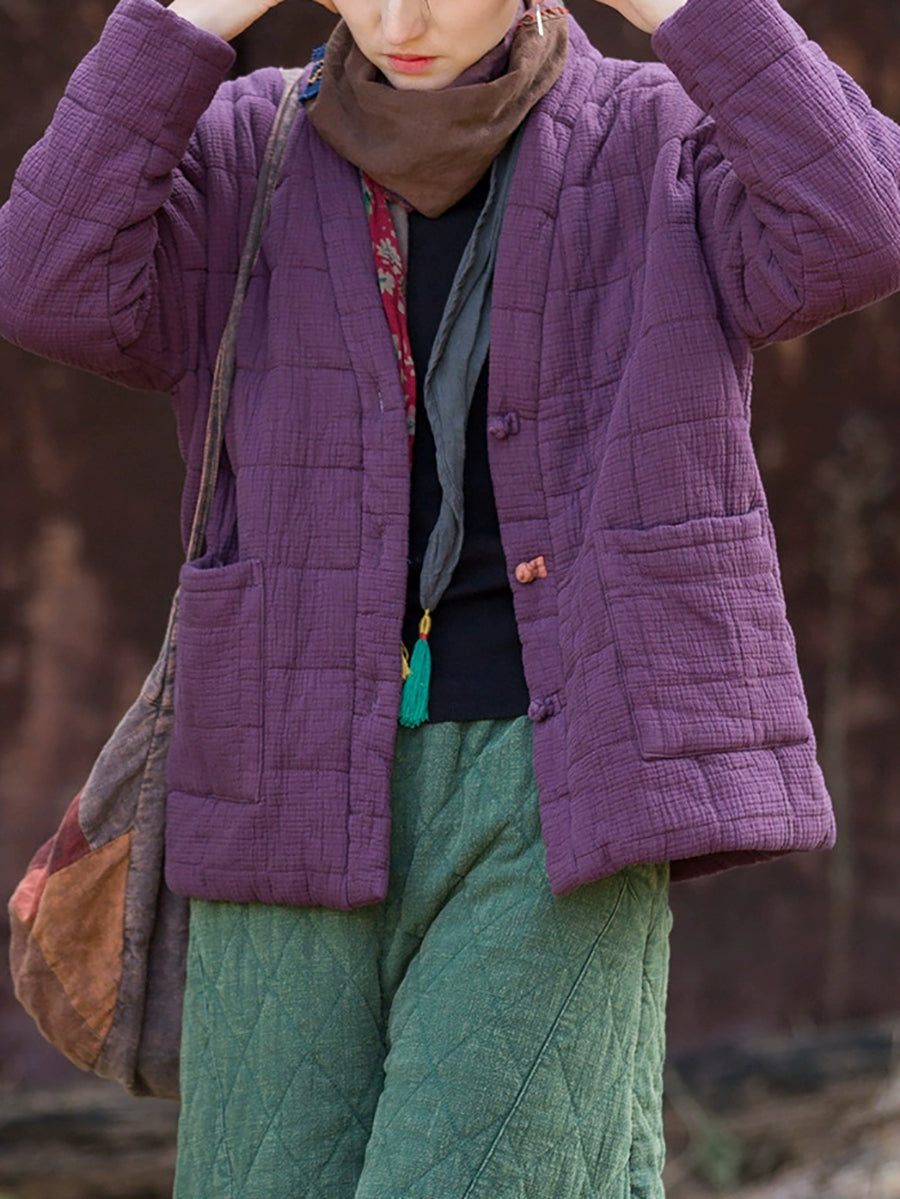 Abrigo de invierno para mujer, estilo retro, de algodón, color liso, acolchado, con cuello en V.