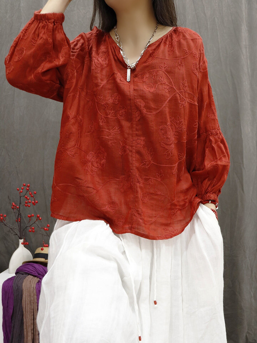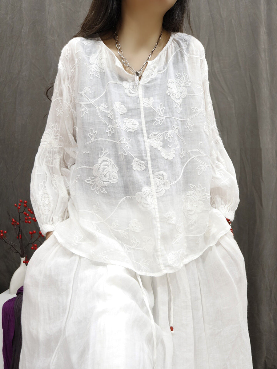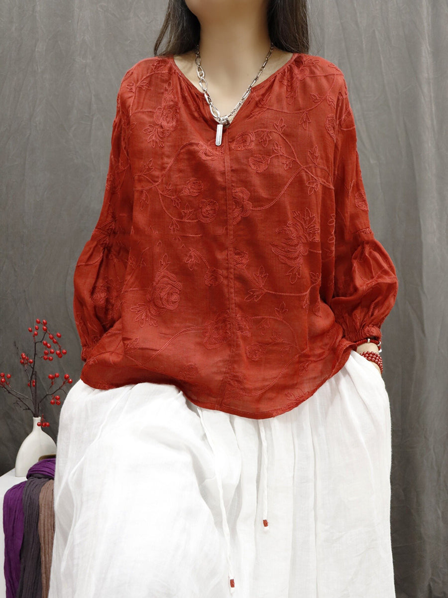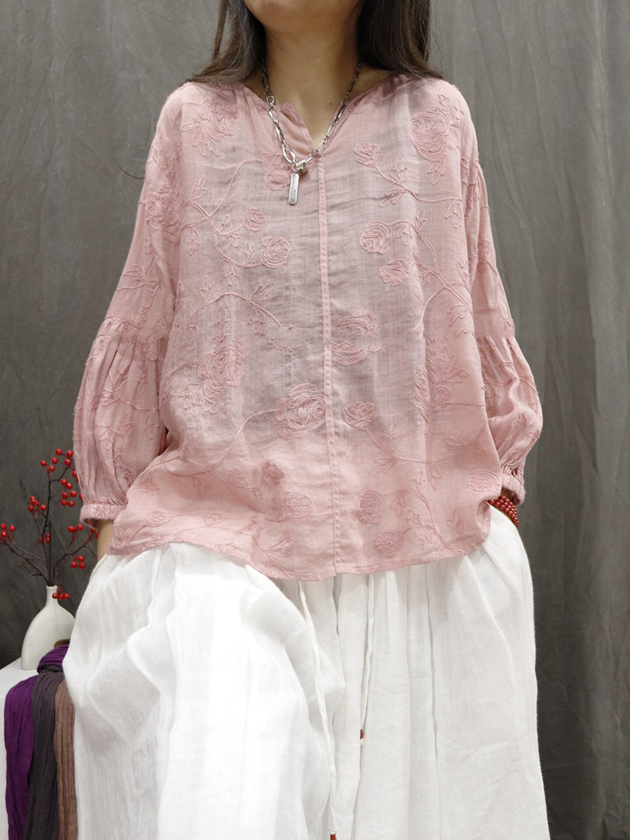 Blusa de verano para mujer con cuello en V y bordado, 100% ramio.