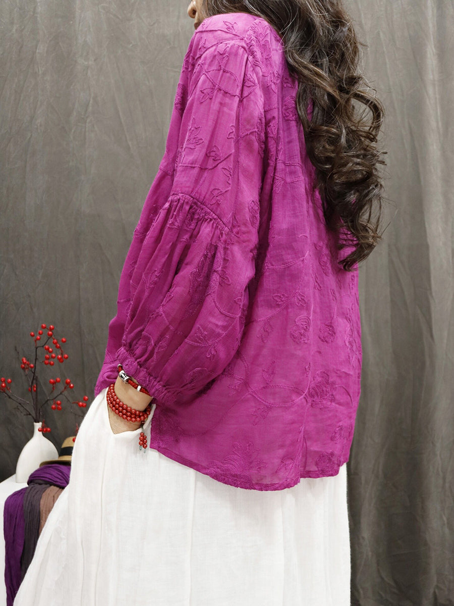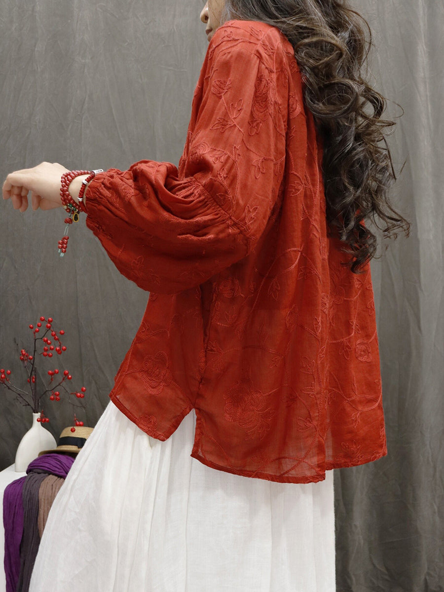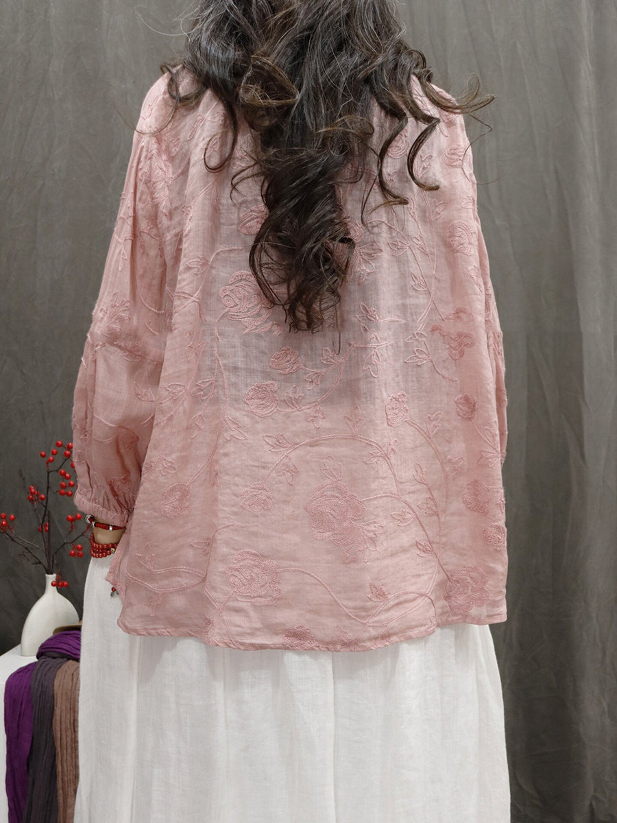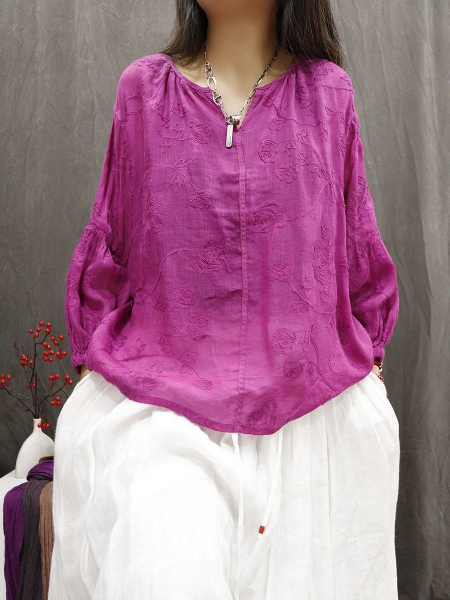 Blusa de verano para mujer con cuello en V y bordado, 100% ramio.
