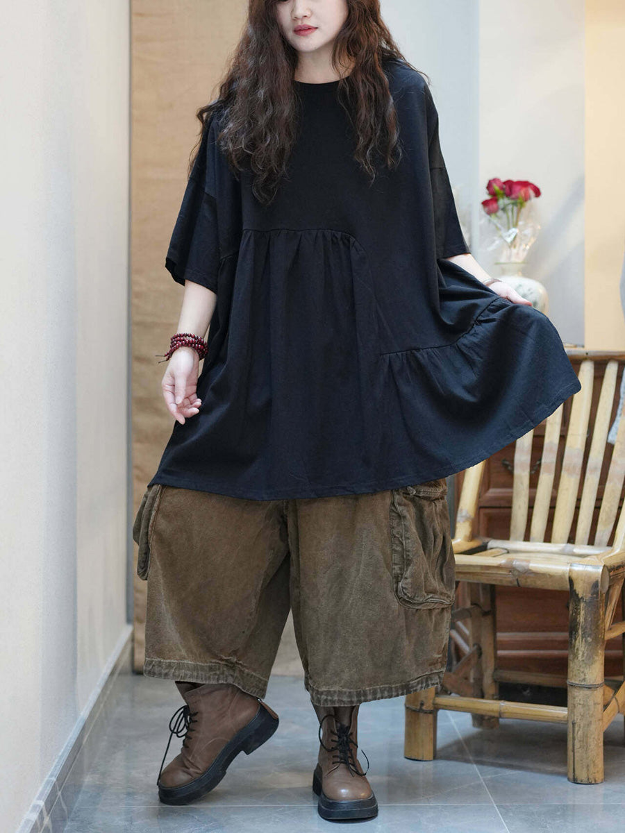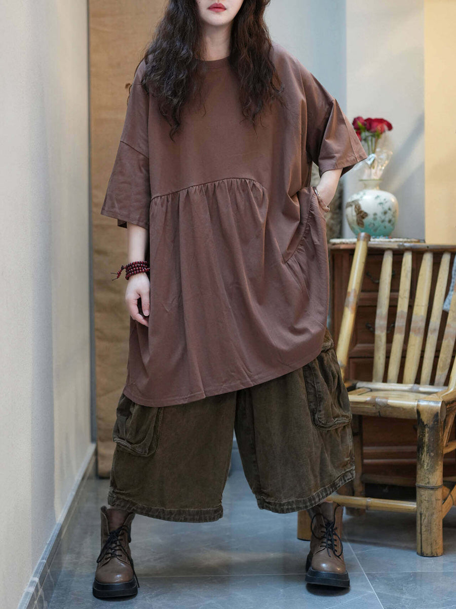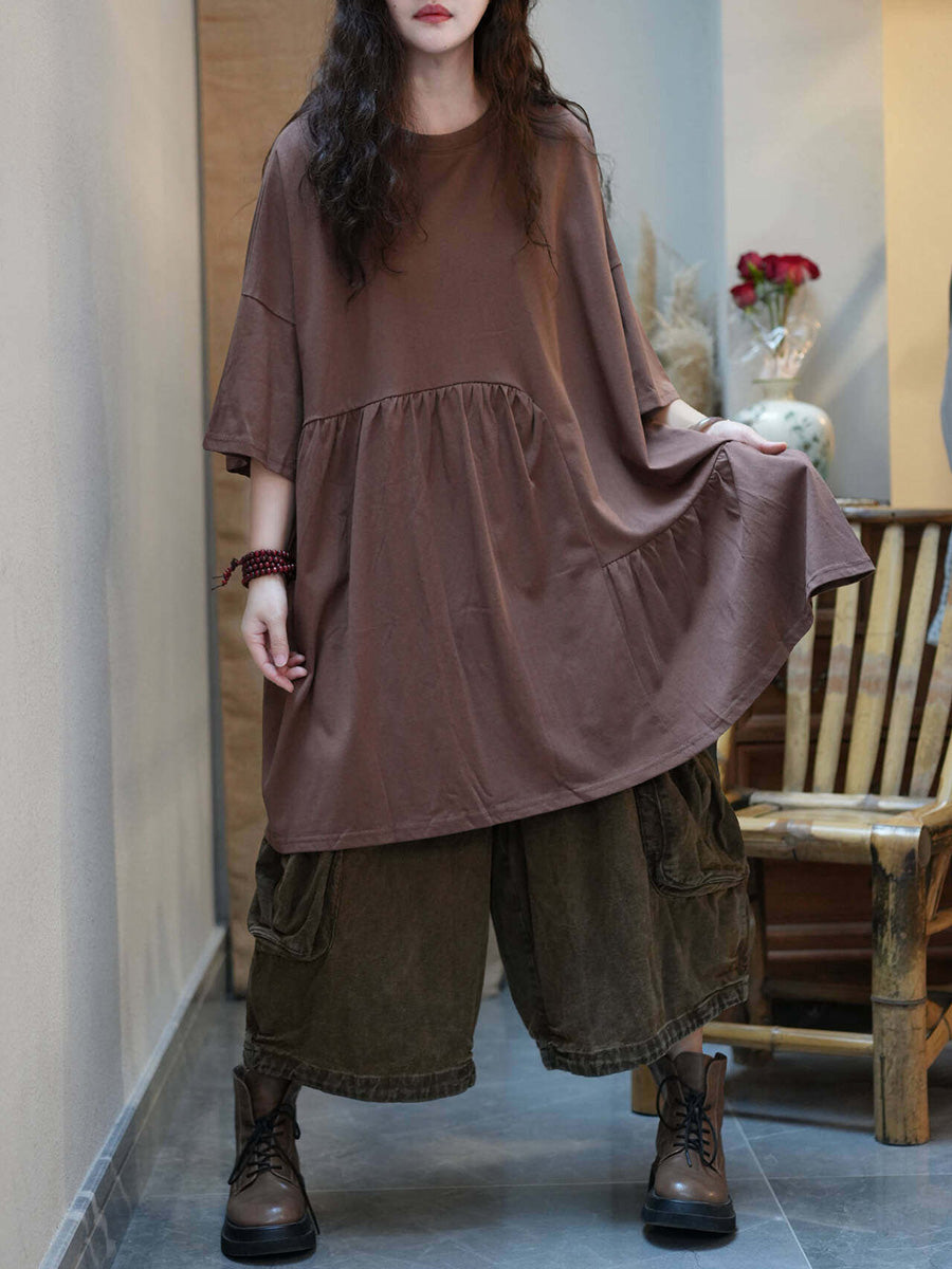 Camiseta informal de verano para mujer con cuello redondo fruncido