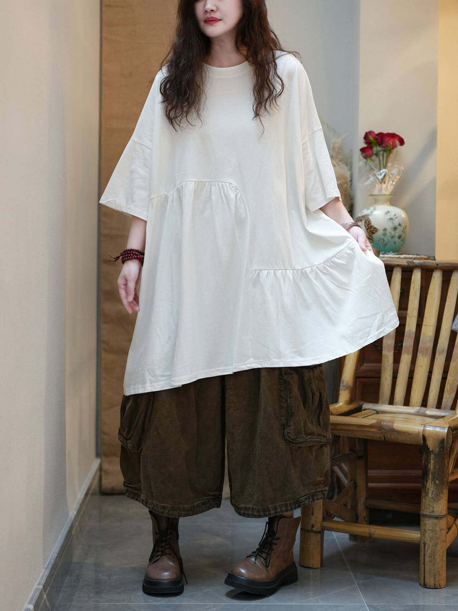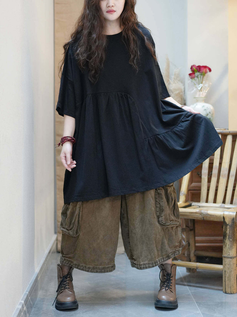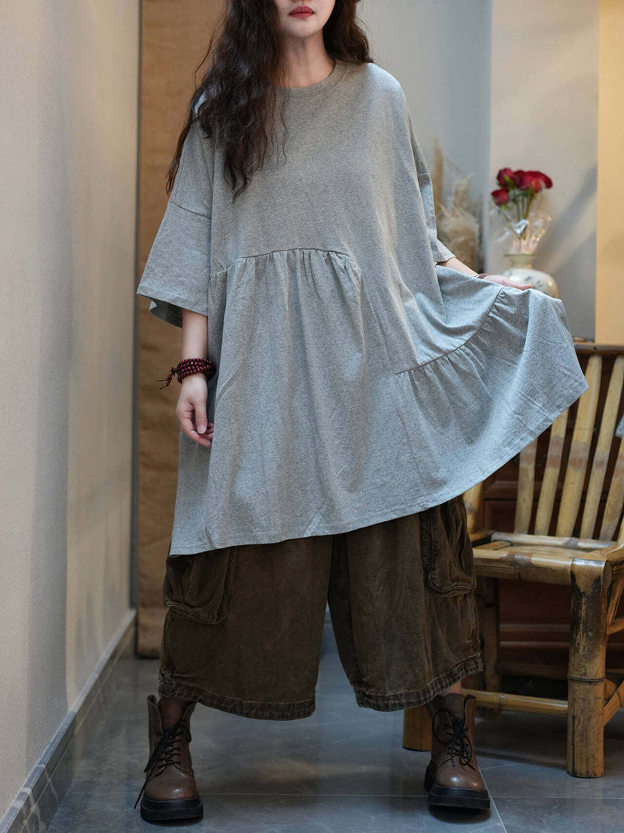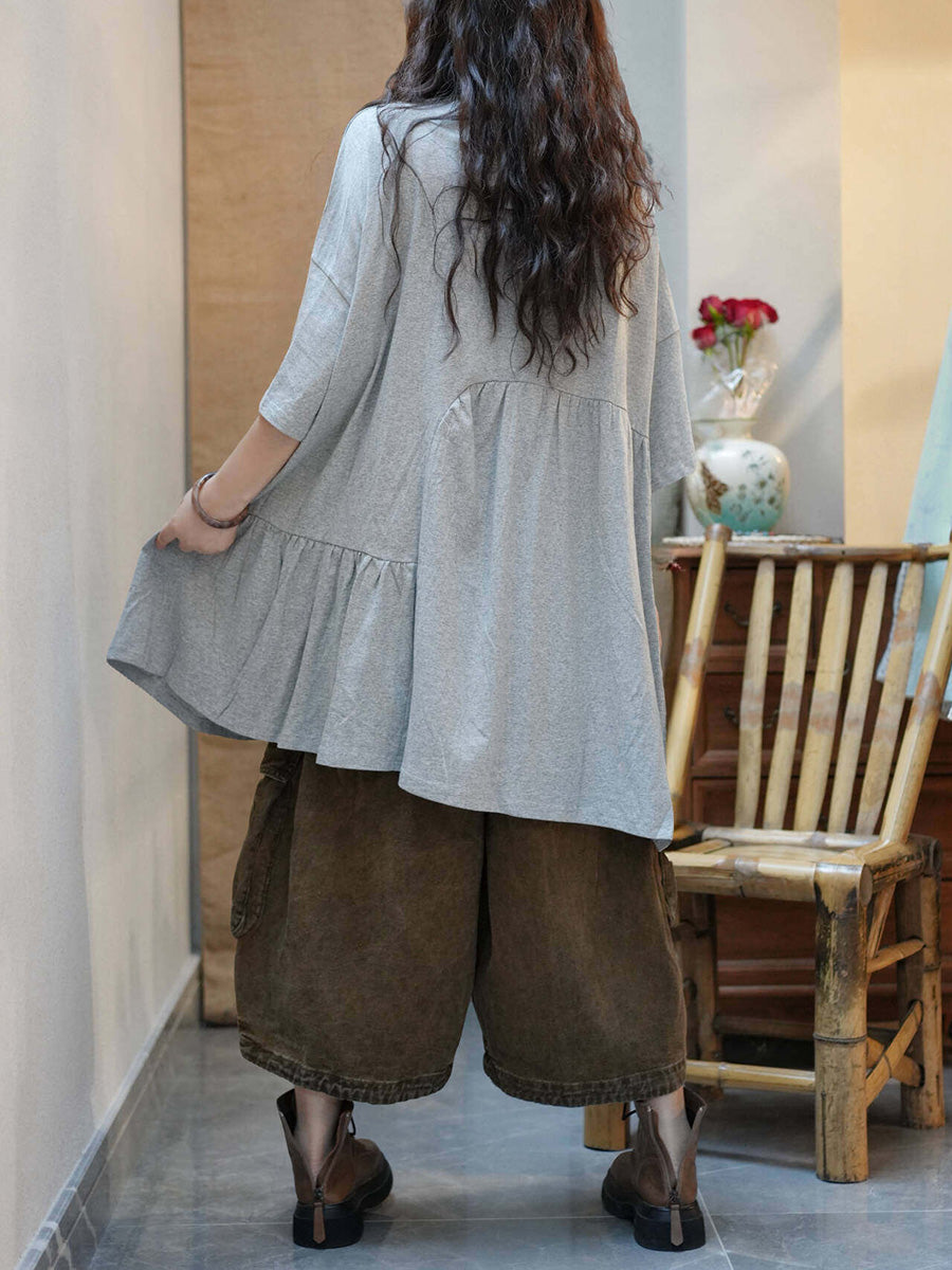 Camiseta informal de verano para mujer con cuello redondo fruncido