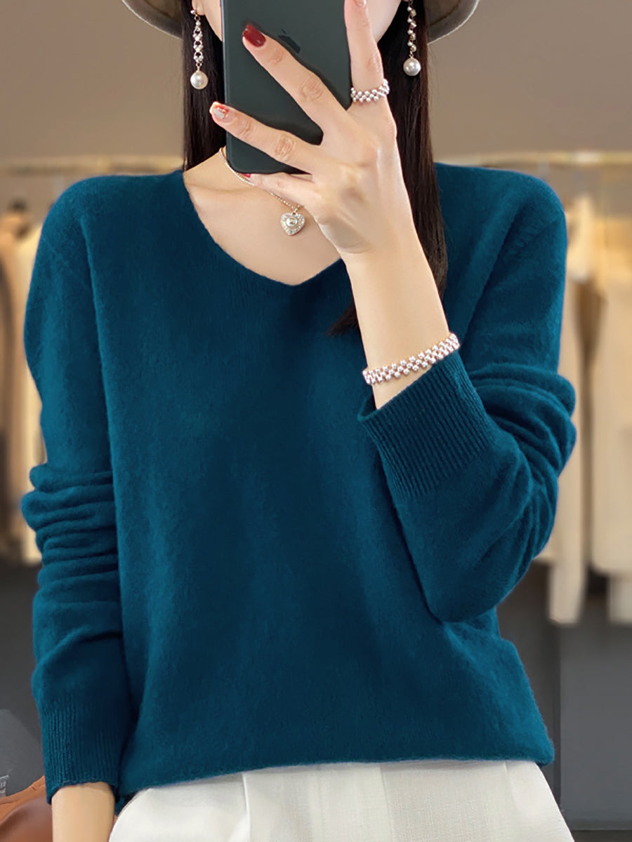 Suéter de punto con cuello en V y color puro para mujer de otoño