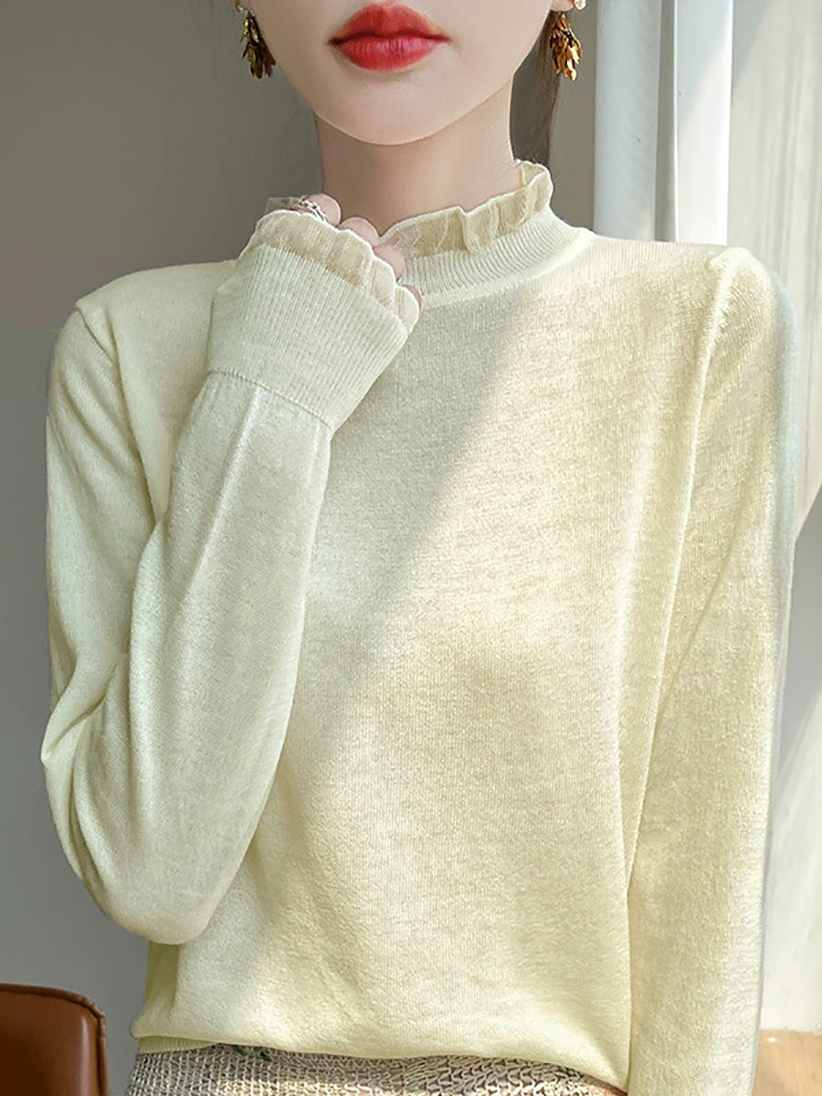 Suéter de invierno con cuello de encaje de color puro y artístico para mujer