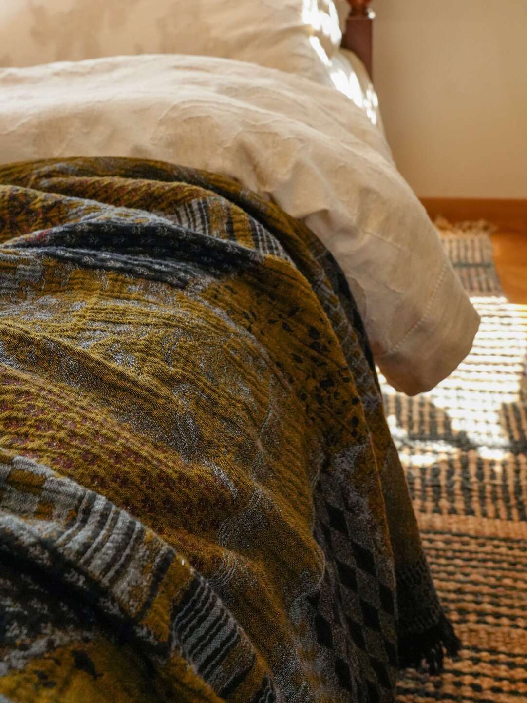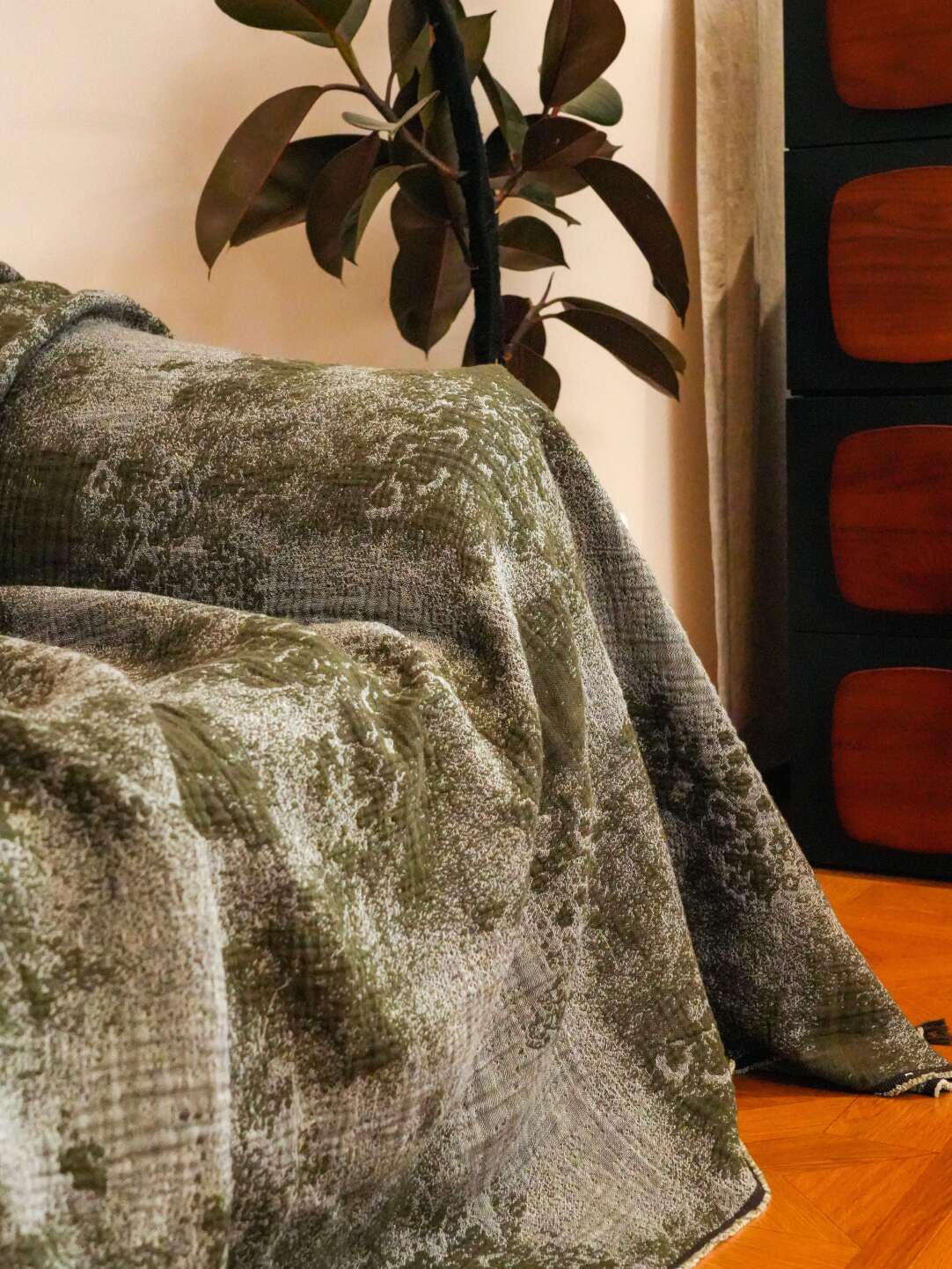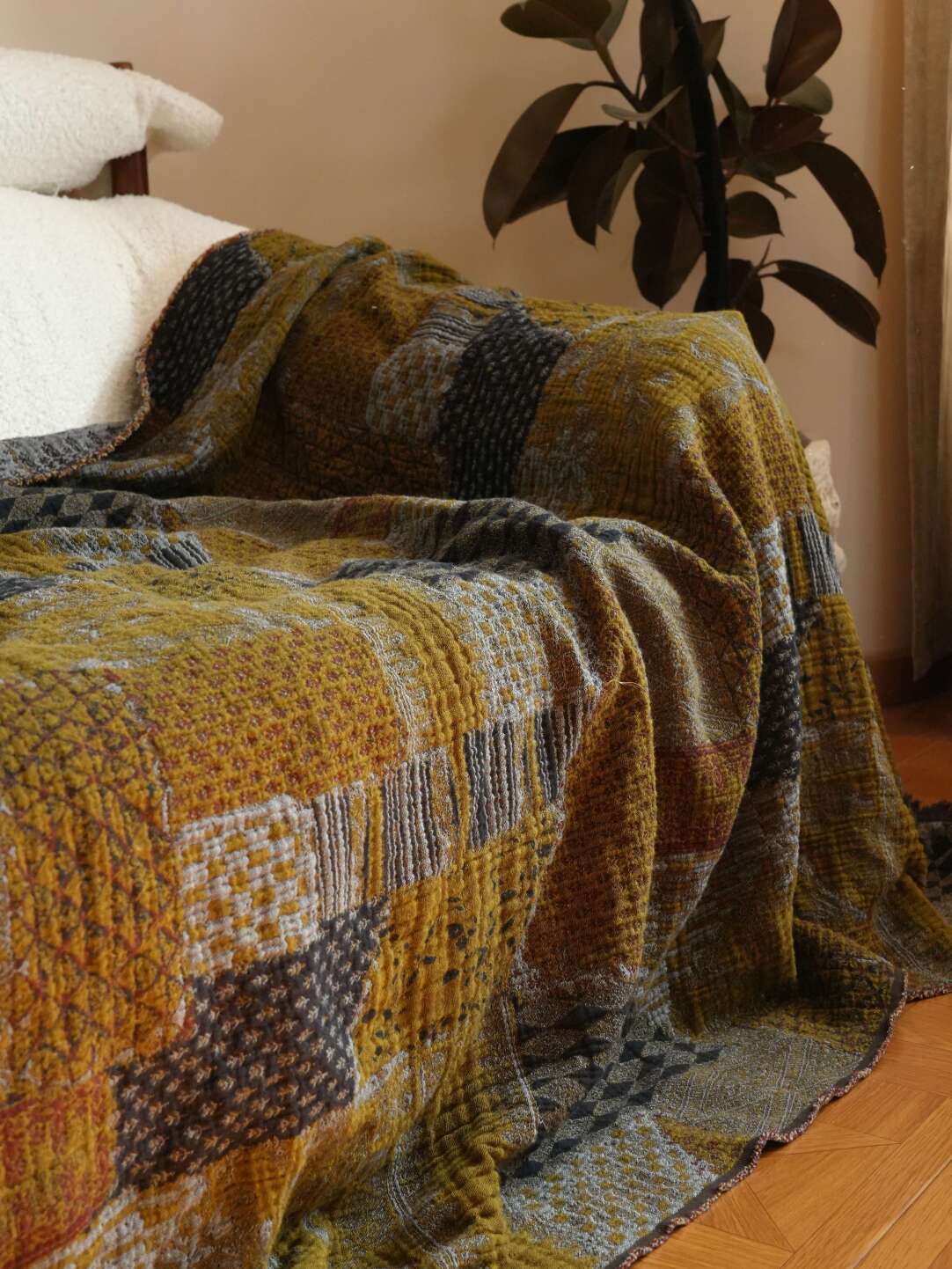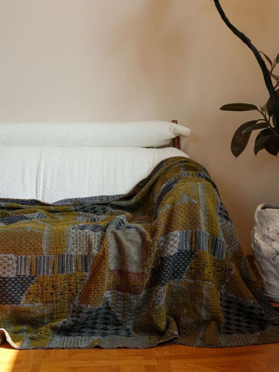 Manta de sofá retro de algodón y lino con retazos color mostaza oscuro.