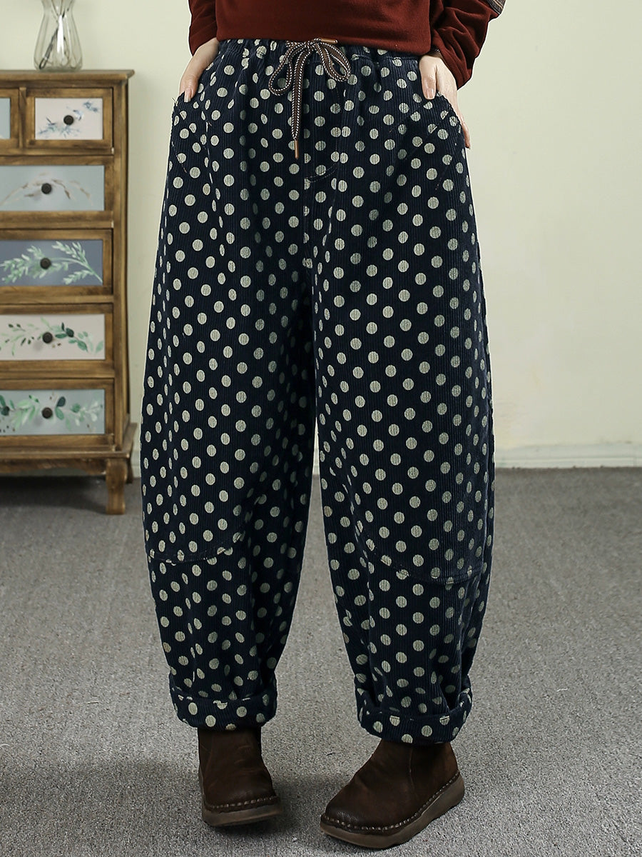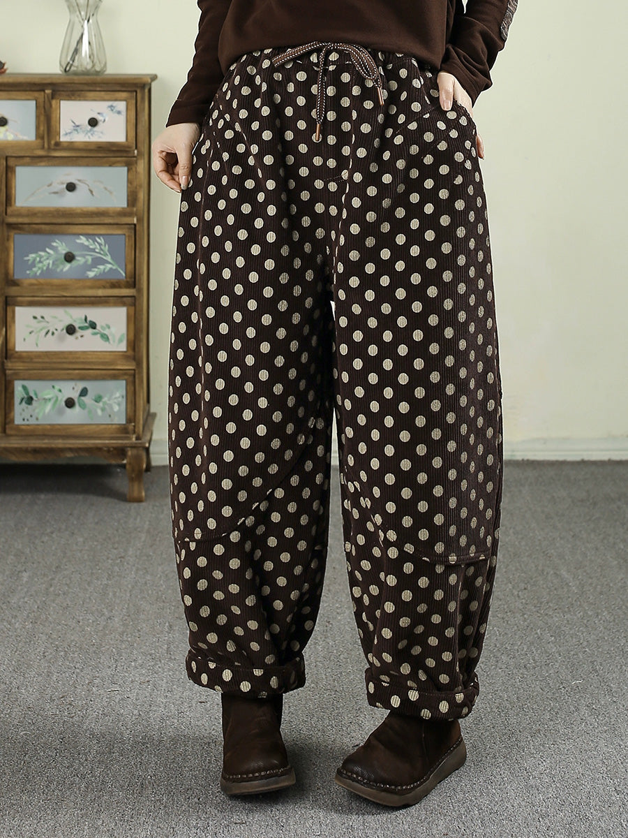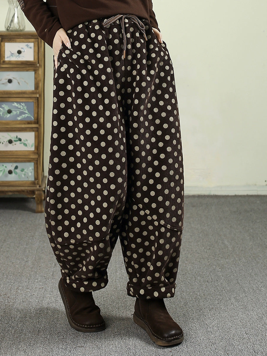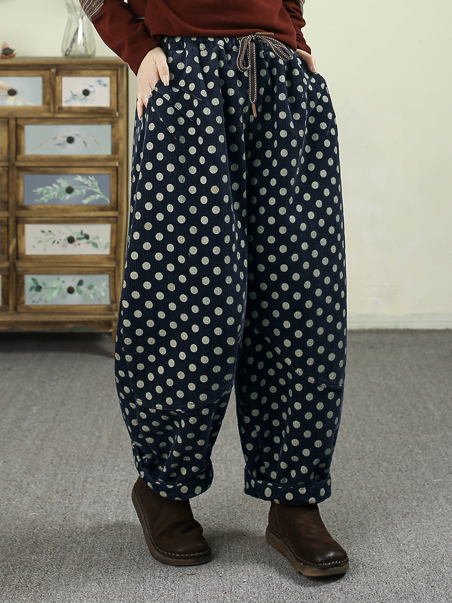 Pantalones tipo harem de pana con forro polar y lunares para mujer, ideales para el invierno.