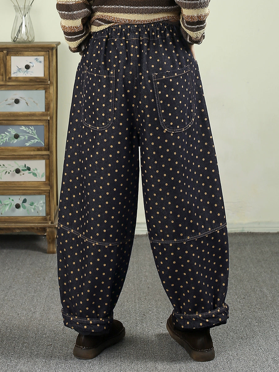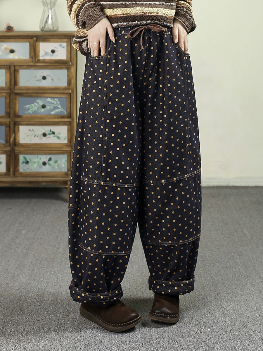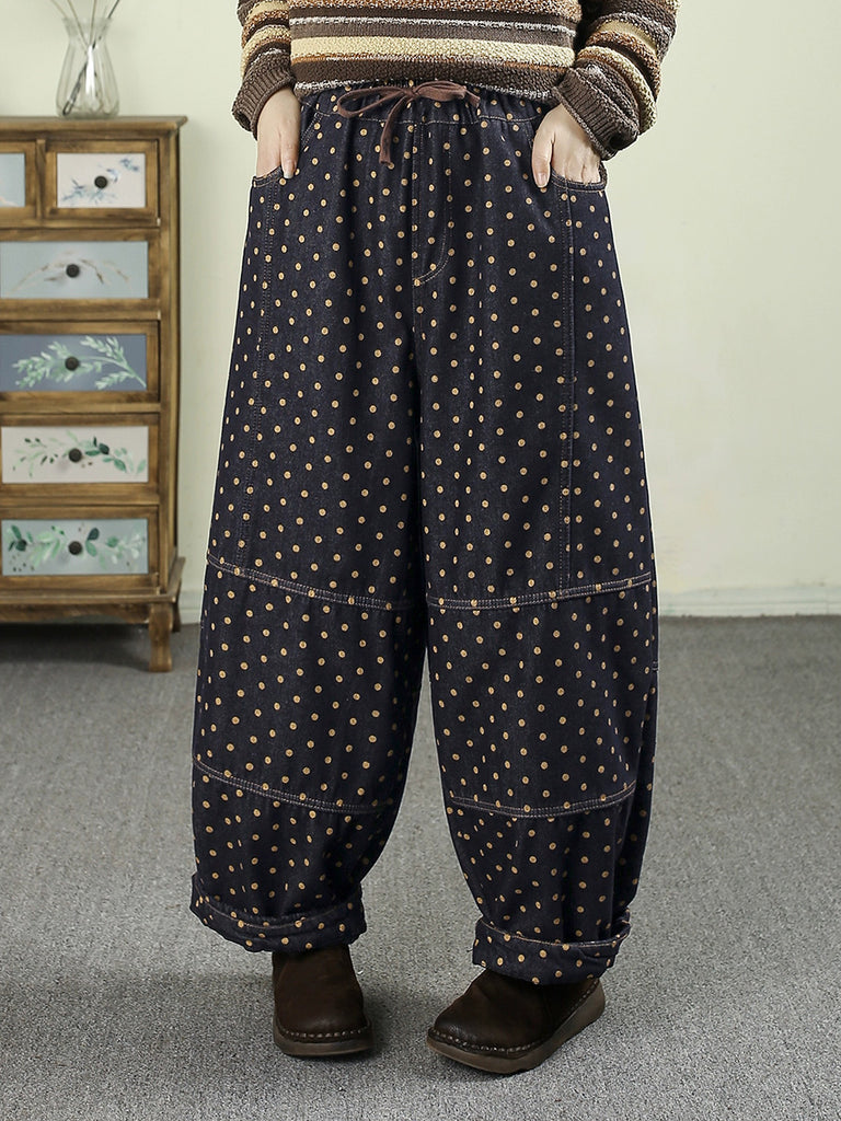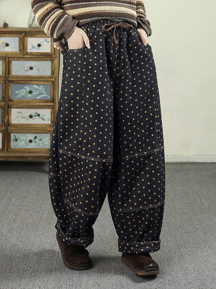 Pantalones bombachos vaqueros de invierno retro con lunares para mujer, con forro polar.