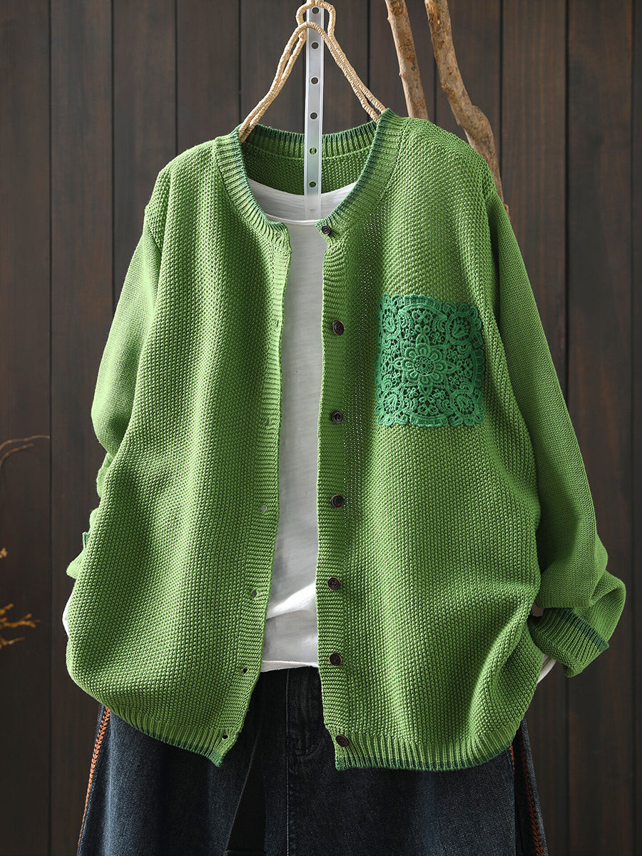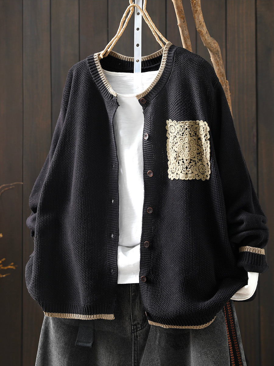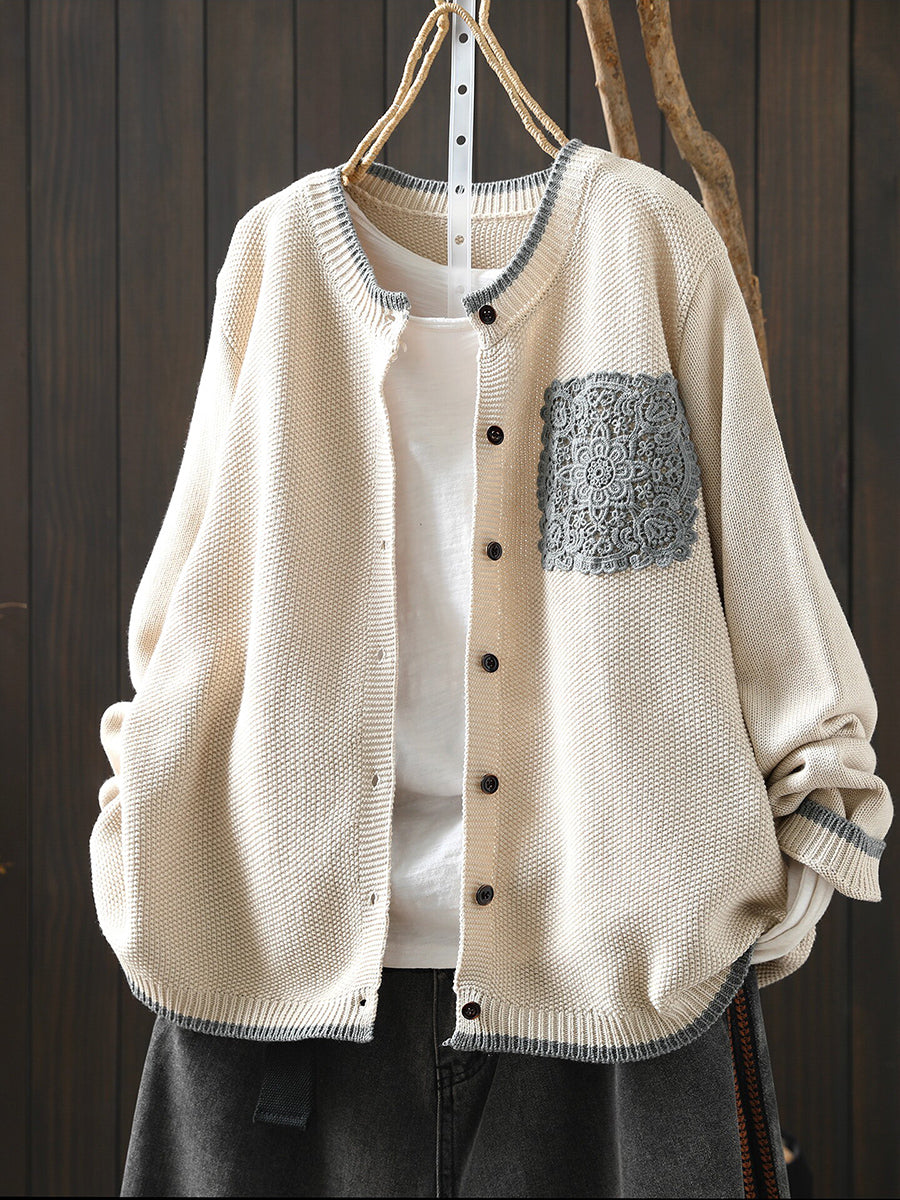 Cárdigan de algodón con parche de encaje artístico de primavera para mujer