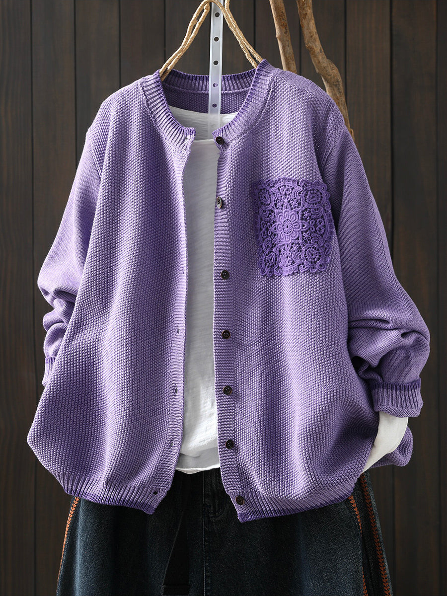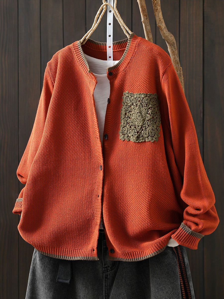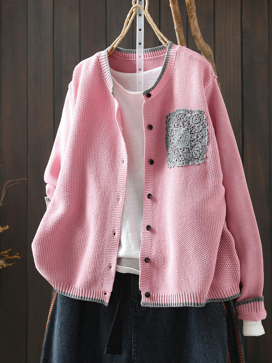 Cárdigan de algodón con parche de encaje artístico de primavera para mujer