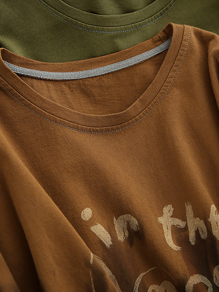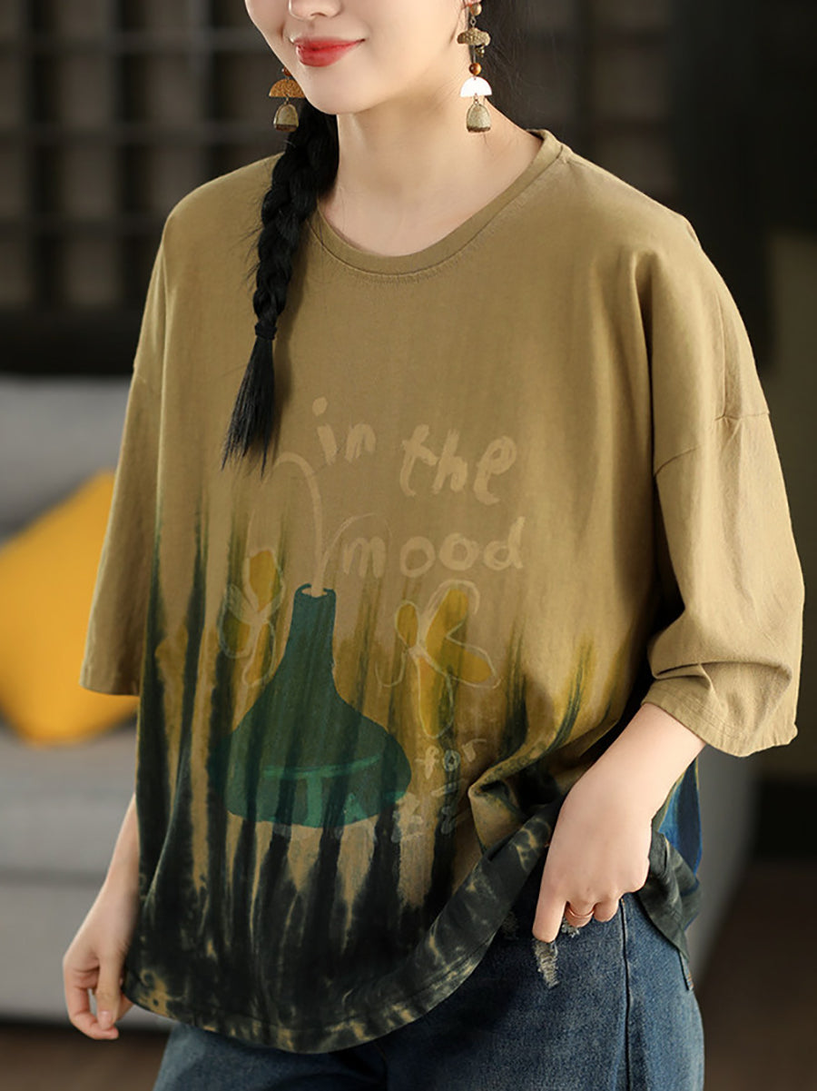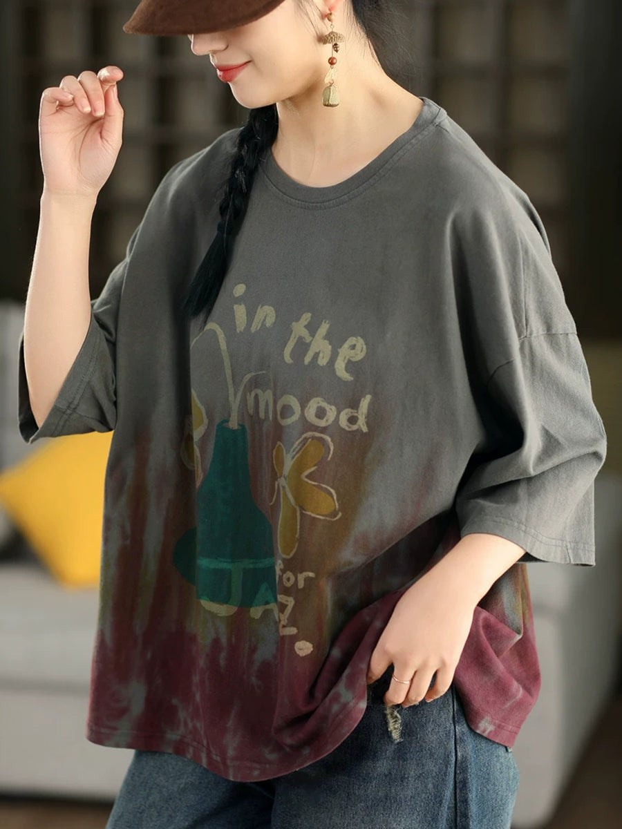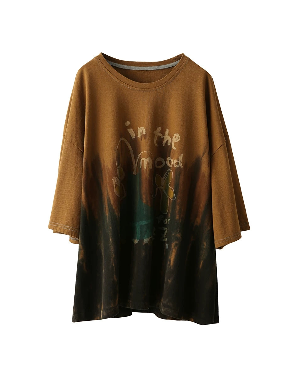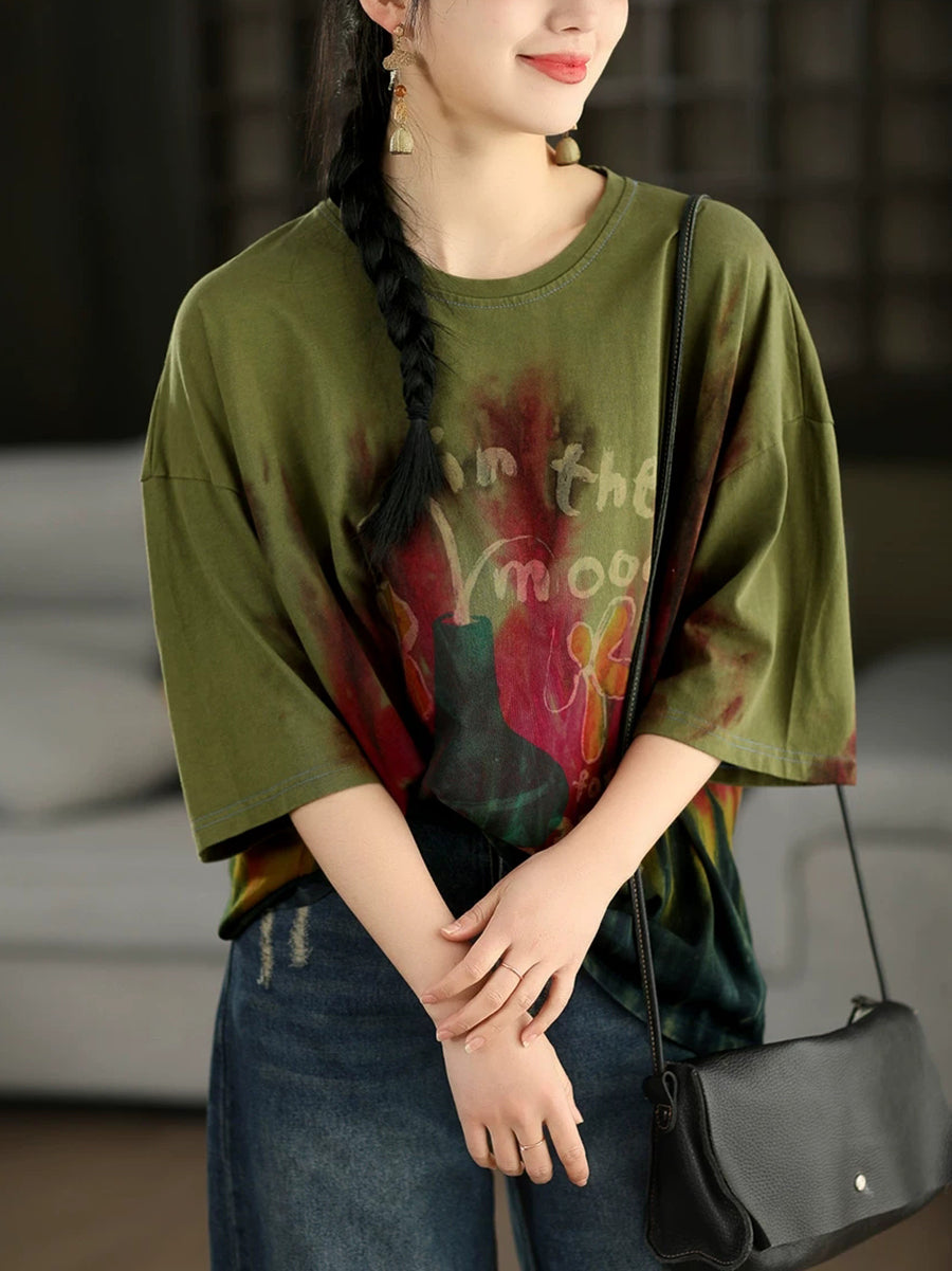 Camisa de verano para mujer con estampado tie-dye artístico y cuello redondo, 100% algodón.