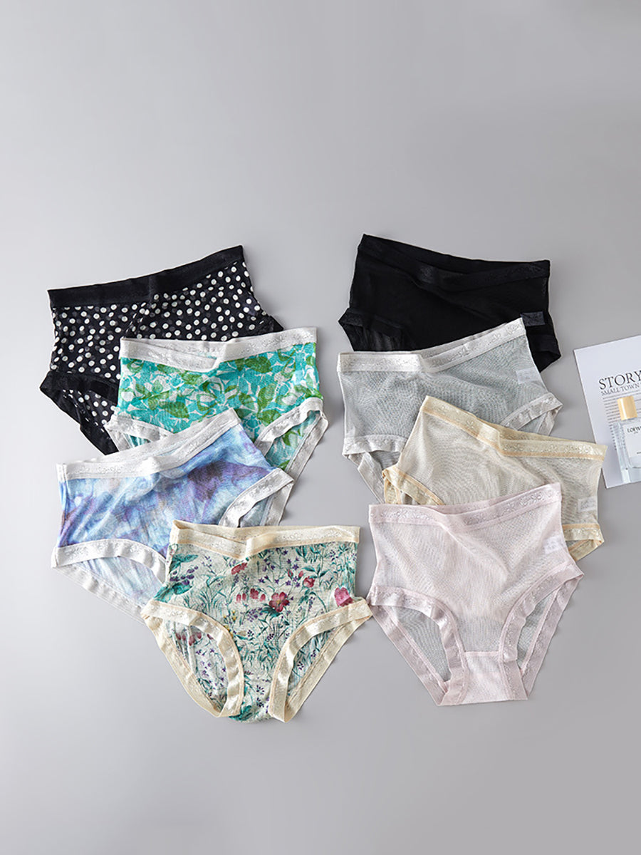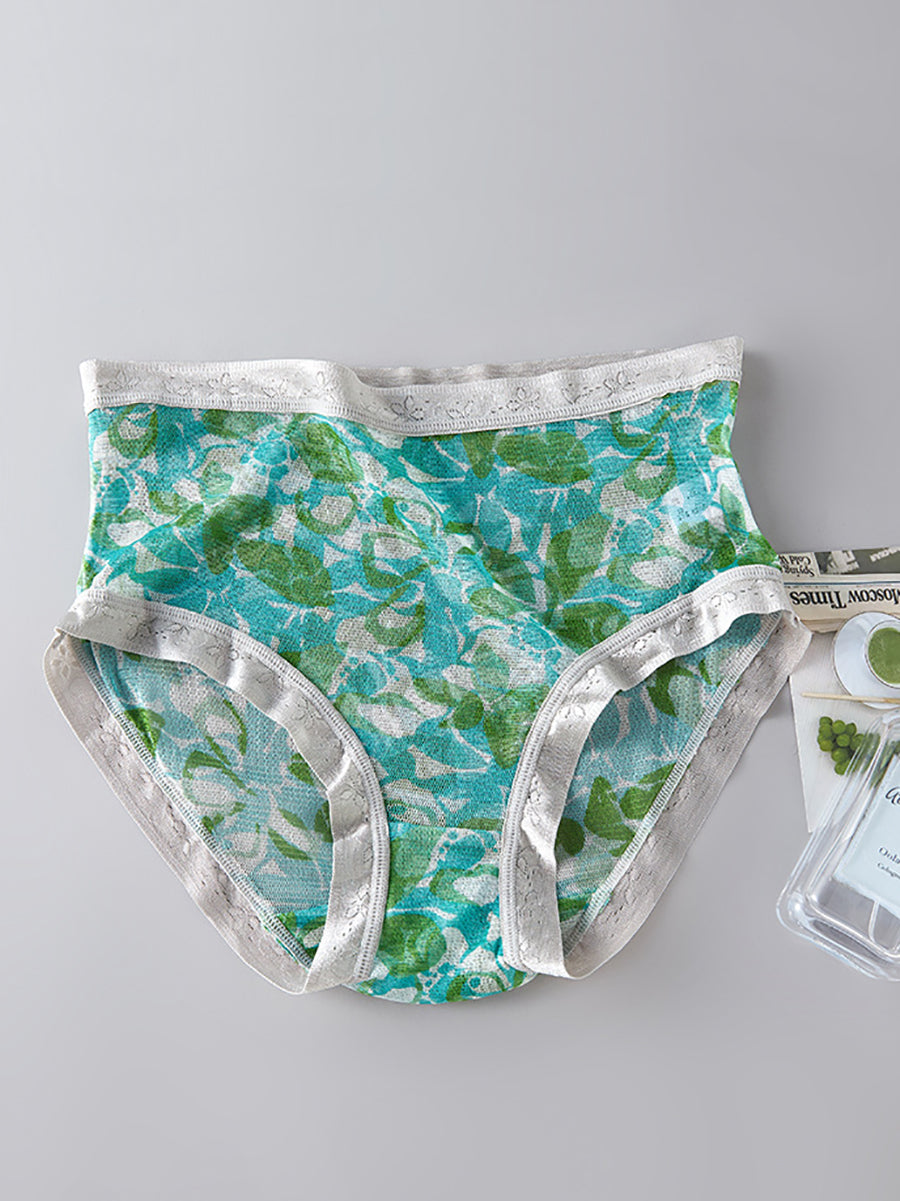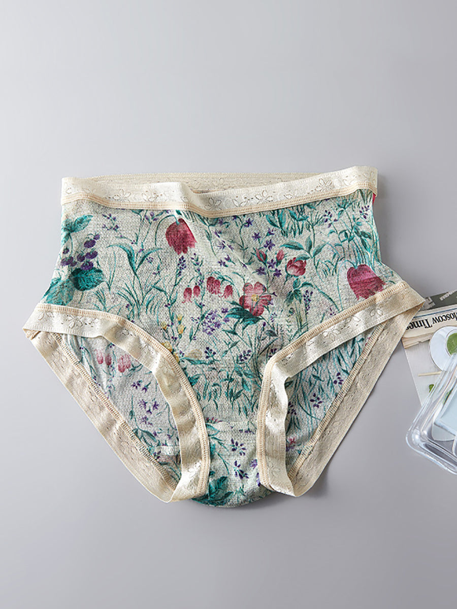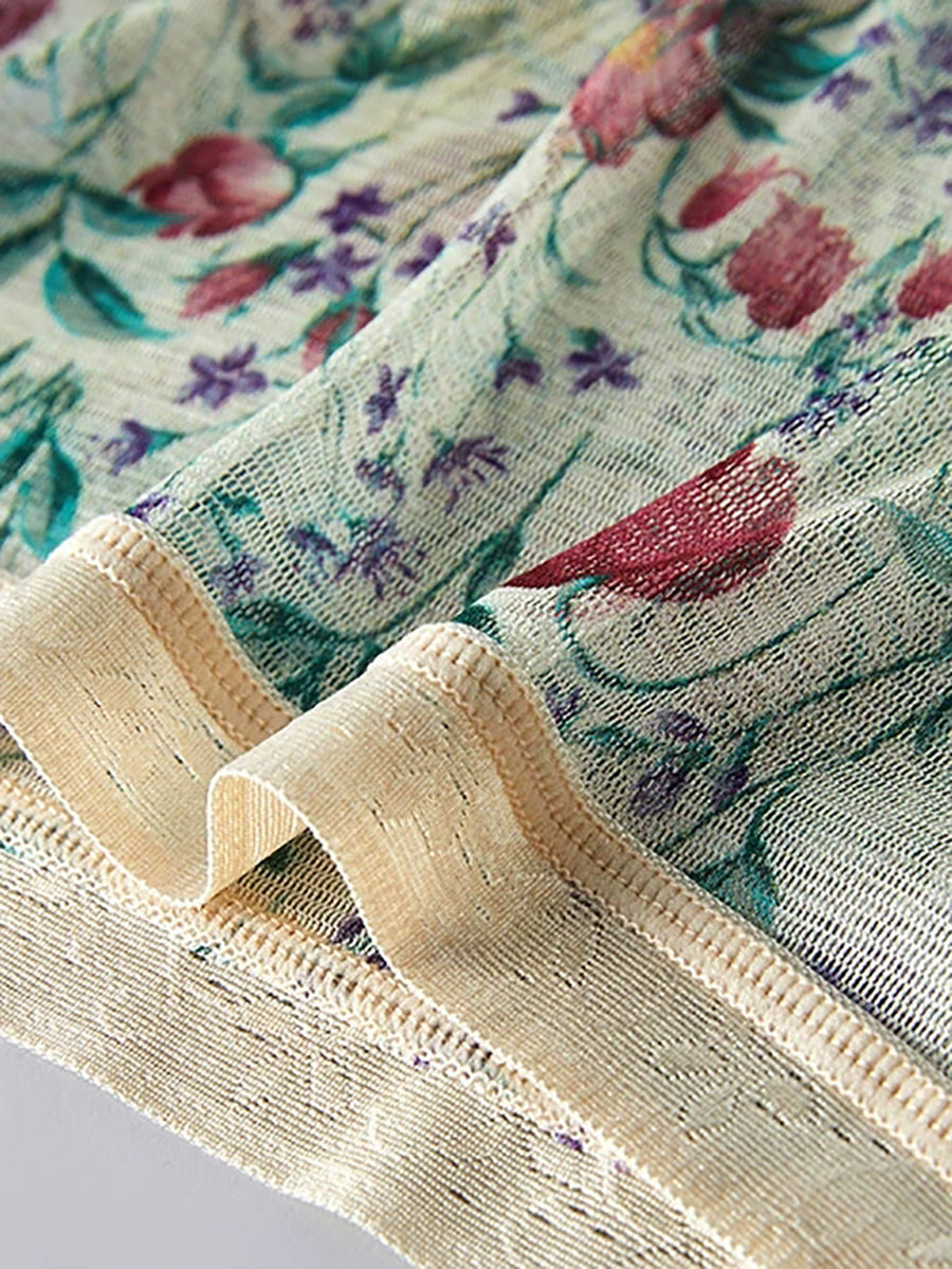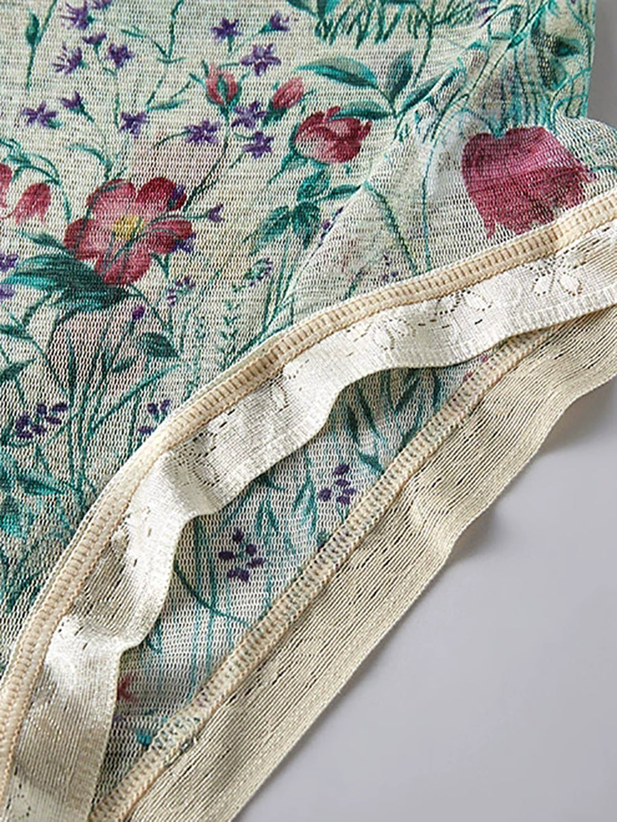 Ropa interior femenina de seda con estampado floral artístico.